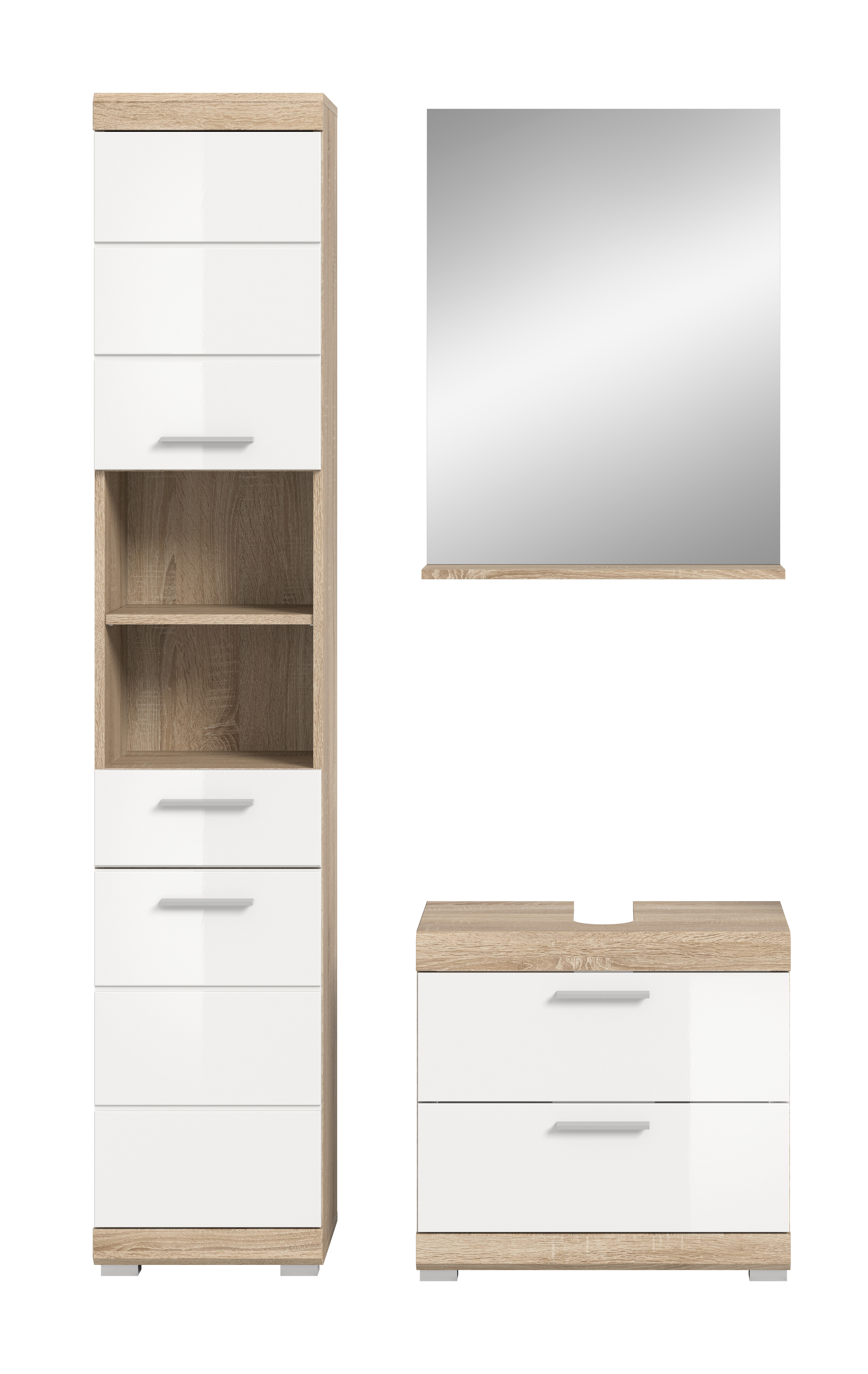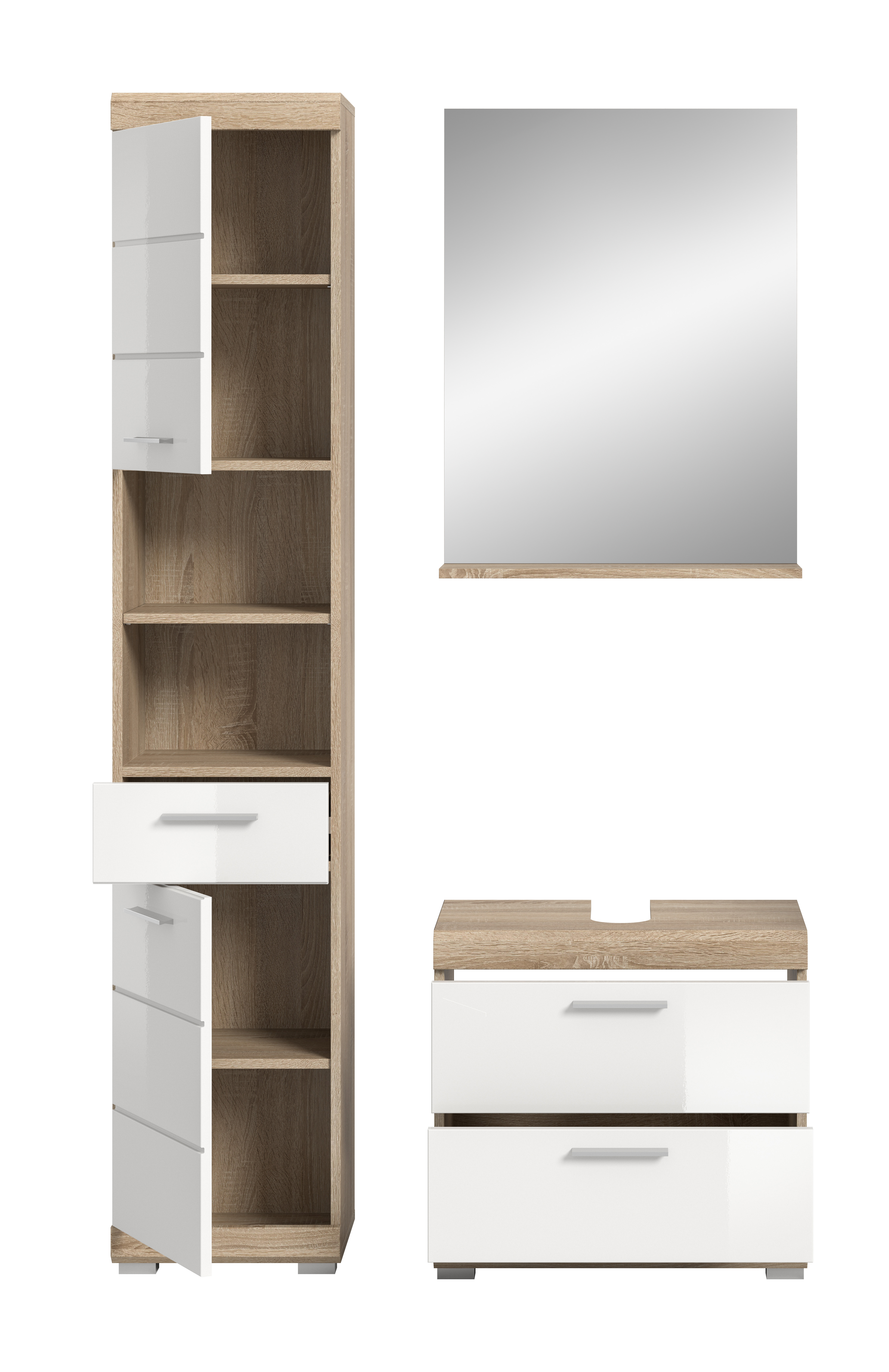 Entdecken Sie die perfekte Kombination aus Stil und Funktionalität für Ihr Badezimmer mit unserer Badkombination in Sonoma Eiche hell und weißem Hochglanz. Sie bietet bietet ausreichend Stauraum und verleiht Ihrem Raum einen modernen und ansprechenden Look. Tauchen Sie ein in zeitlose Eleganz und optimale Organisation mit diesem einzigartigen Möbelstück.