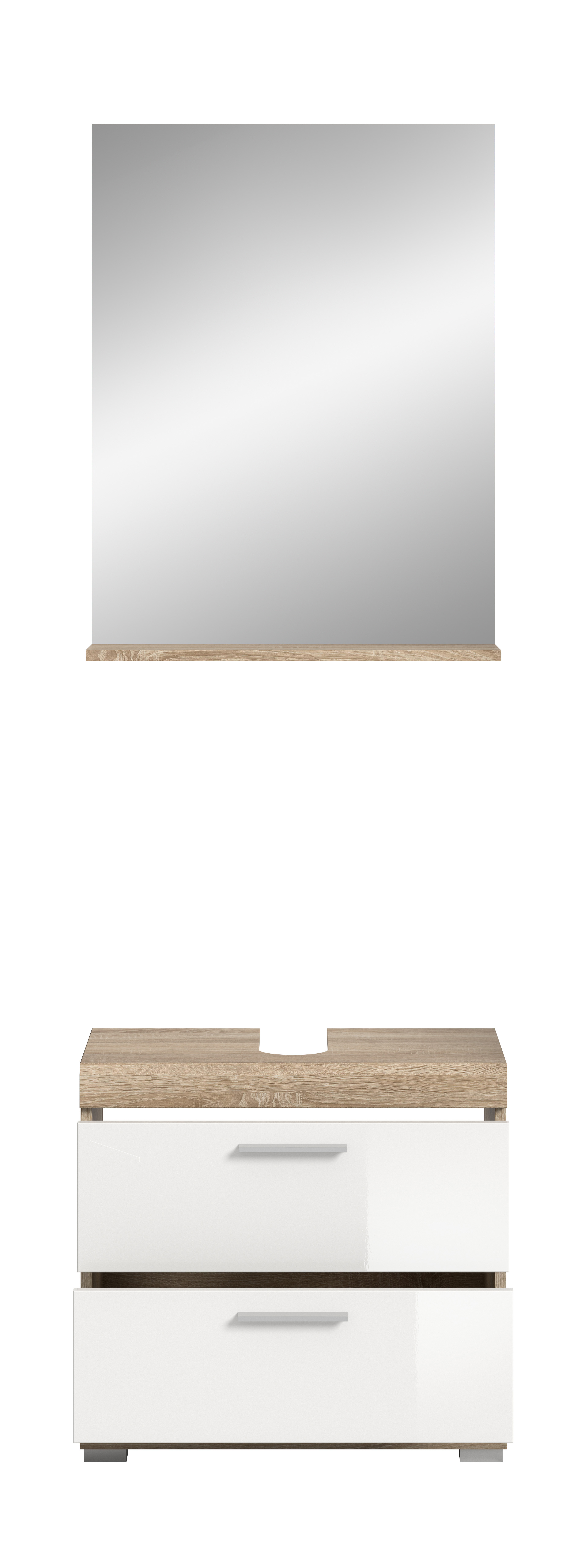 Entdecken Sie die perfekte Kombination aus Stil und Funktionalität für Ihr Badezimmer mit unserer Badkombination in Sonoma Eiche hell und weißem Hochglanz. Sie bietet bietet ausreichend Stauraum und verleiht Ihrem Raum einen modernen und ansprechenden Look. Tauchen Sie ein in zeitlose Eleganz und optimale Organisation mit diesem einzigartigen Möbelstück.