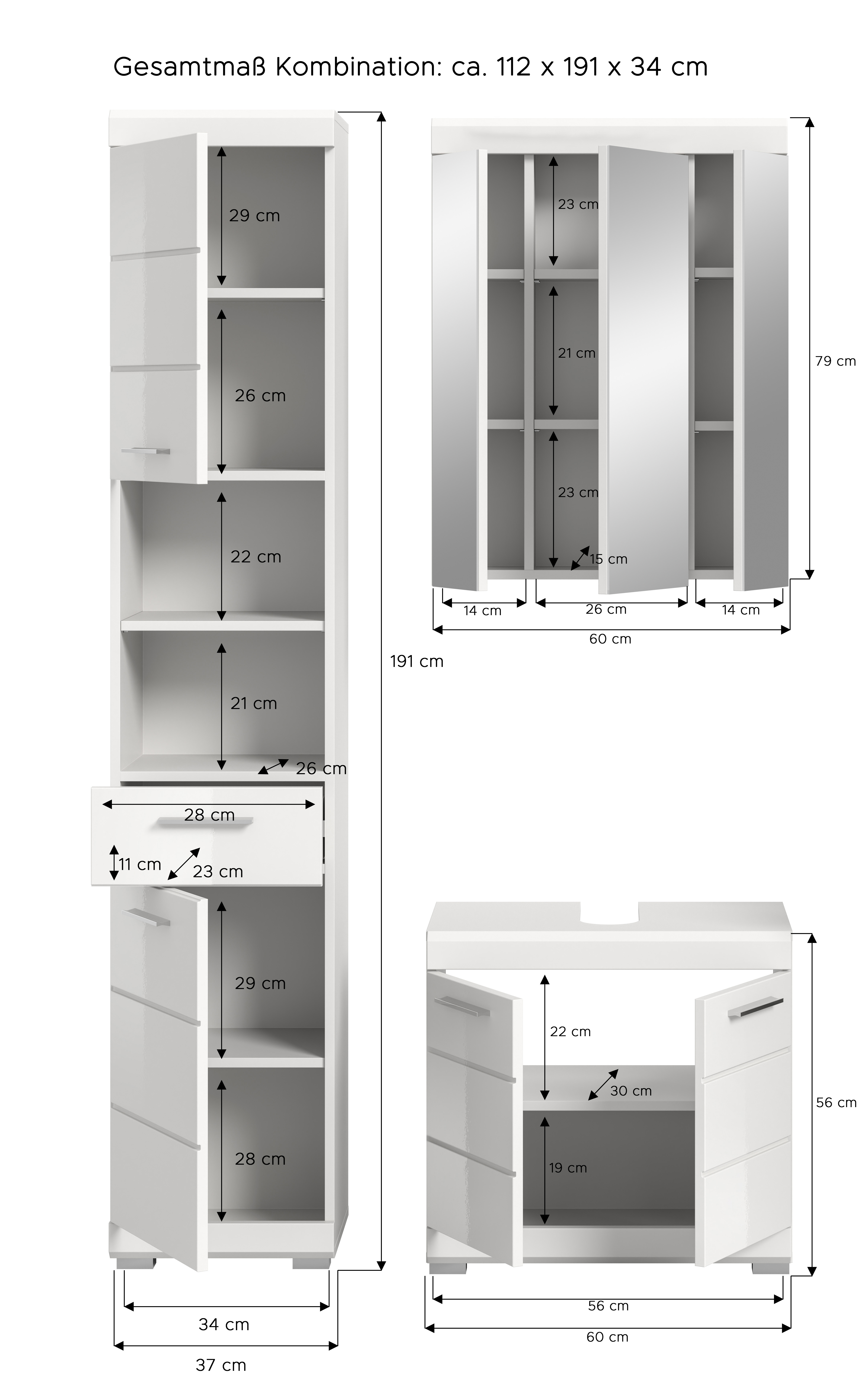 - Einsatzbereich: Die Badkombination ist vielseitig einsetzbar und eignet sich perfekt für Badezimmer oder Hauswirtschaftsräume, um Stauraum zu schaffen und gleichzeitig das Erscheinungsbild des Raumes zu verbessern.