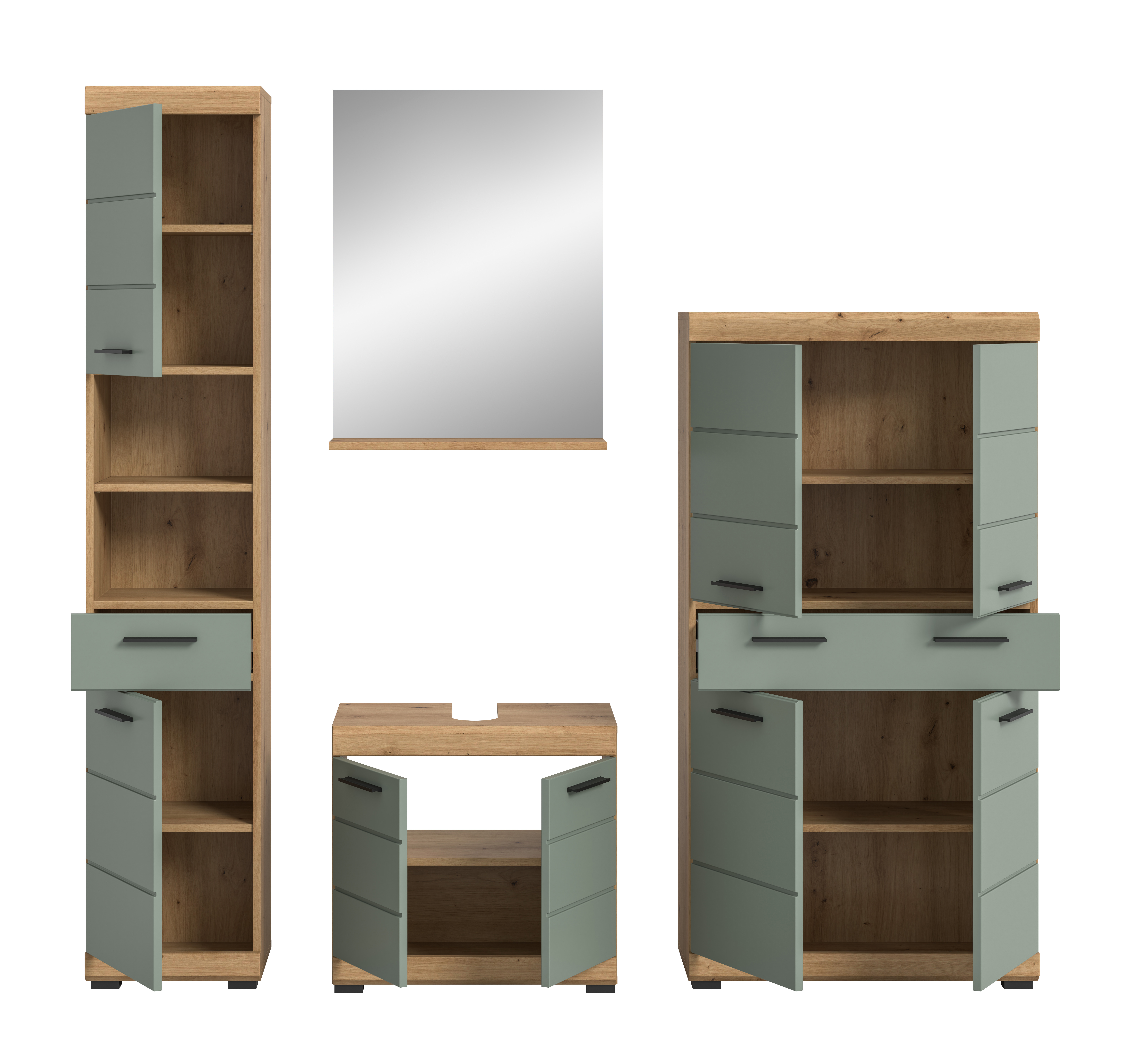 Verleihe deinem Badezimmer den ultimativen Style mit unserer Badkombination in angesagtem Salbei Nachbildung und Artisan Eiche Nachbildung. Mit ihrem trendigen Design und der hochwertigen Verarbeitung setzt sie ein modernes Statement in deinem Zuhause. Entdecke jetzt die perfekte Verbindung von Coolness und Funktionalität für dein Badezimmer!