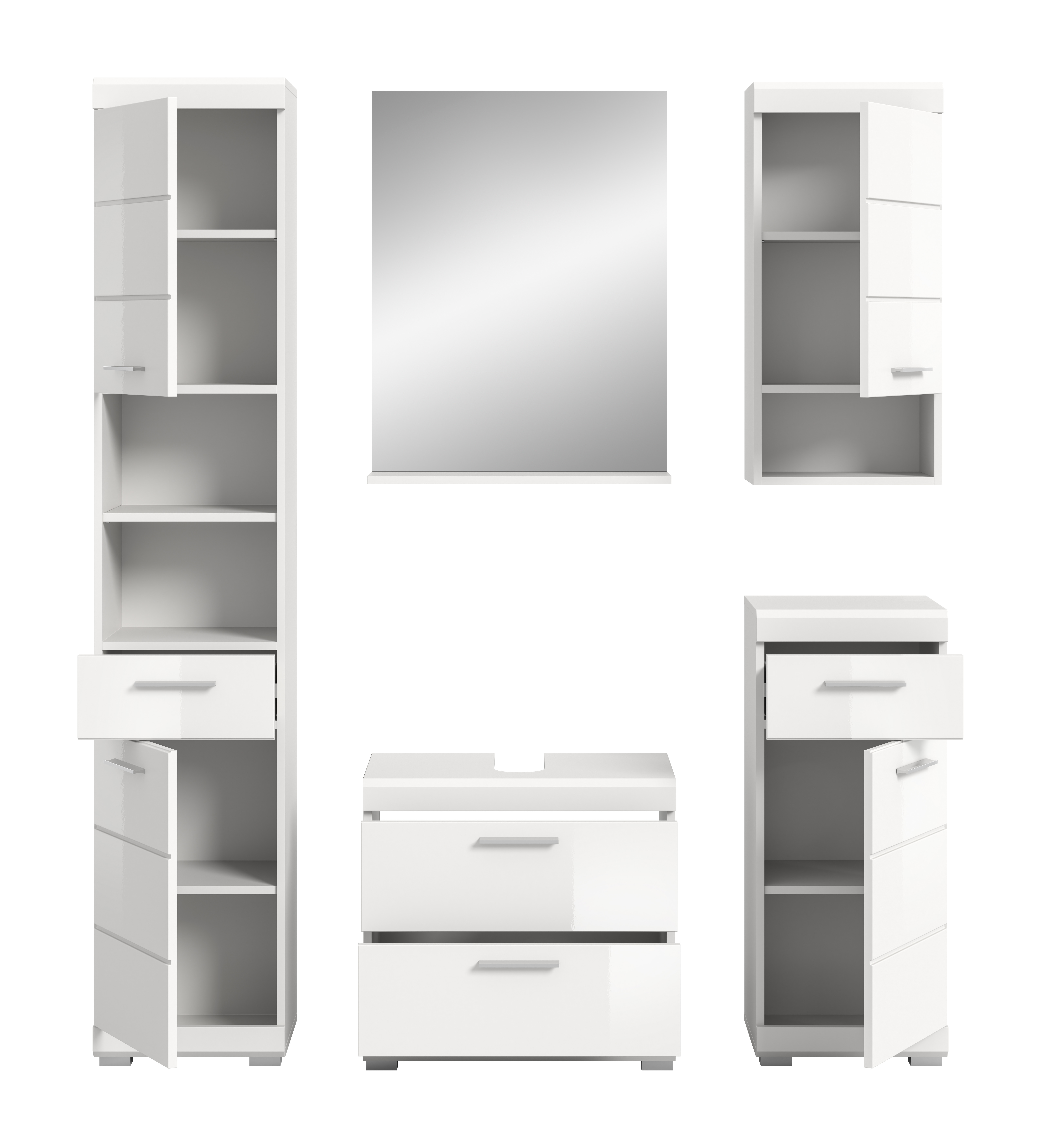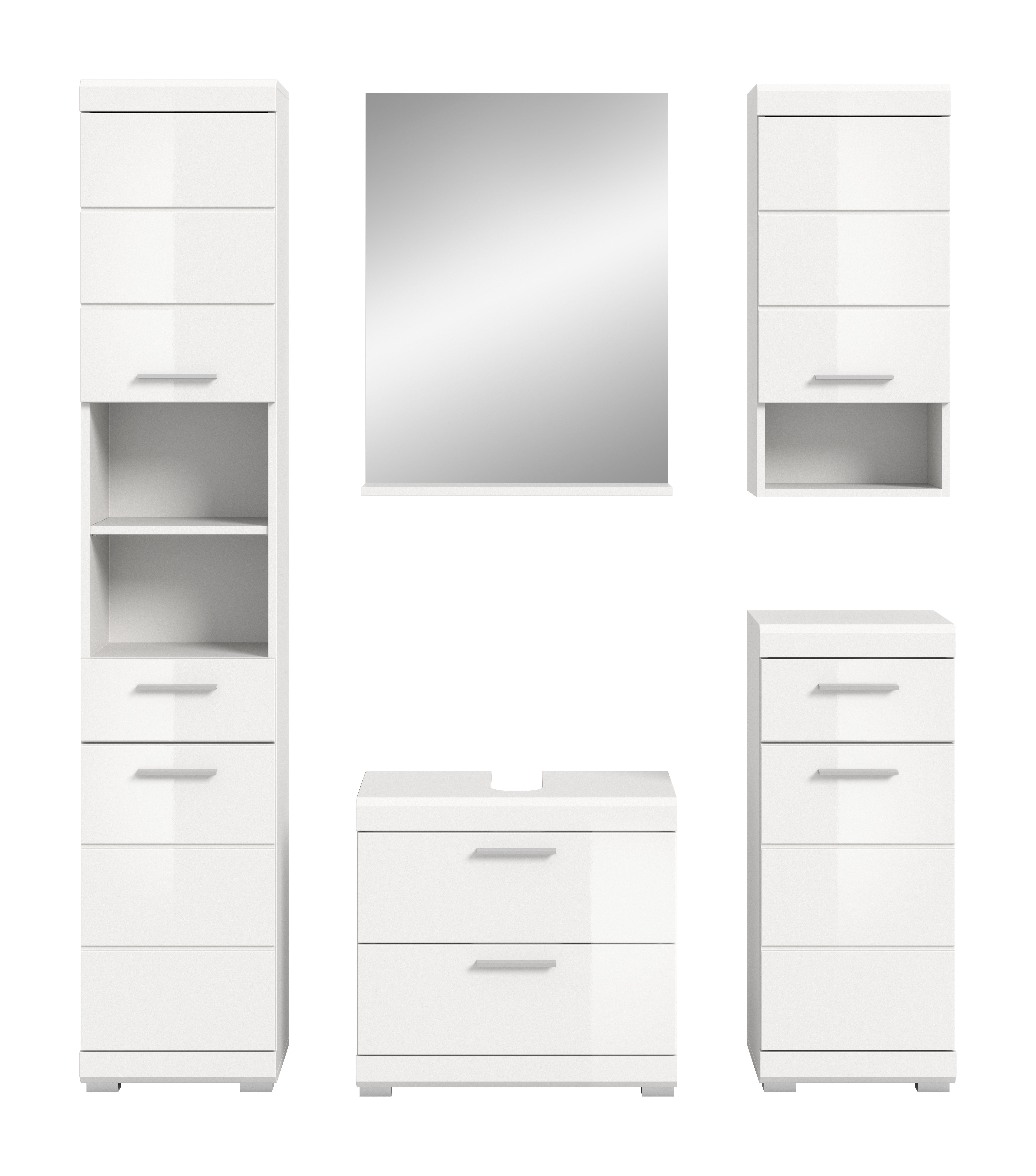 Verleihe deinem Badezimmer den ultimativen Style mit unserer Badkombination in angesagtem weiß Nachbildung und weißem Hochglanz tiefgezogenem Finish. Mit ihrem trendigen Design und der hochwertigen Verarbeitung setzt sie ein modernes Statement in deinem Zuhause. Entdecke jetzt die perfekte Verbindung von Coolness und Funktionalität für dein Badezimmer!