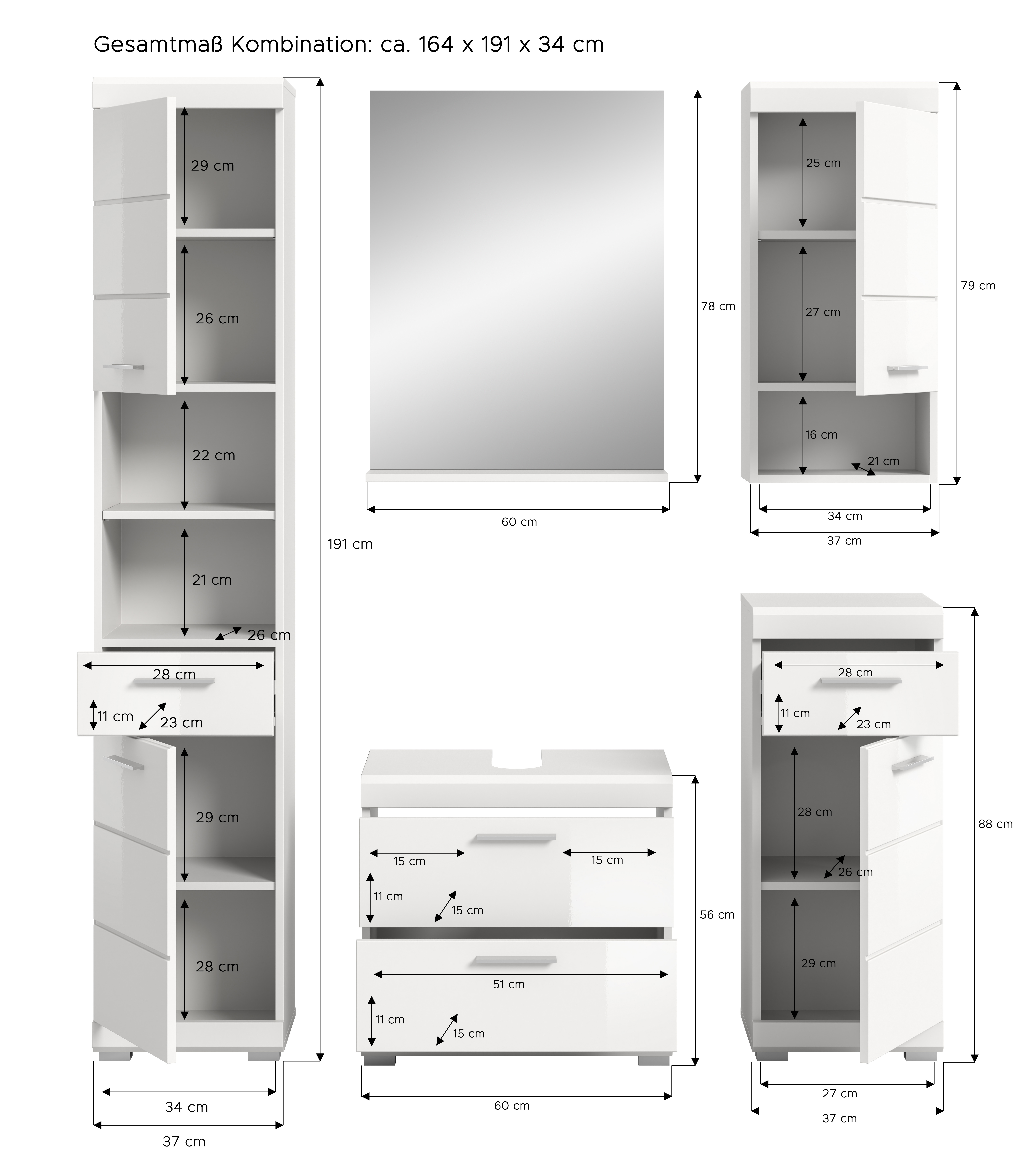 - Einsatzbereich: Die Badkombination ist vielseitig einsetzbar und eignet sich perfekt für Badezimmer oder Hauswirtschaftsräume, um Stauraum zu schaffen und gleichzeitig das Erscheinungsbild des Raumes zu verbessern.