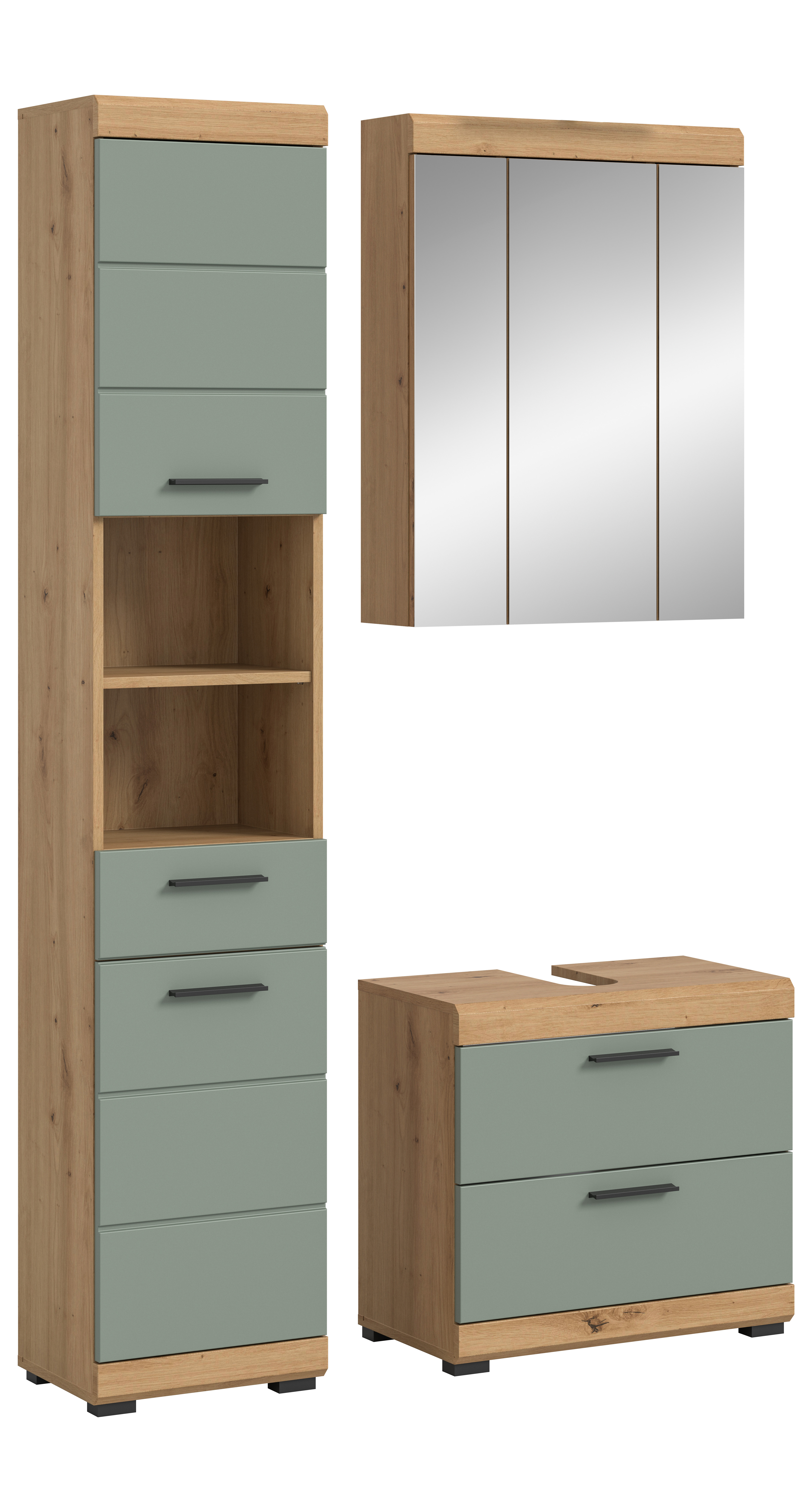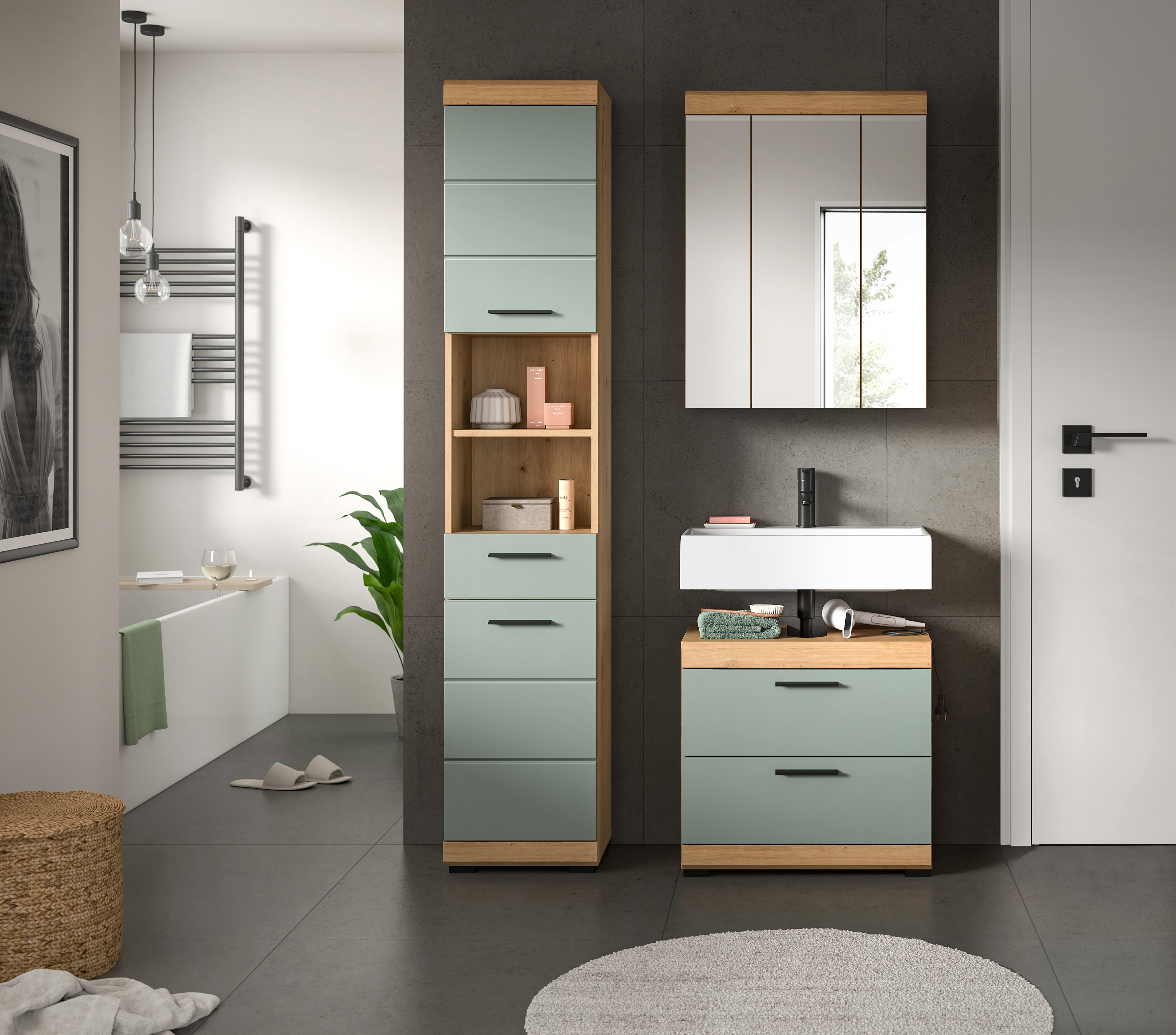 Verleihe deinem Badezimmer den ultimativen Style mit unserer Badkombination in angesagter Artisan Eiche Nachbildung und salbeifarbener Nachbildung. Mit ihrem trendigen Design und der hochwertigen Verarbeitung setzt sie ein modernes Statement in deinem Zuhause. Entdecke jetzt die perfekte Verbindung von Coolness und Funktionalität für dein Badezimmer!