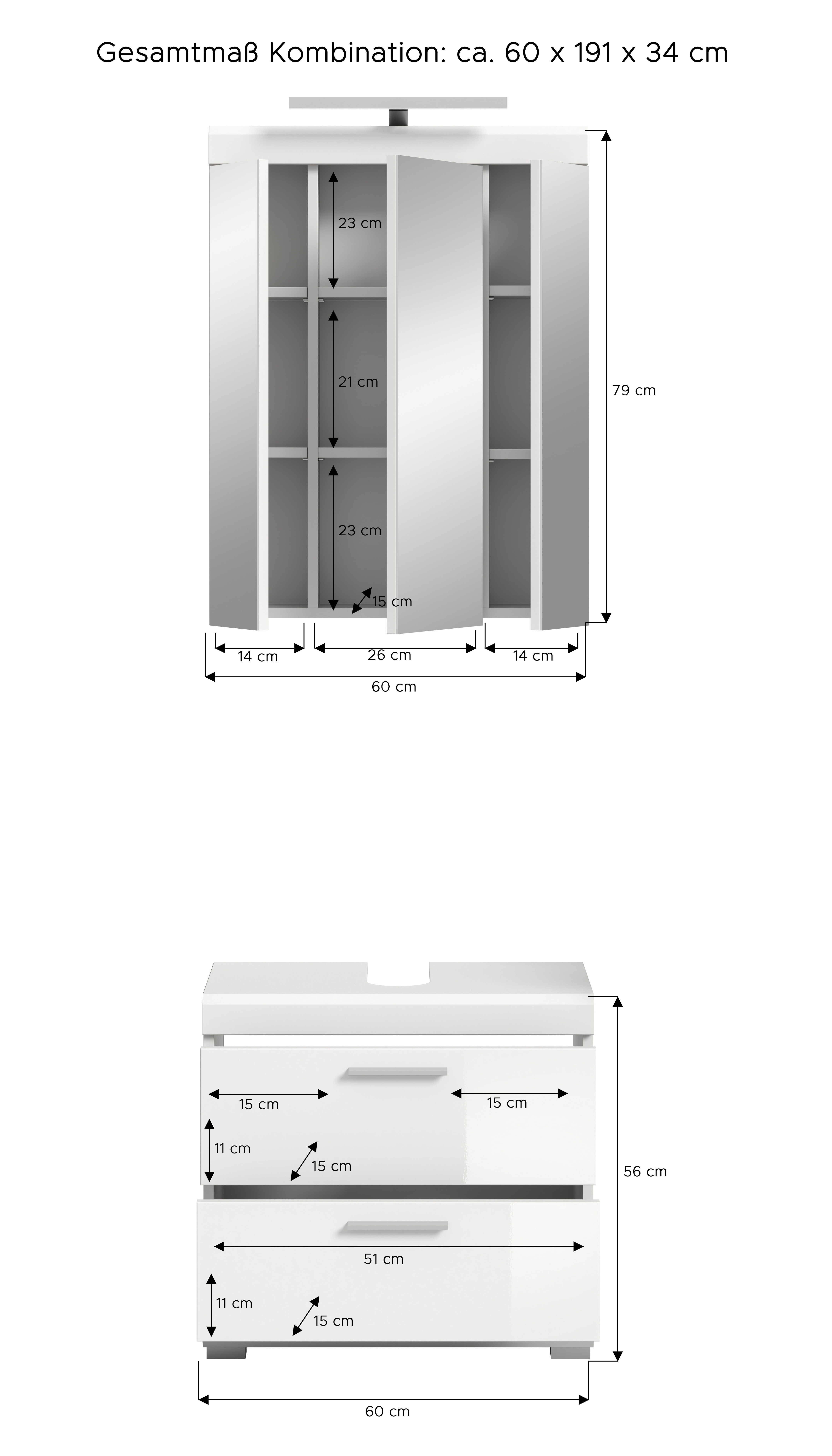 - Einsatzbereich: Die Badkombination ist vielseitig einsetzbar und eignet sich perfekt für Badezimmer oder Hauswirtschaftsräume, um Stauraum zu schaffen und gleichzeitig das Erscheinungsbild des Raumes zu verbessern.