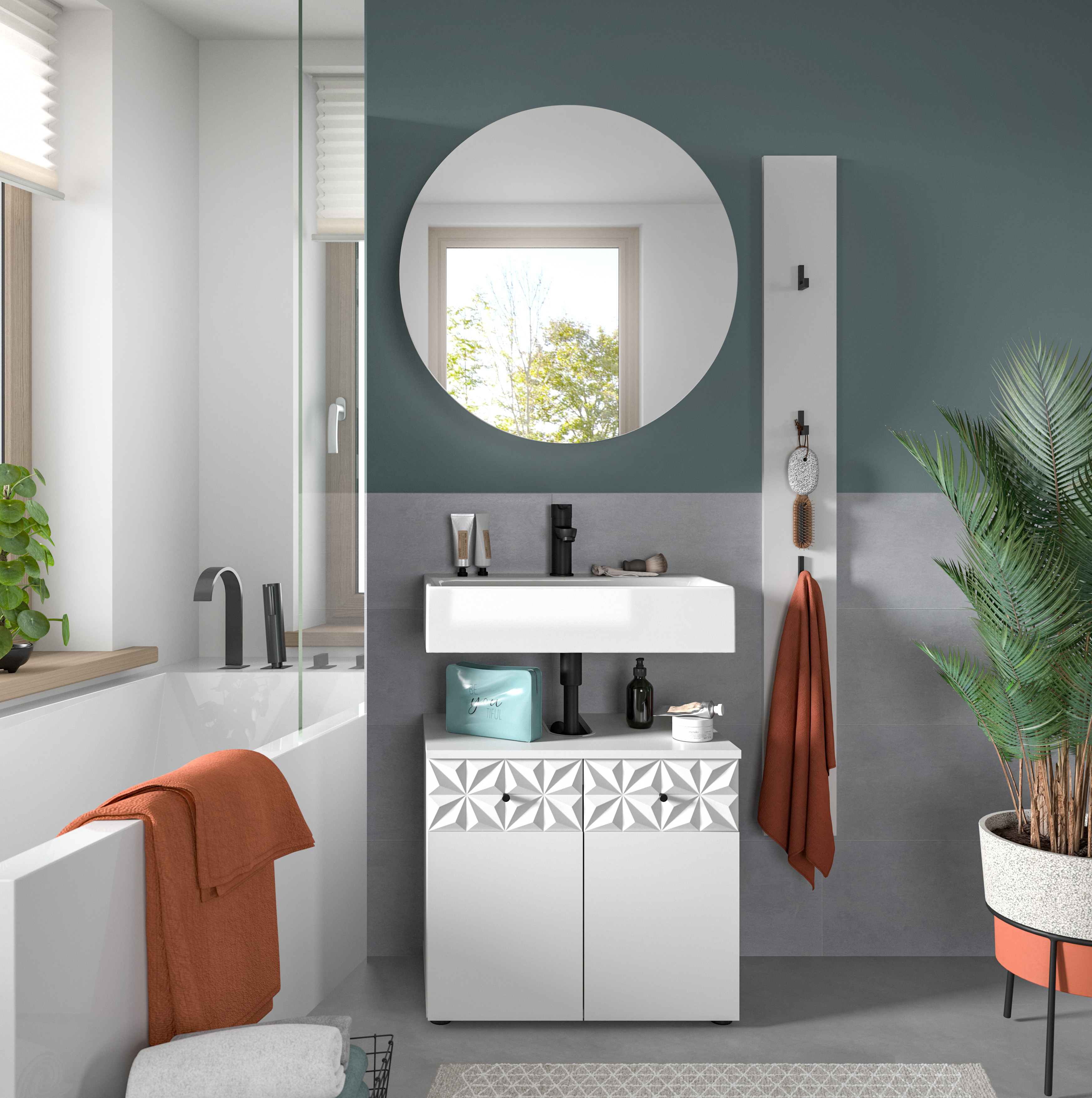 - Design/Stil: Die moderne Front aus weißem Melamin sorgt für eine helle, zeitlose Optik, die Ihr Bad freundlich und einladend wirken lässt. Die schwarzen Metall-Griffleisten setzen dabei elegante Akzente.