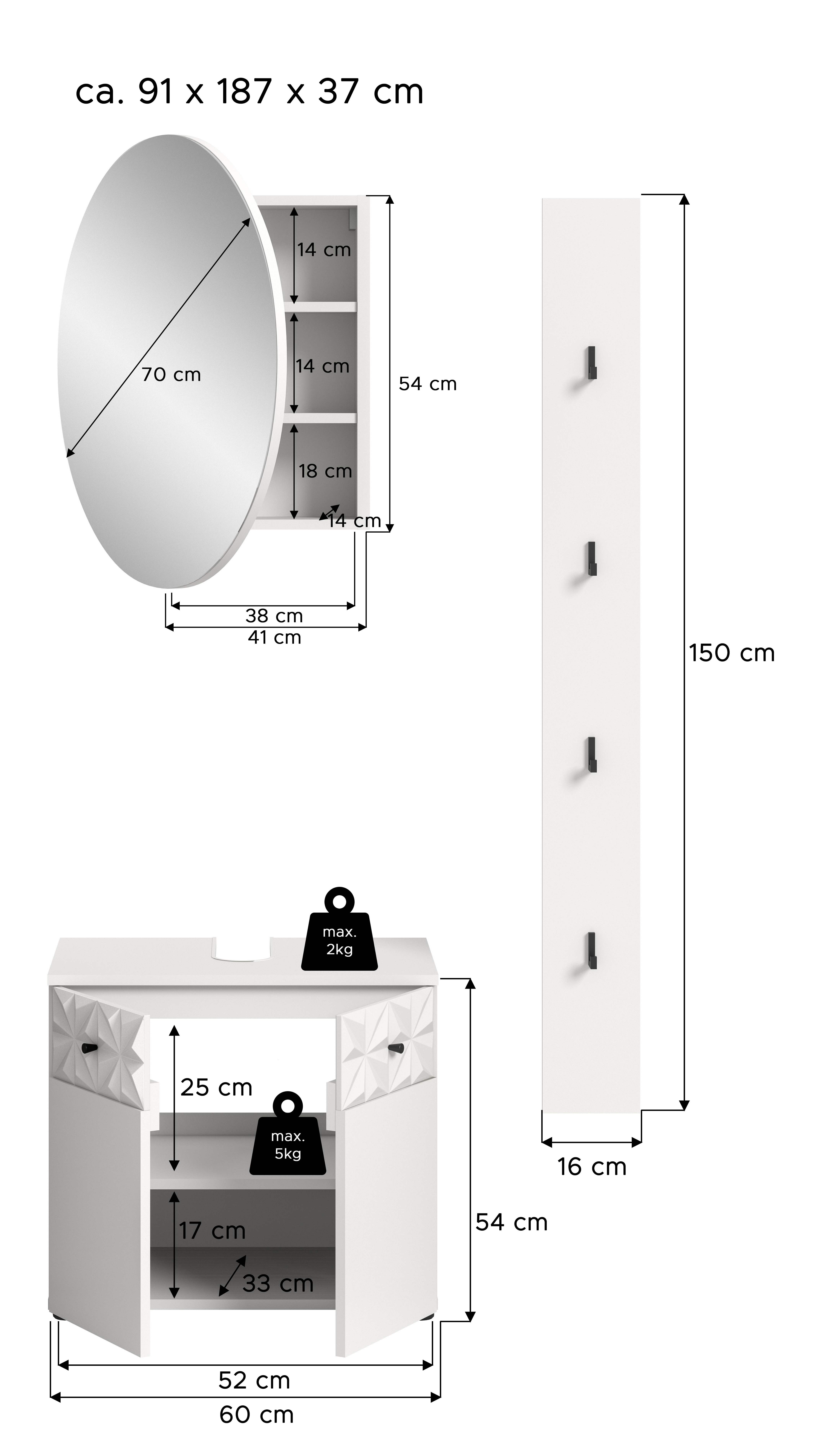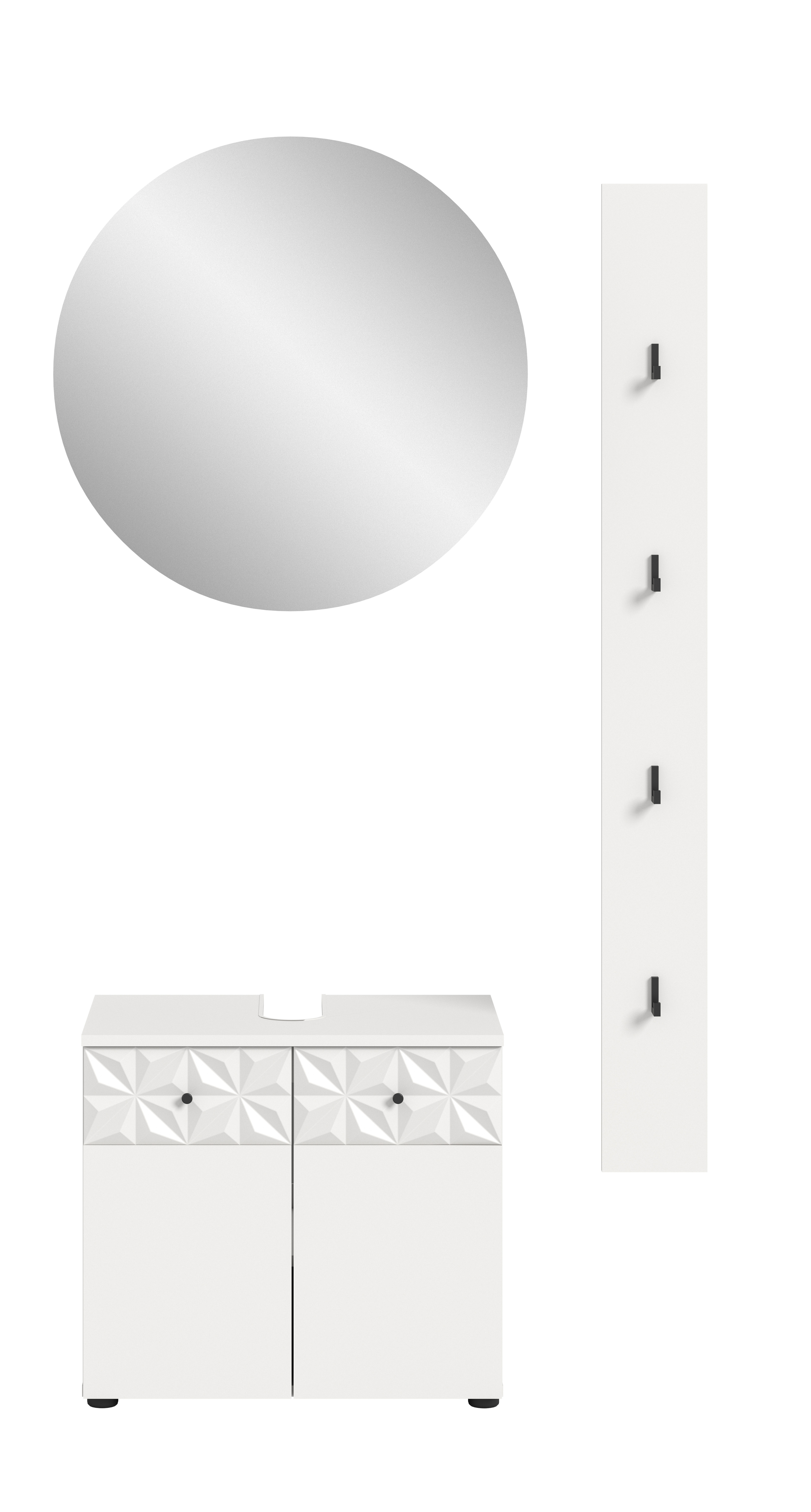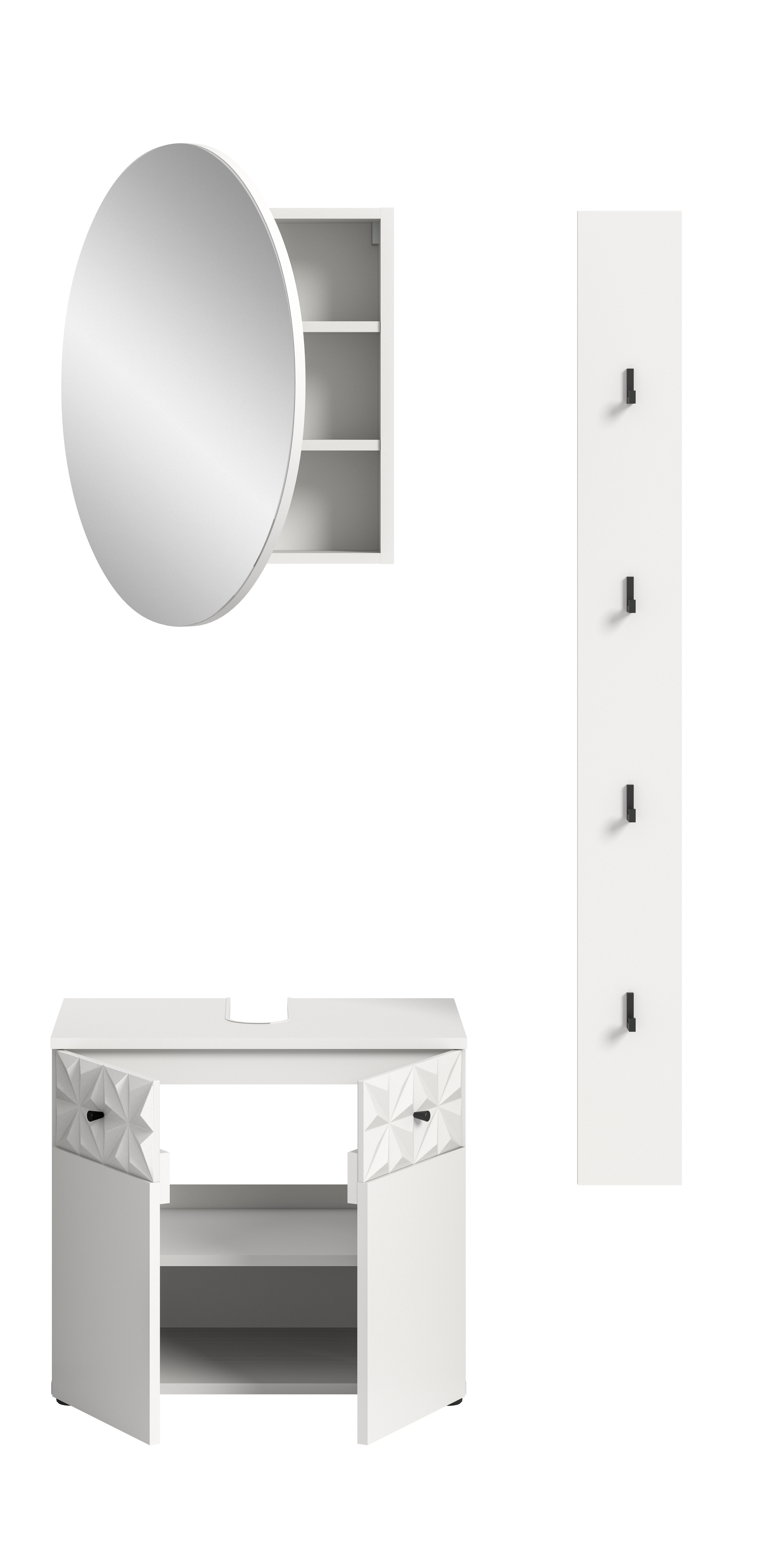 Die Badkombination in weißer Nachbildung verbindet modernes Design mit hoher Funktionalität und nachhaltiger Verarbeitung. Perfekt geeignet, um Ihr Badezimmer stilvoll zu gestalten. Diese stilvolle Badkombination bringt Ordnung und Eleganz in Ihr Badezimmer und unterstützt gleichzeitig einen nachhaltigen Lebensstil. Kombinieren Sie modernes Design mit praktischen Funktionen für eine Wohlfühloase in Ihrem Zuhause!