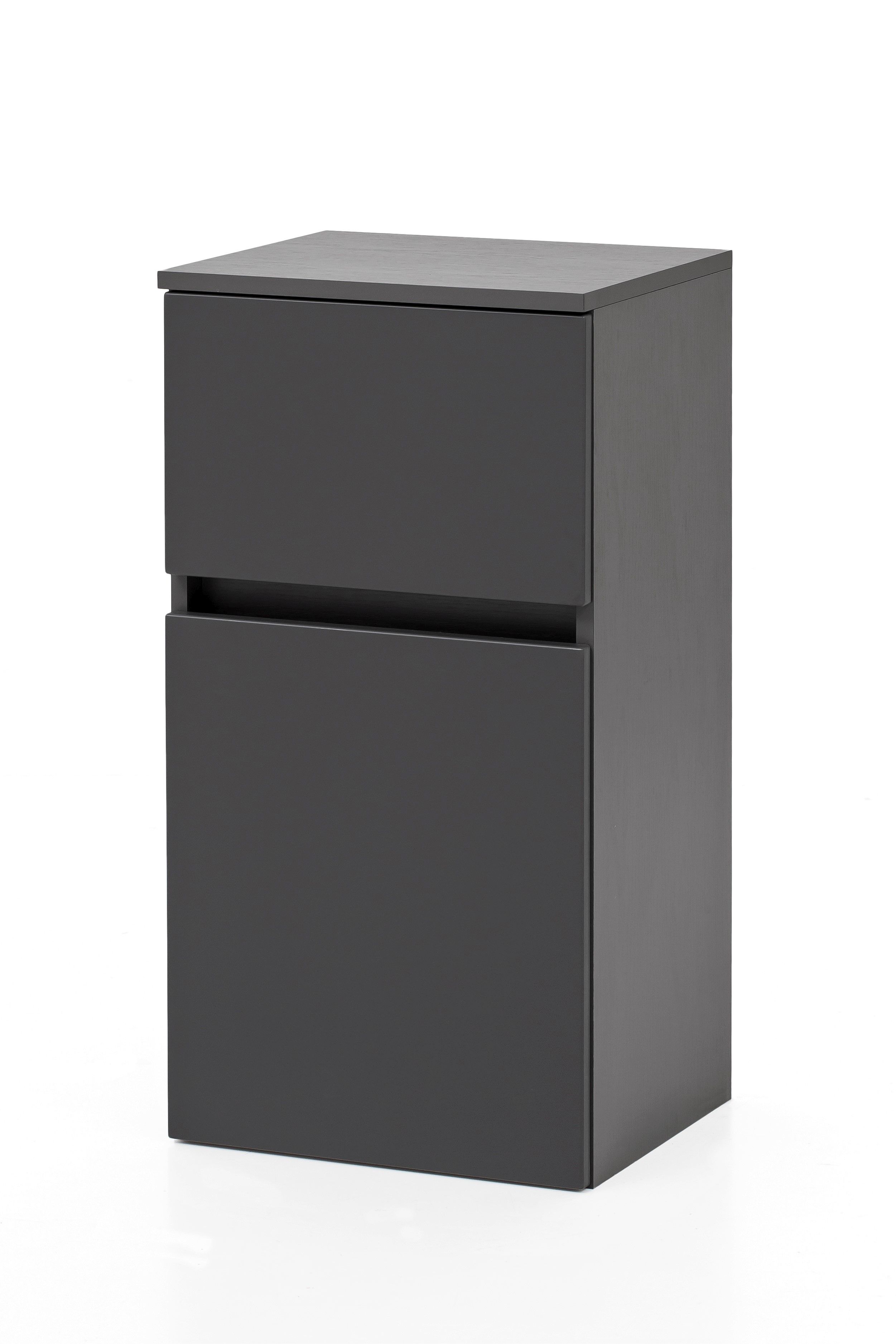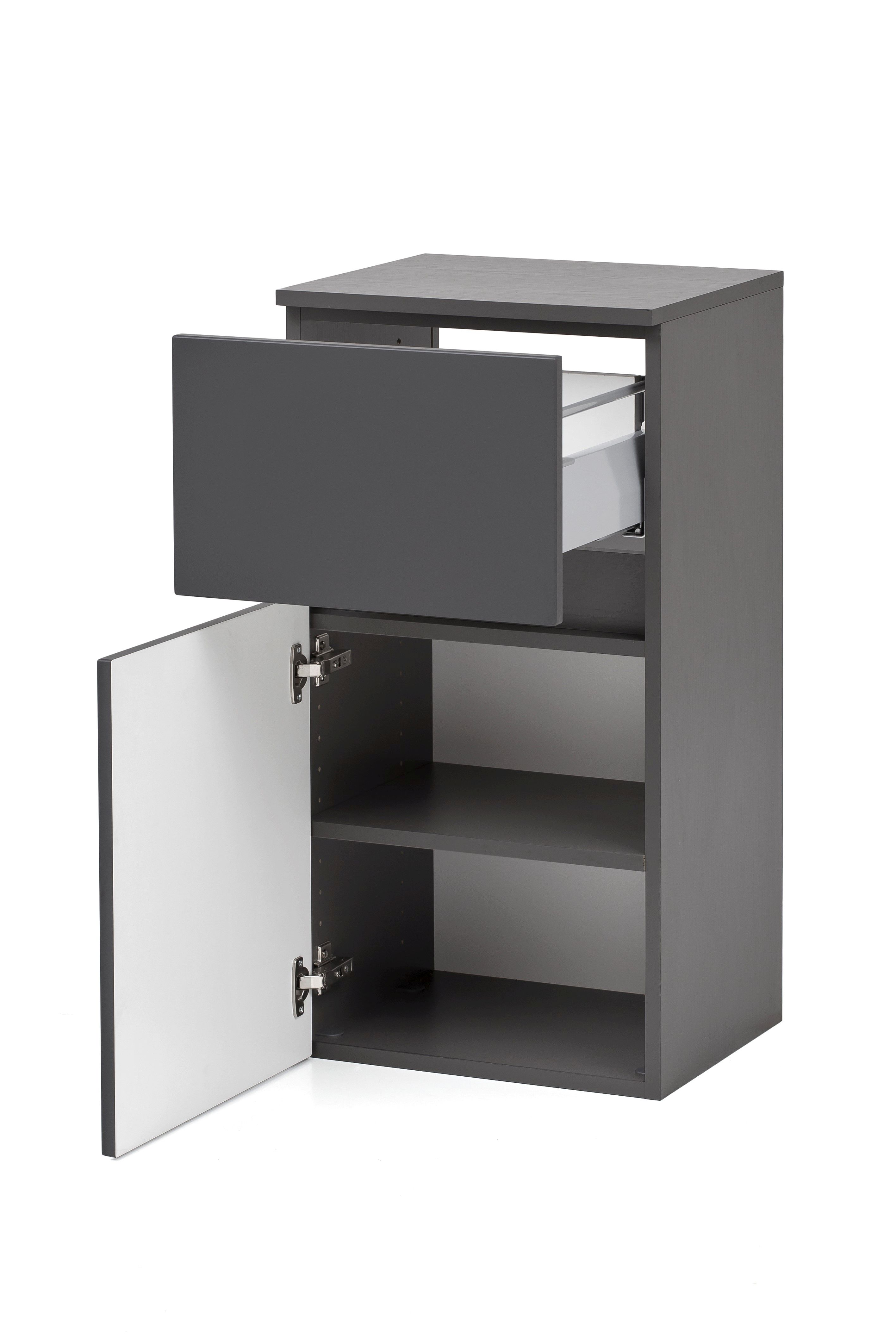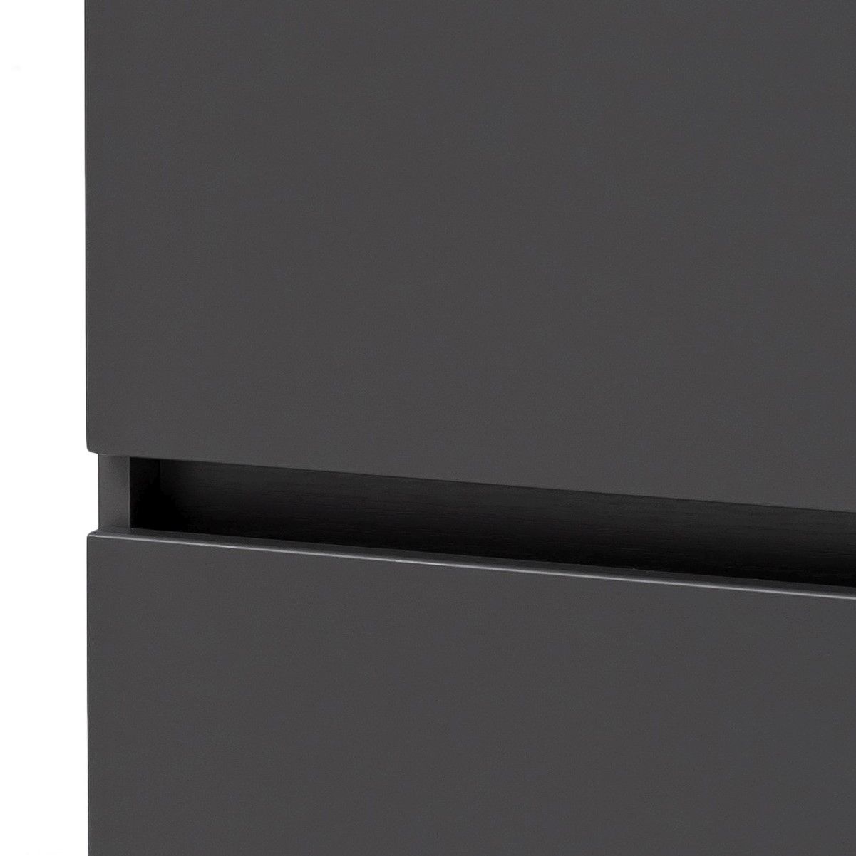 Front: MDF (Mitteldichte Holzfaserplatte) in matt grau