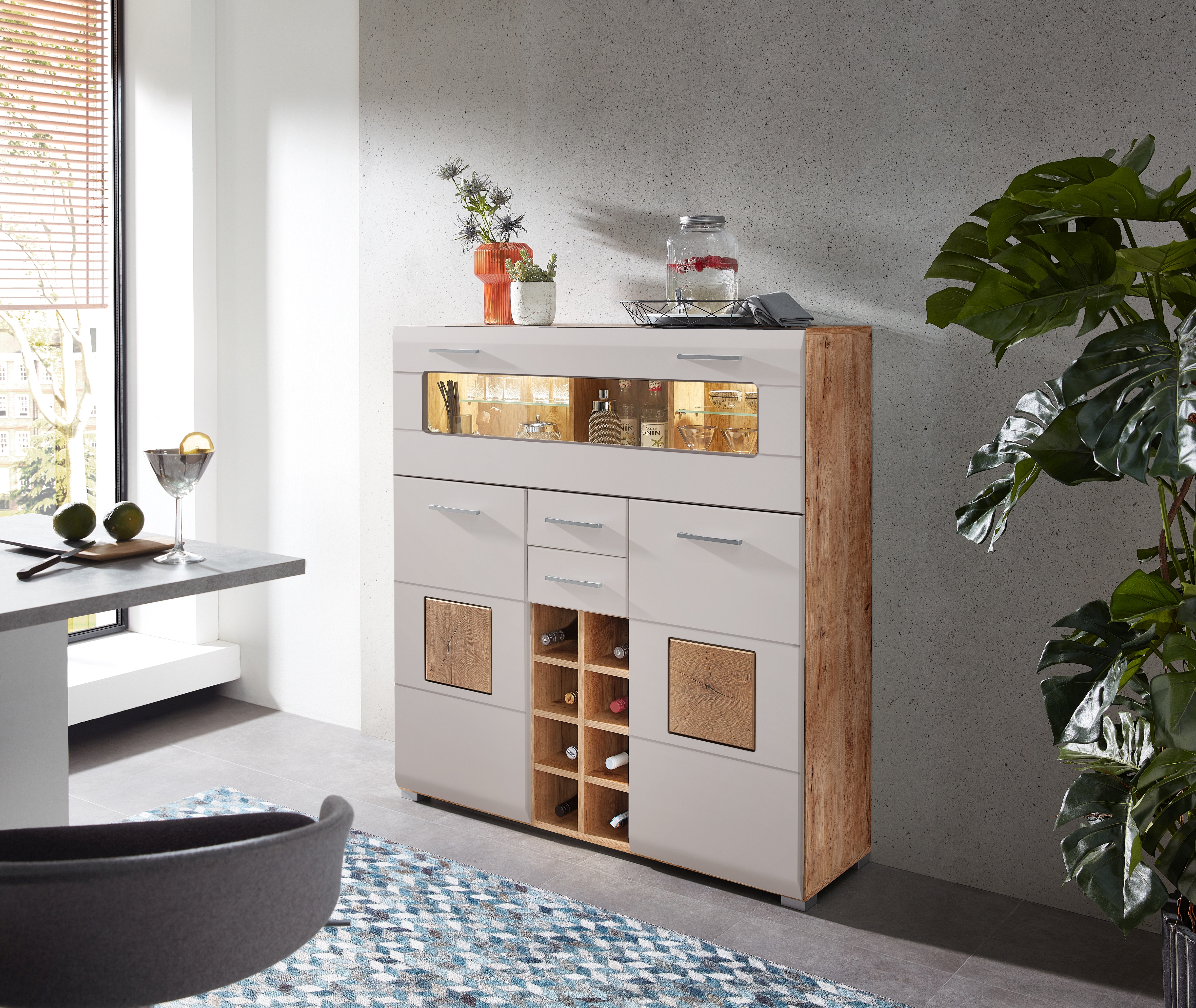 Front: Kaschmir matt MDF (Mitteldichte Holzfaserplatte) mit Absetzungen in Hirnholz Holznachbildung / Klarglas