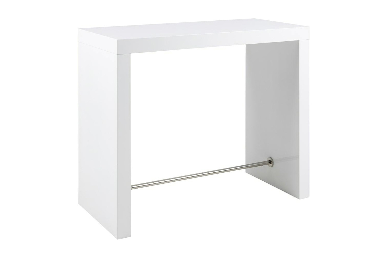 Dieser Bartisch verbindet Funktionalität mit schlichter Eleganz und schafft zusätzliche Steh- oder Sitzmöglichkeit in Küche oder Essbereich. Die weiße Hochglanzoberfläche verleiht dem Tisch nicht nur einen modernen Look, das pflegeleichte MDF macht eine Reinigung zudem spielend leicht. Die Querstrebe aus rostfreiem Stahl verleiht dem Tisch Stabilität, ohne die großzügige Beinfreiheit einzuschränken. Der Tisch kann mit entsprechenden Hockern entweder als Bartisch genutzt werden, oder aber als Stehtisch und Küchentheke.