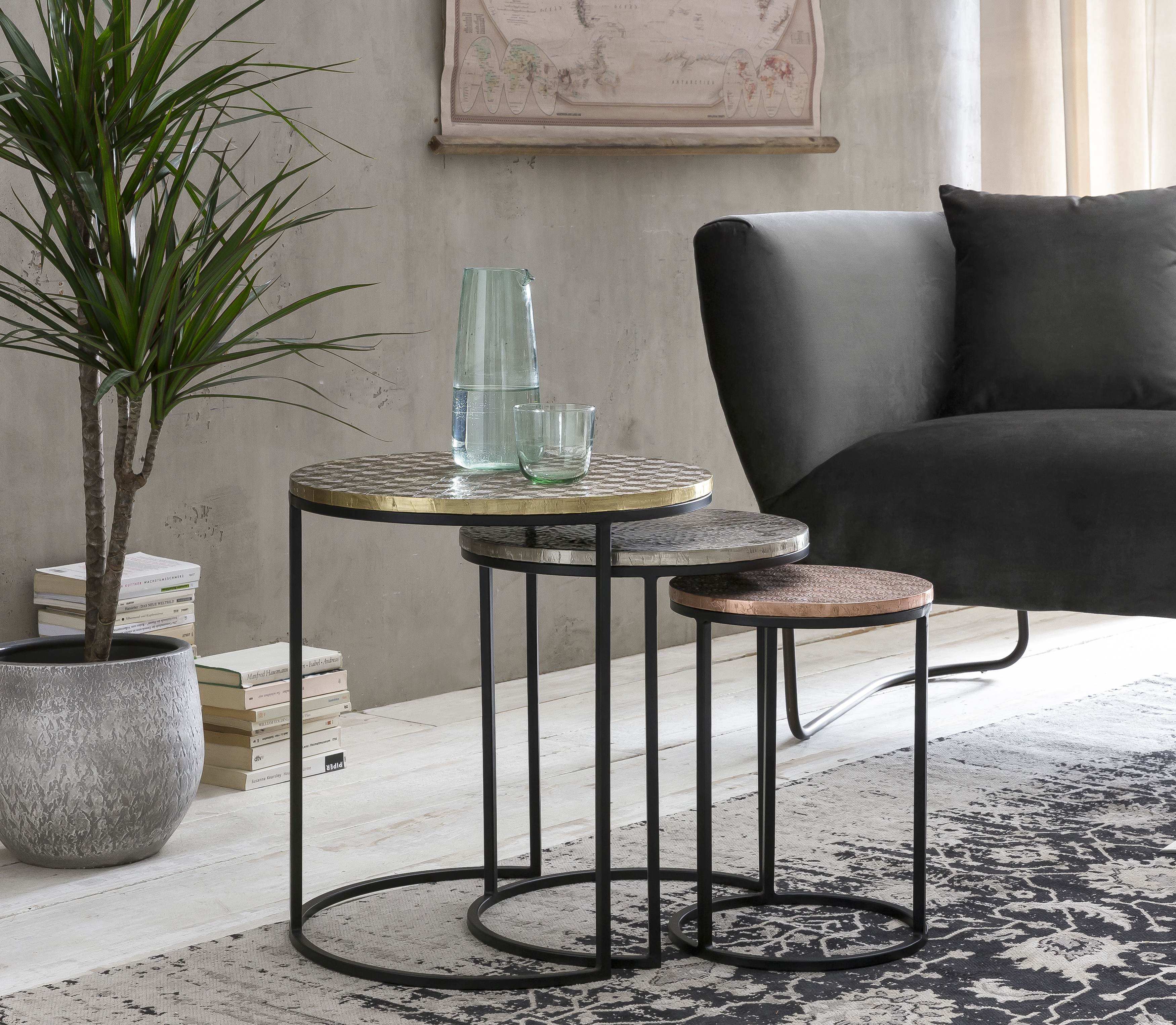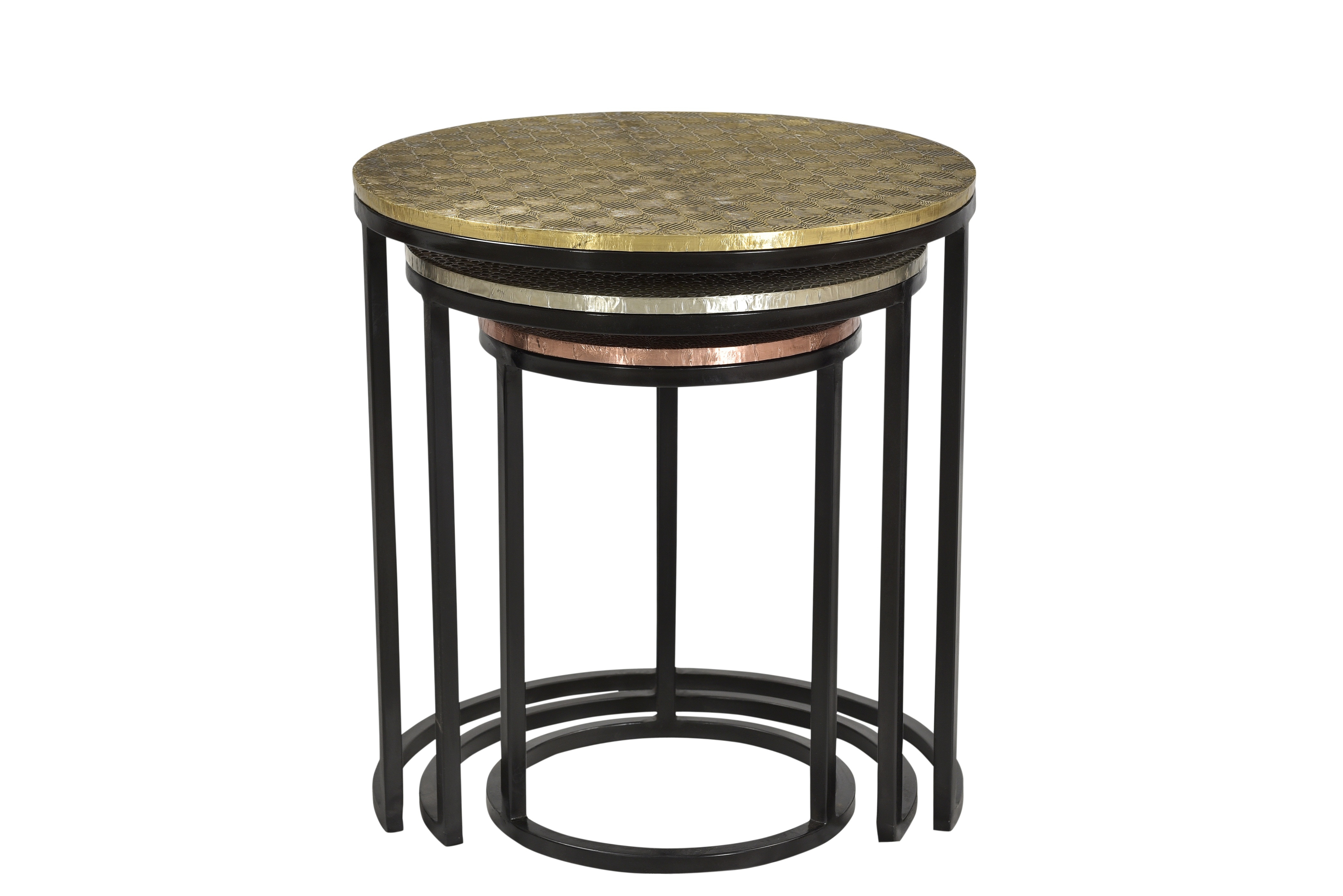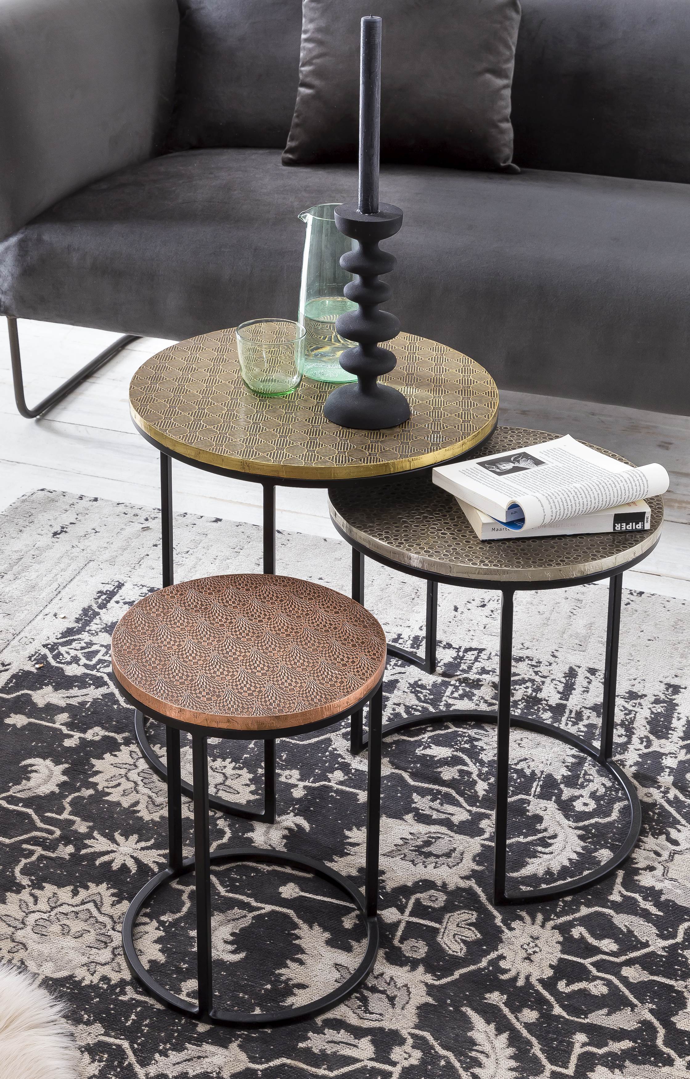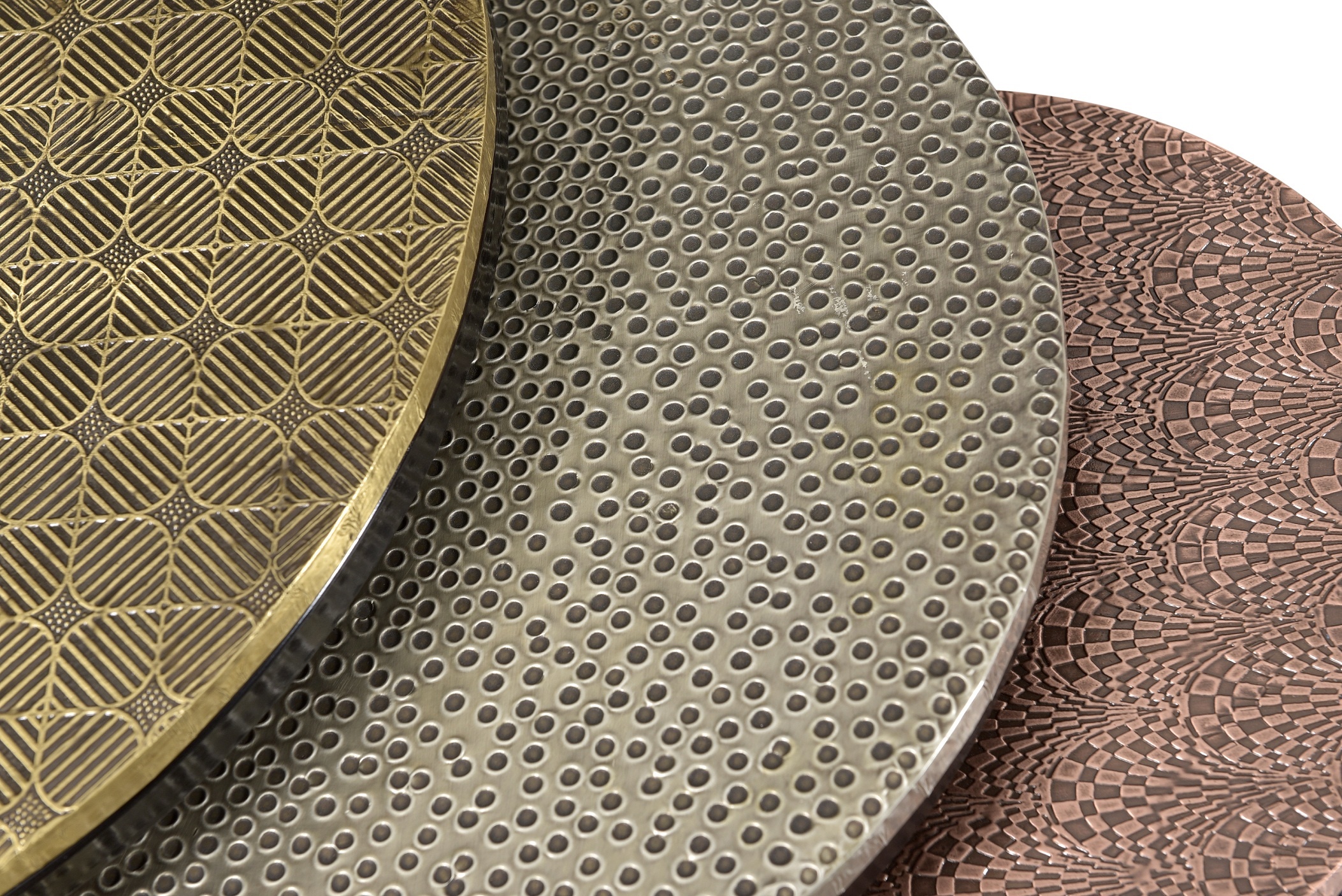 Platten: Mango massiv (Indien) / MDF (Mitteldichte Holzfaserplatte) mit Messing, Weißmetall, Kupfer beschlagen