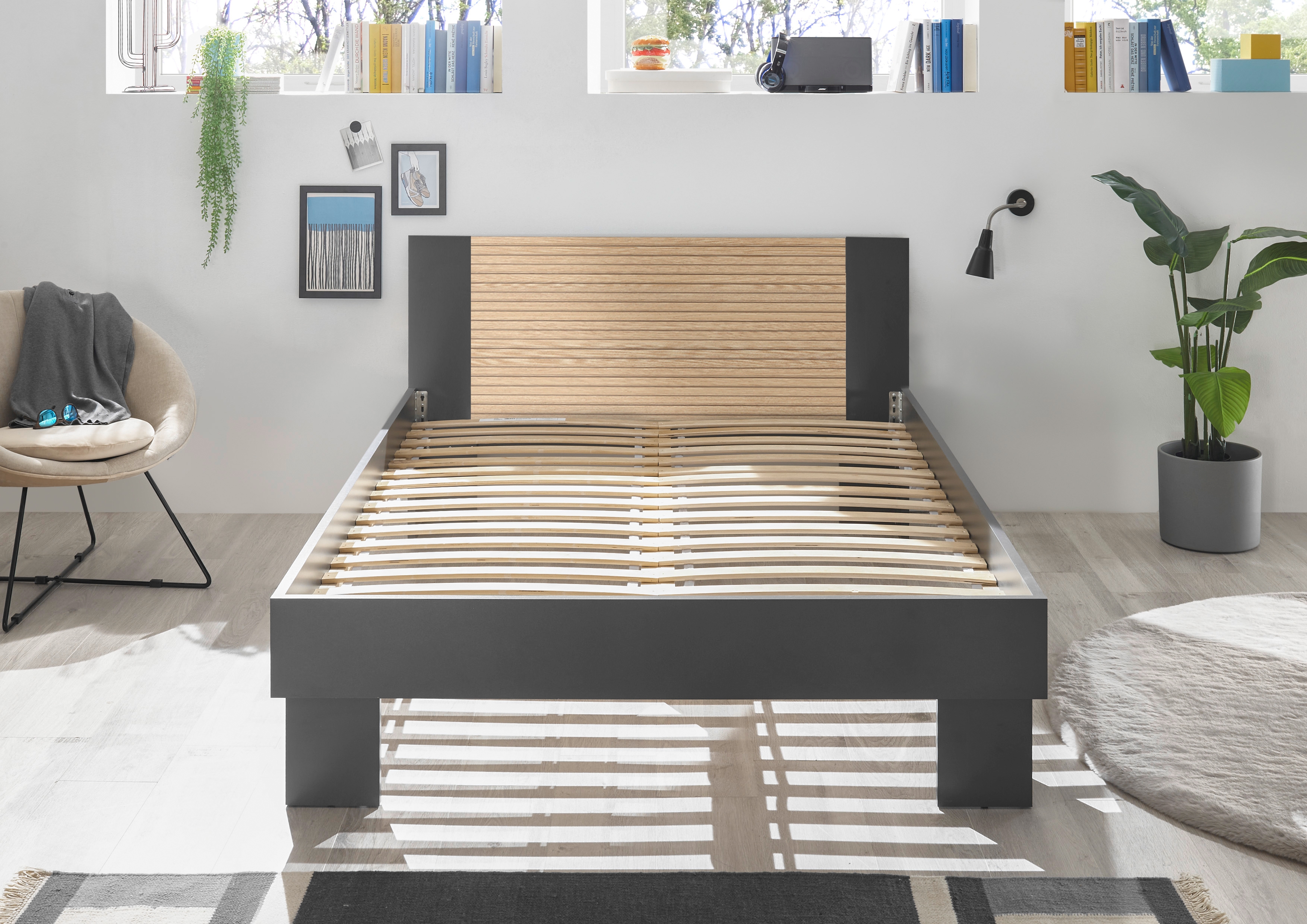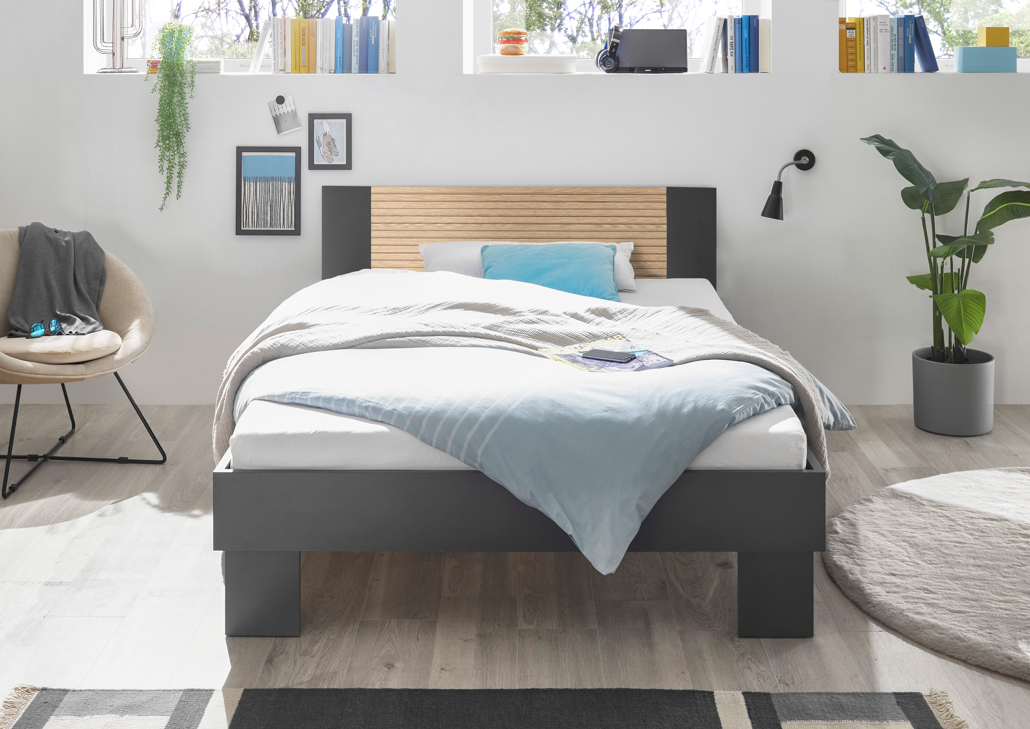 Graphit mit einem Kopfteil in Eiche Lamelle Holznachbildung, Melaminbeschichtung