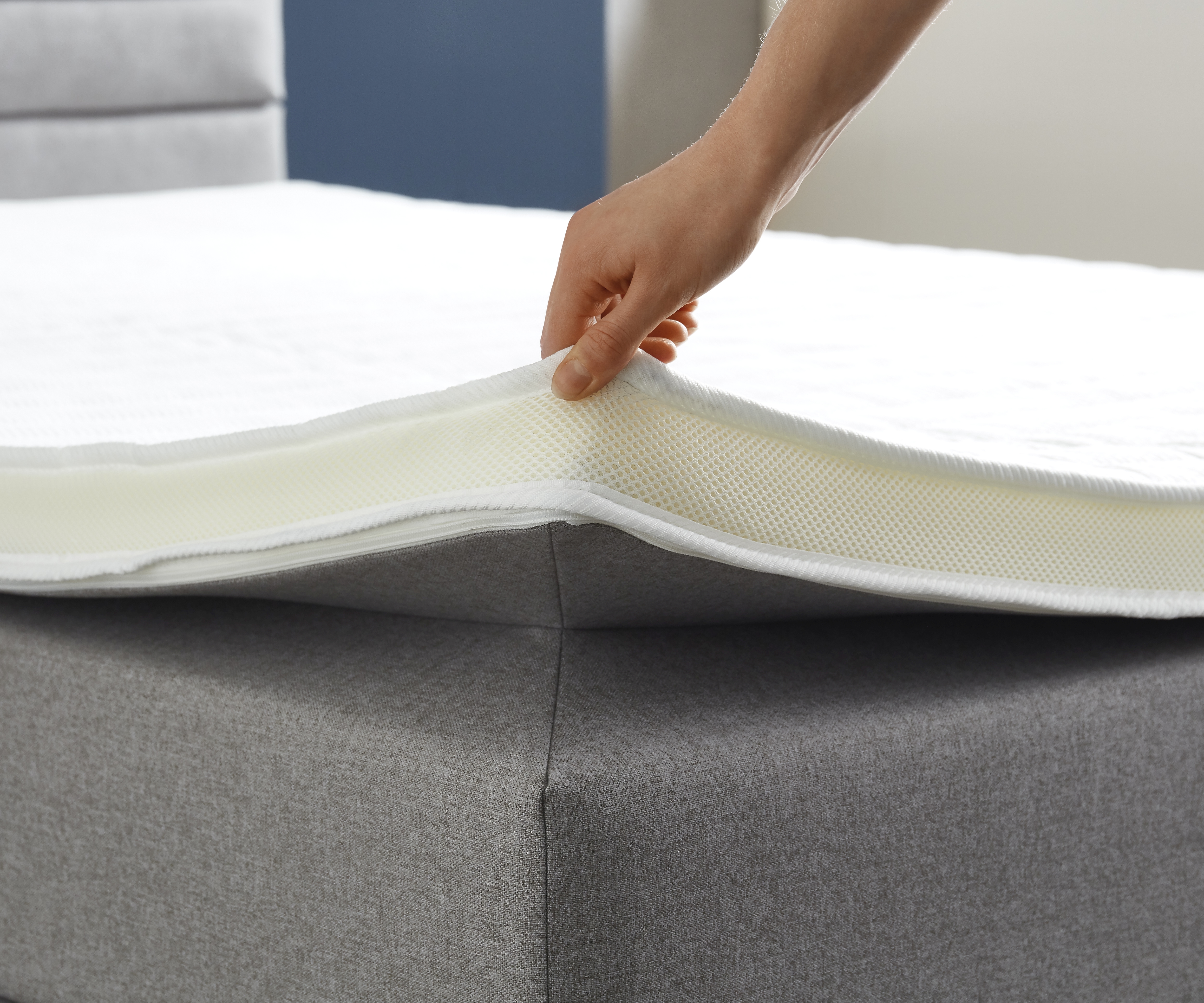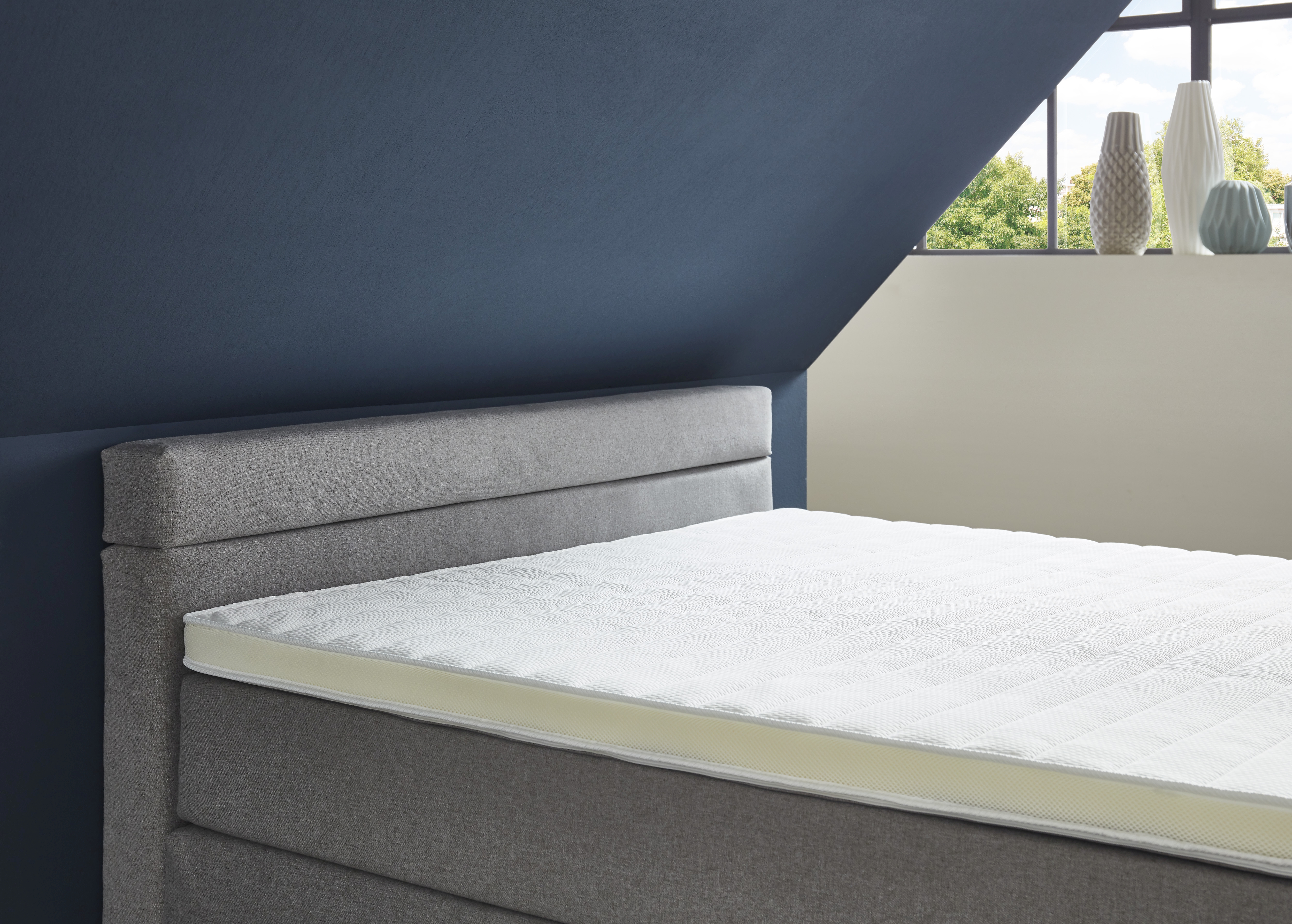 Topper fest mit Basismatratze vernäht, in Optik eines separaten Toppers, ohne, dass dieser verrutschen kann. Durch eine Vertiefung/Überlappung besteht die Möglichkeit ein Spannbettlaken zu fixieren, ohne dass die Seiten der Matratze überdeckt werden.