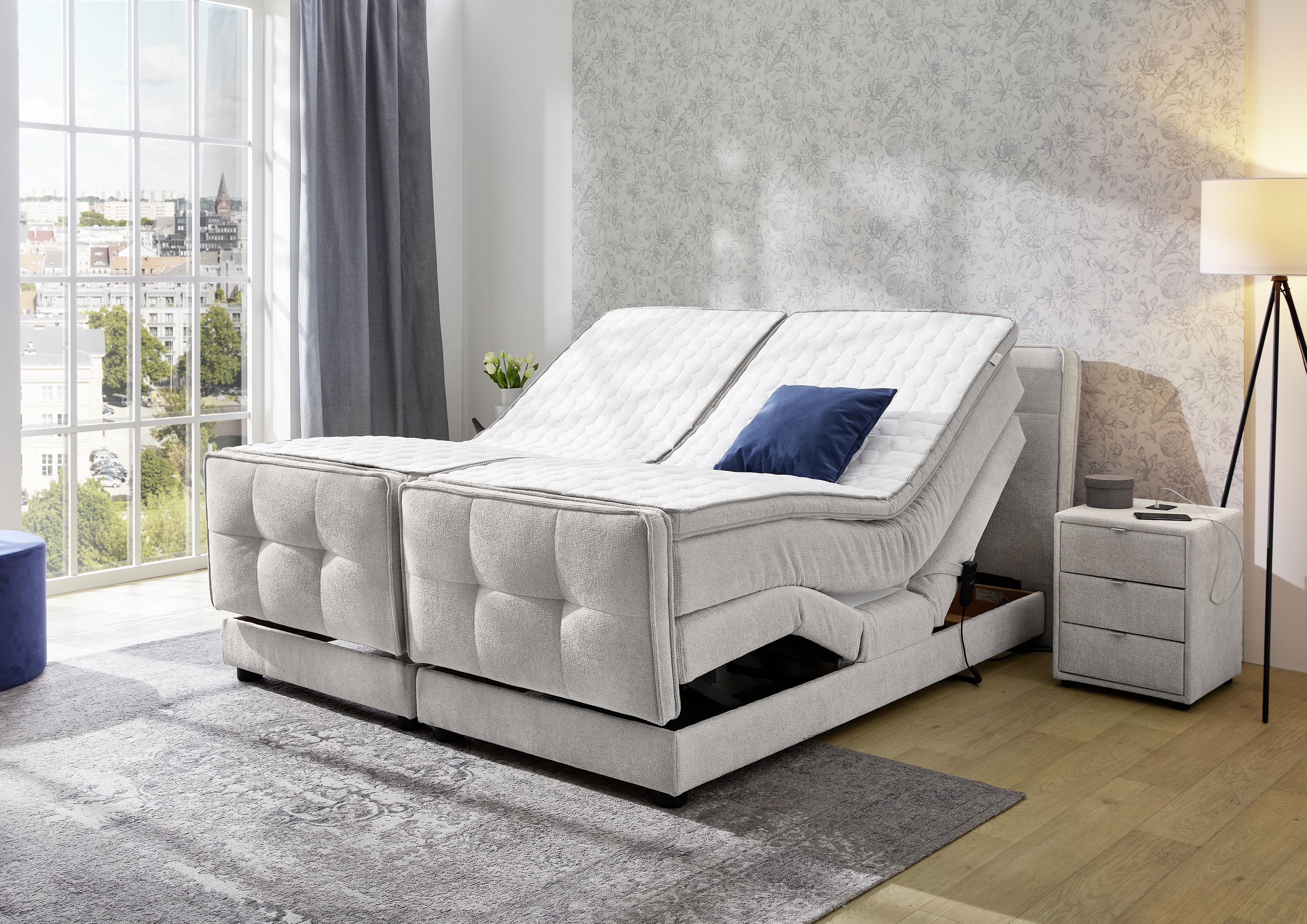 Highlight dieses Boxspringbettes liegt eindeutig in der elektromotorischen Verstellbarkeit. Die individuelle Lieblingsliegeposition kann mit Hilfe einer praktischen Fernbedienung in unzähligen Kopf- und Fußteilpositionen eingestellt werden. Das dekorative Kopf- und Fußteil ist mit einem interessanten Doppelkeder optisch aufgehübscht.Das Fußteil hat zudem die positive Eigenschaft, dass sich Matratze und Topper im Funktionsmodus nicht verschieben.
