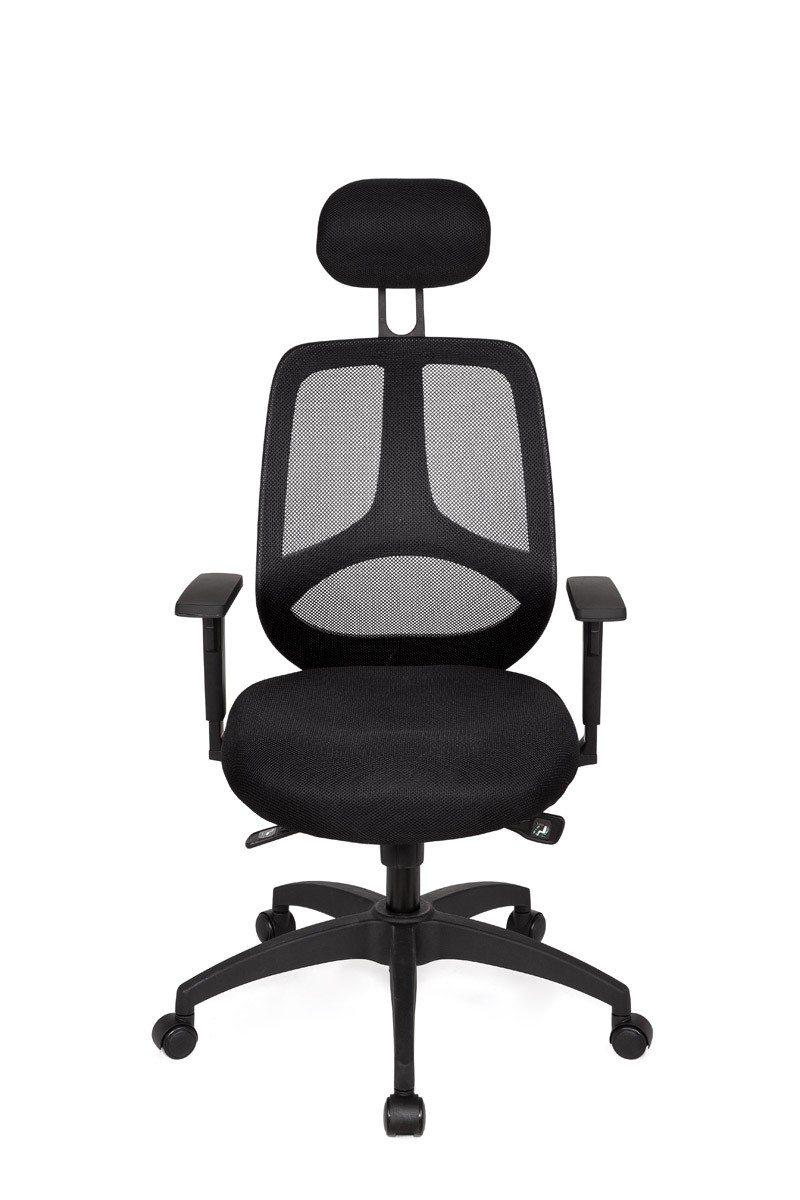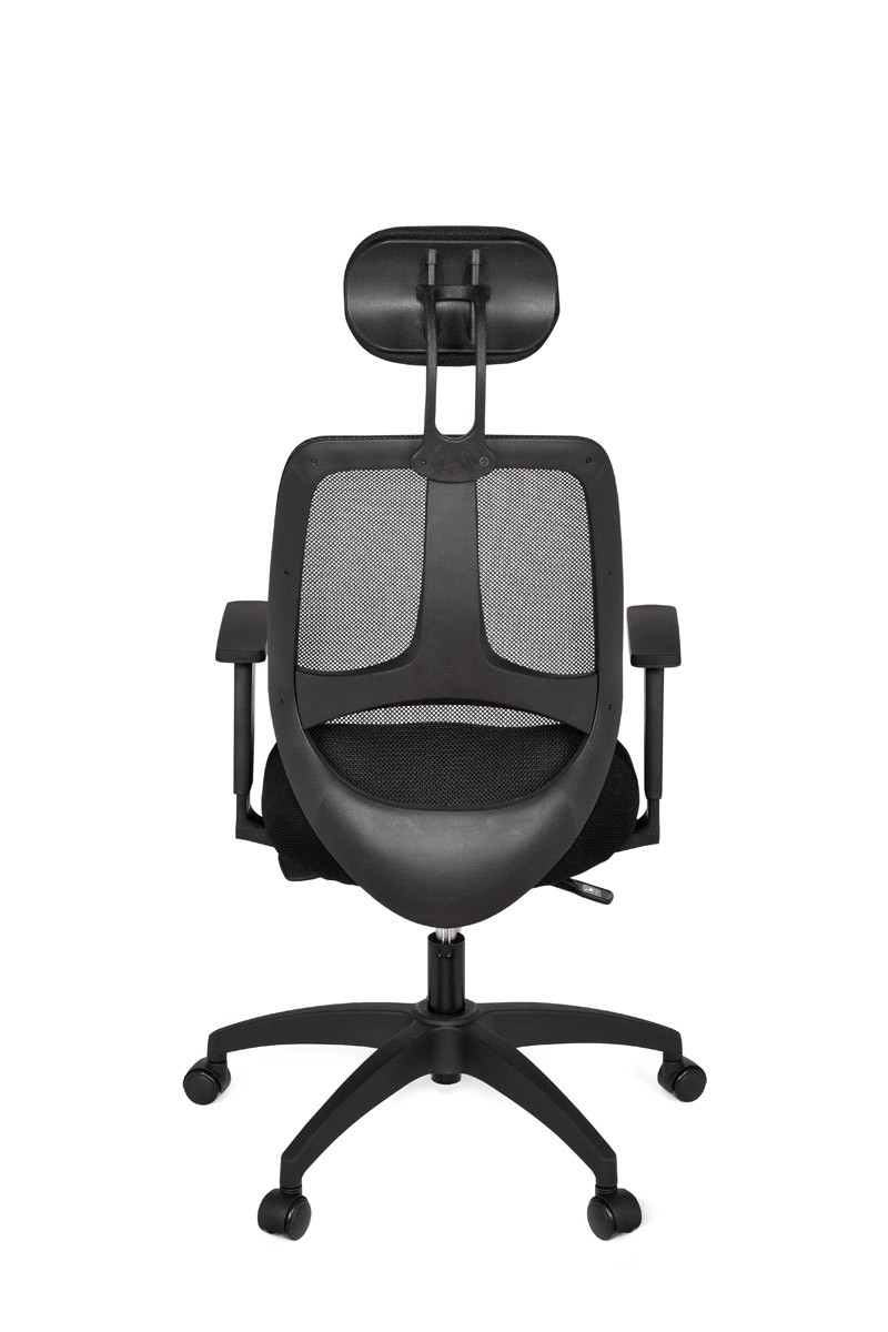 Die Rückenlehne hat einen atmunsaktiven Netzbezug, ein besonders weiten Einstellwinkel, eine Lendenwirbelunterstützung und zudem verhindert die Anti-Schock-Funktion, dass die Rückenlehne bei einer Aufhebung der Arretierung schlagartig an den Rücken stößt. Die Armlehnen sind verstellbar und besitzen eine hochwetige Armauflage.