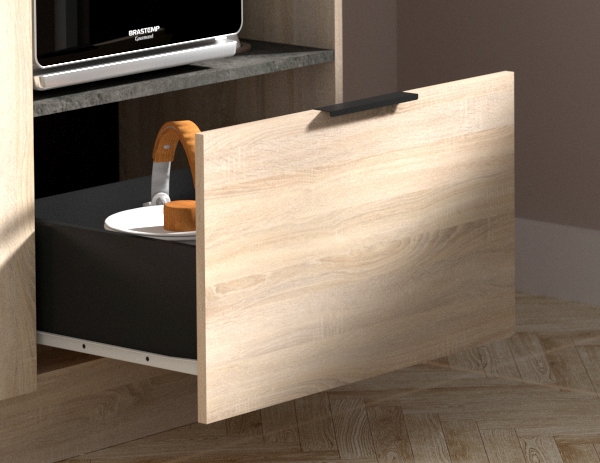 Unten links: 1 Schubkasten, darunter 1 Tür, dahinter 2 Fächer