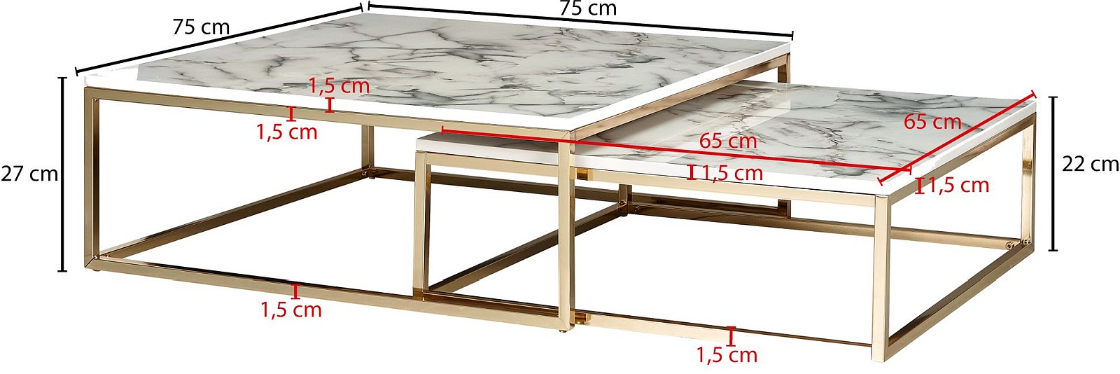 MATERIAL ✔ Tischplatten: Foliertes MDF in weißer Marmor Optik mit schützender PVC-Beschichtung // Gestelle: lackierter Stahl.