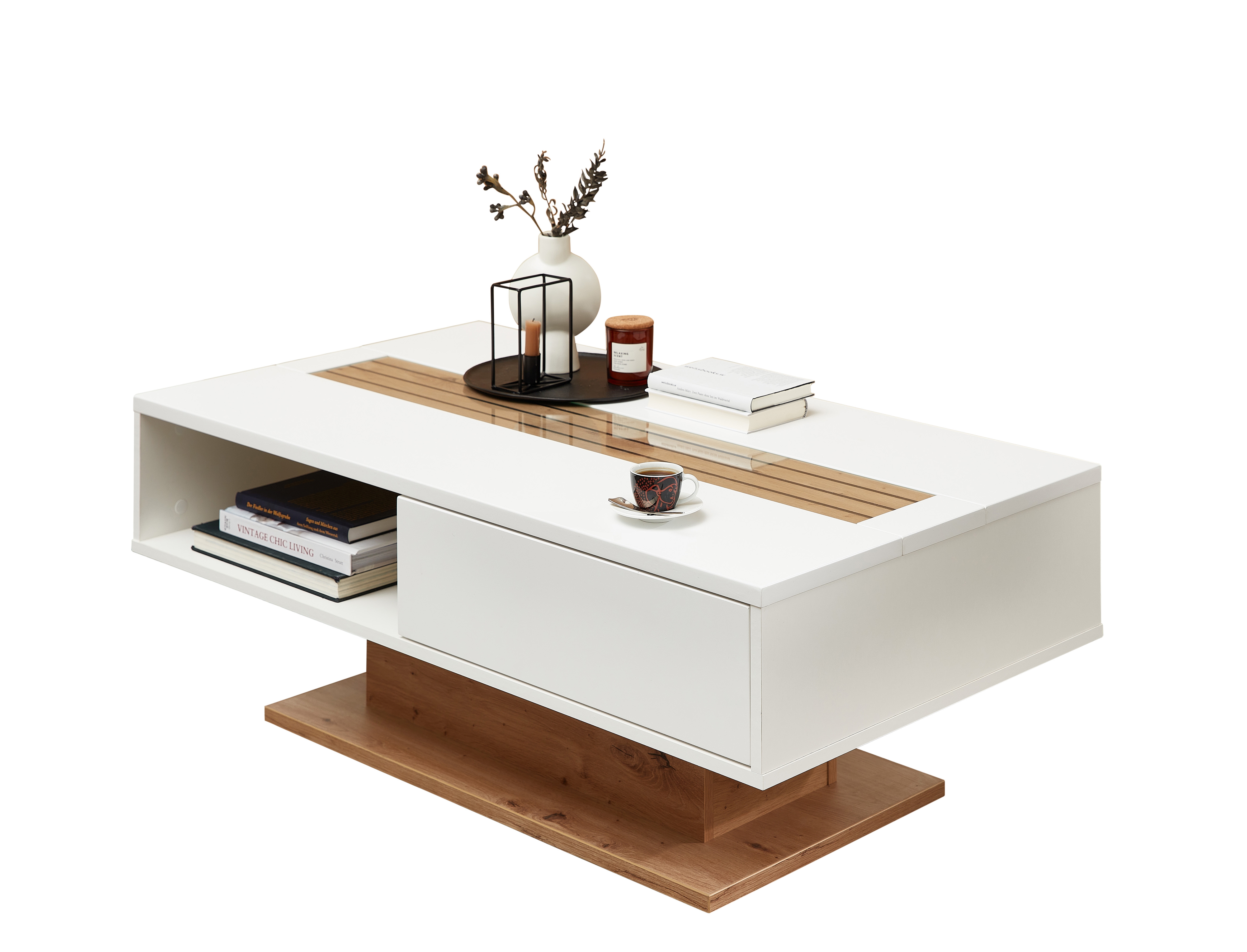 Tischplatte: Weiß matt MDF (Mitteldichte Holzfaserplatte) mittig mit einer Einlage in Artisan Eiche Holznachbildung MDF Leistenoptik (auf der Leistenoptik liegt eine Klarglasplatte)