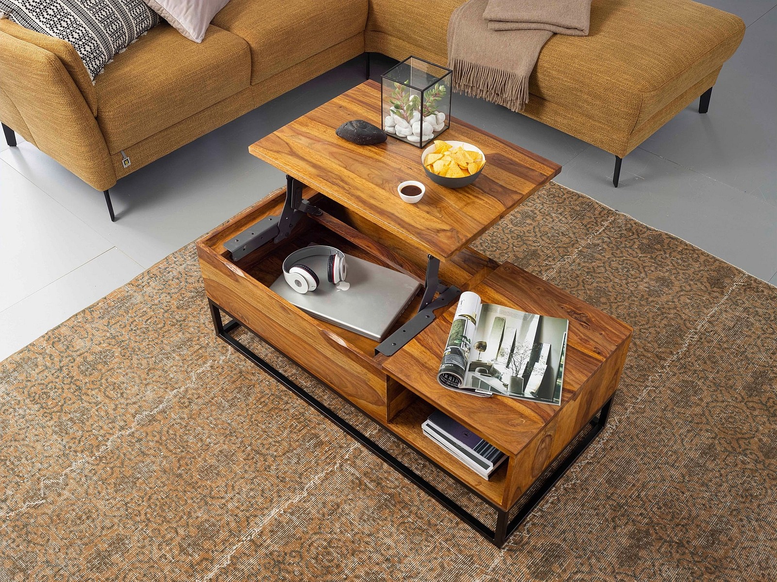 - DREH UND ANGELPUNKT ✔ Vor allem in kleinen Wohnungen ist es wichtig Möbel mit Funktionen zu haben. Dieser Kaffeetisch dient nicht nur als Ablagefläche beim Fernsehen, sondern ist auch eine Möglichkeit bei angenehmer Höhe zu Essen. Zusätzlich versteckt er Papiere oder andere Dinge, die nicht gleich gesehen werden sollen, in seinem Inneren. Trotz aller Funktionen muss das Design nicht zurückstecken und beeindruckt mit einem extravagantem Aussehen.