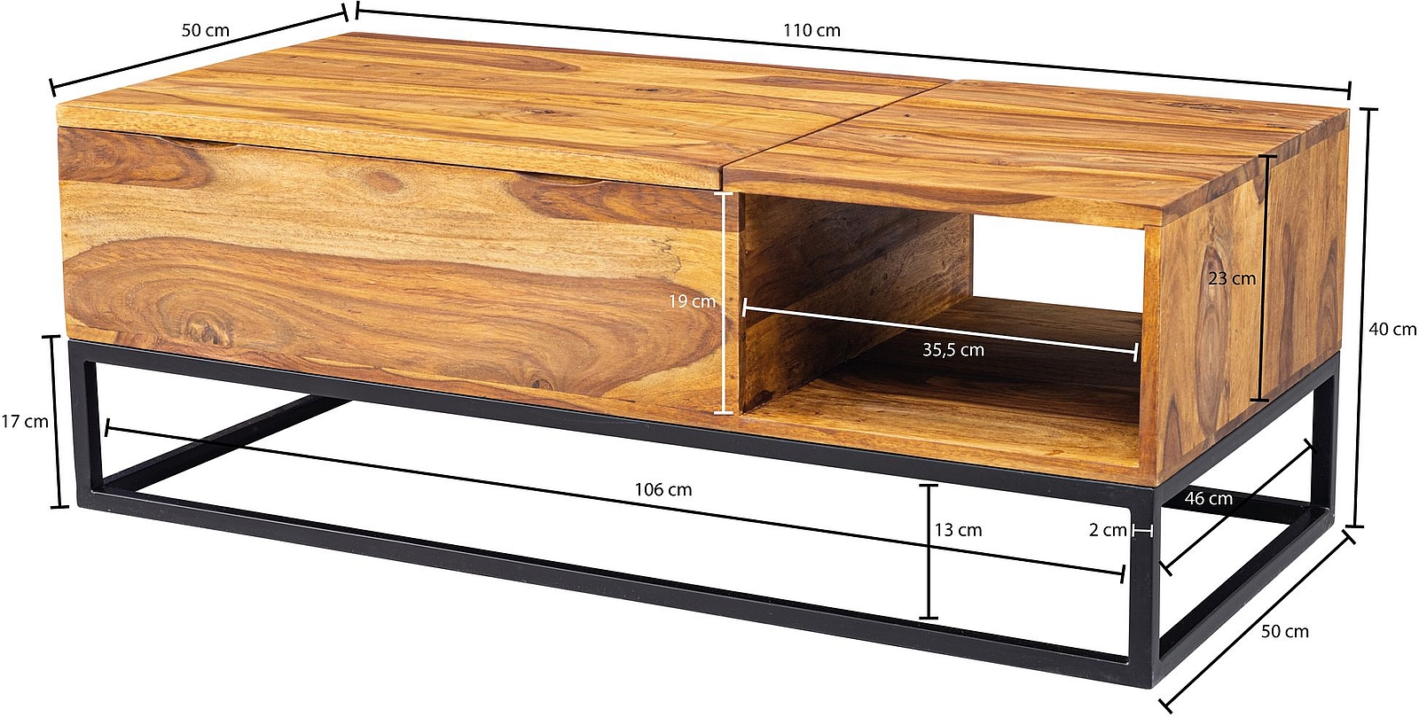 - Fach unter der aufklappbaren Tischplatte (BxHxT): 54,5 x 9 x 47 cm
