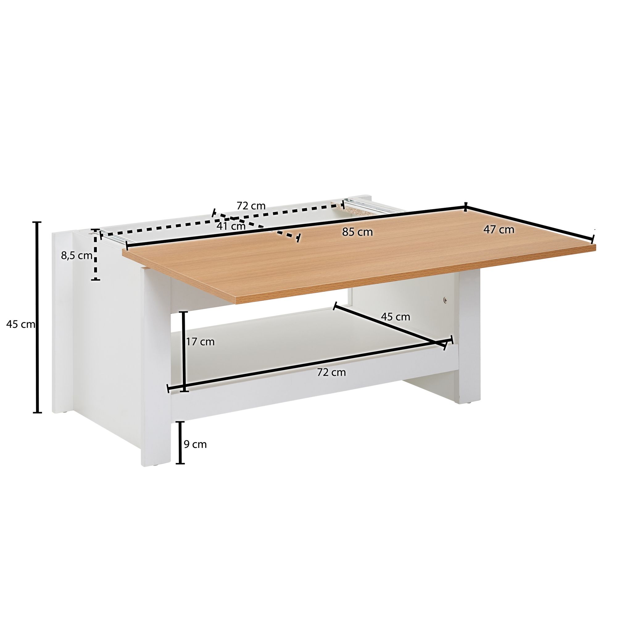 ABMESSUNGEN ✔ Breite: 85 cm // Tiefe: 47 cm // Höhe: 45 cm // Abmessungen offenes Staufach (BxHxT): 72 x 17 x 45 cm // Innenabmessungen des Staufachs unter der Tischplatte (BxHxT): 72 x 8,5 x 41 cm // Materialstärke: 1,5 cm // Weitere Abmessungen finden Sie im Maßbild.
