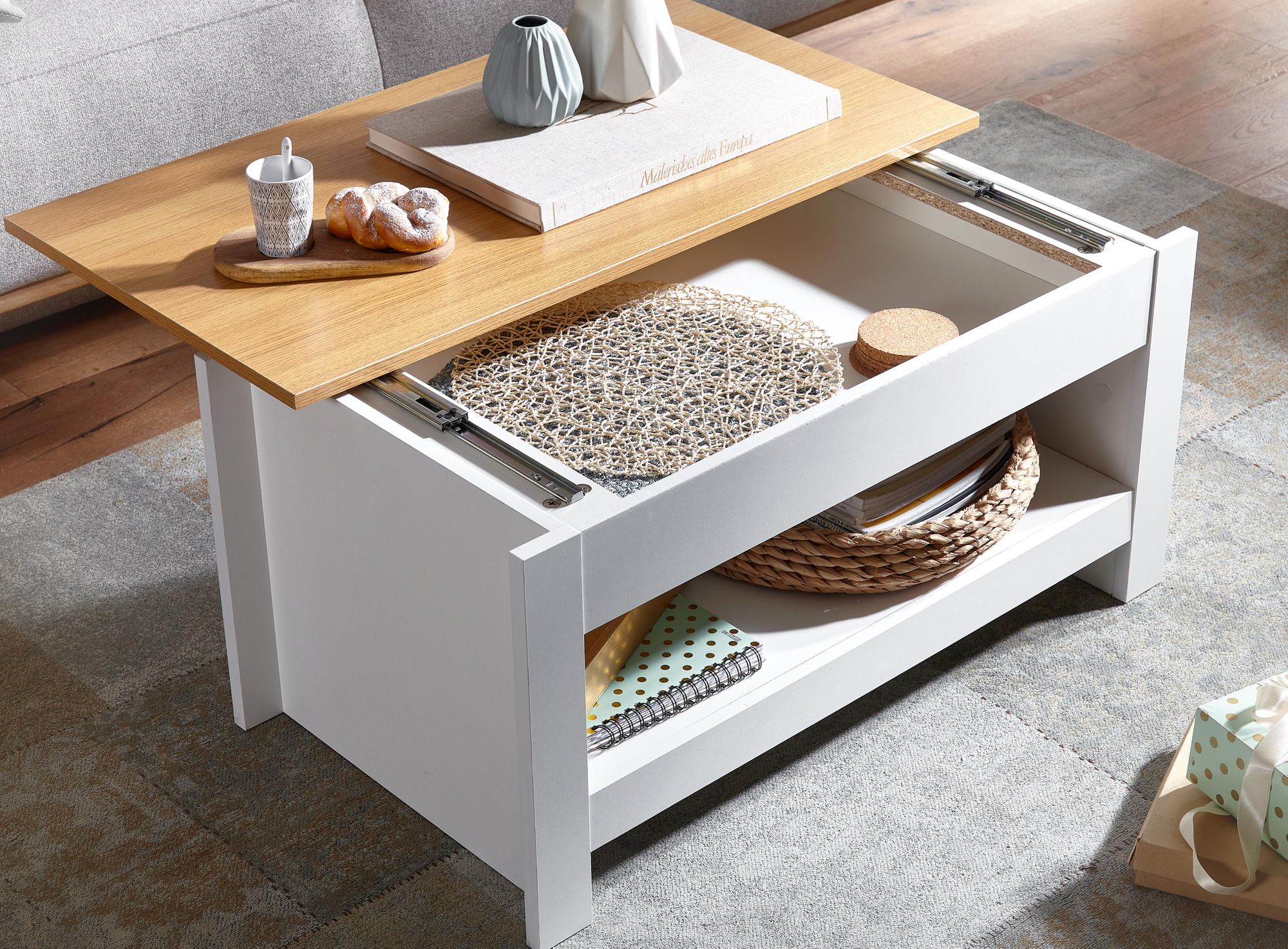 - Praktisches Ablagefach unterhalb der Tischplatte für Zeitschriften, Fernbedienung und Co.
