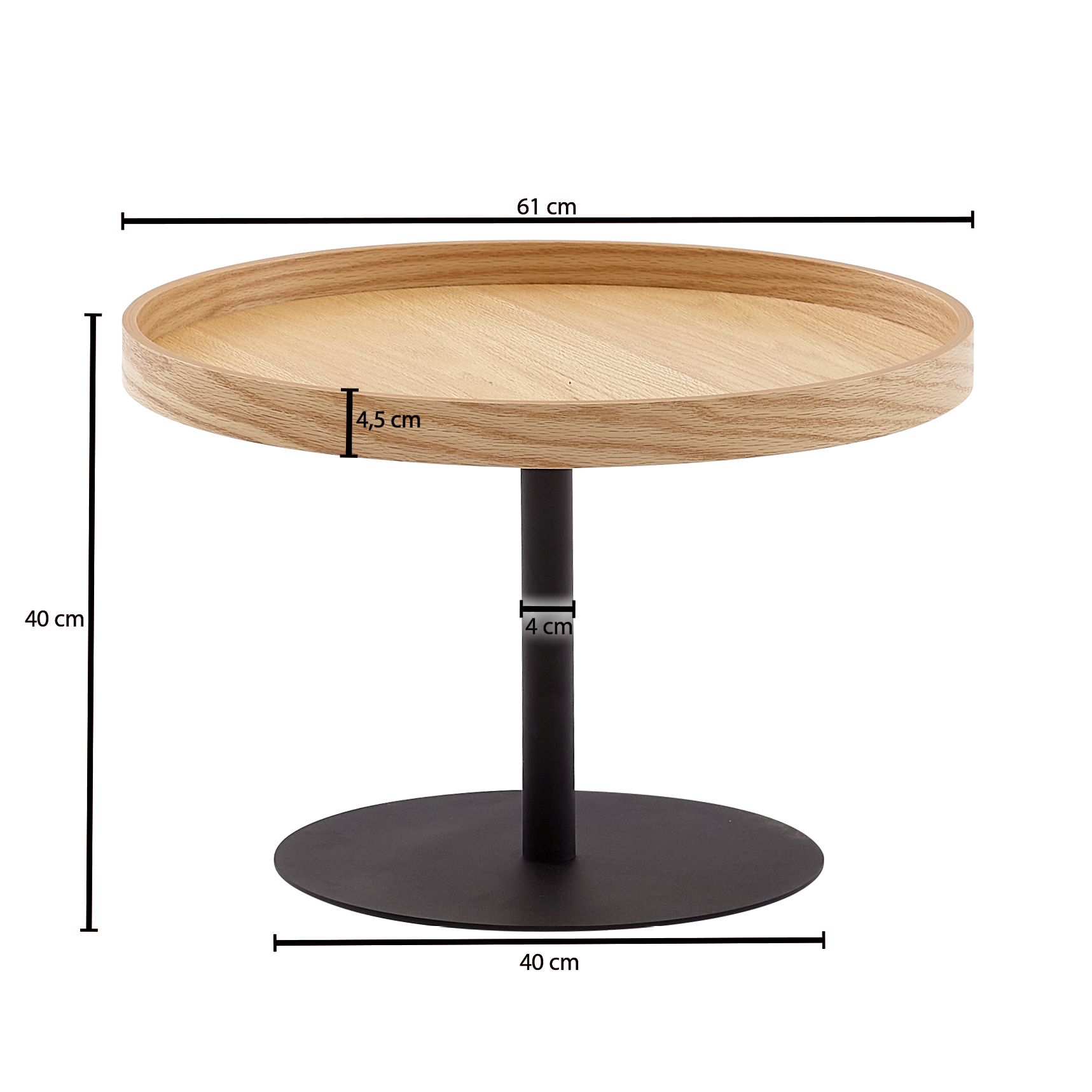 MATERIAL ✔ Die Tischplatte besteht aus MDF. Der Rand der Tischplatte ist aus Tulpenholz. Beide Komponenten sind mit echtem Eichenholz furniert. Das Gestell ist aus pulverbeschichtetem Stahl.