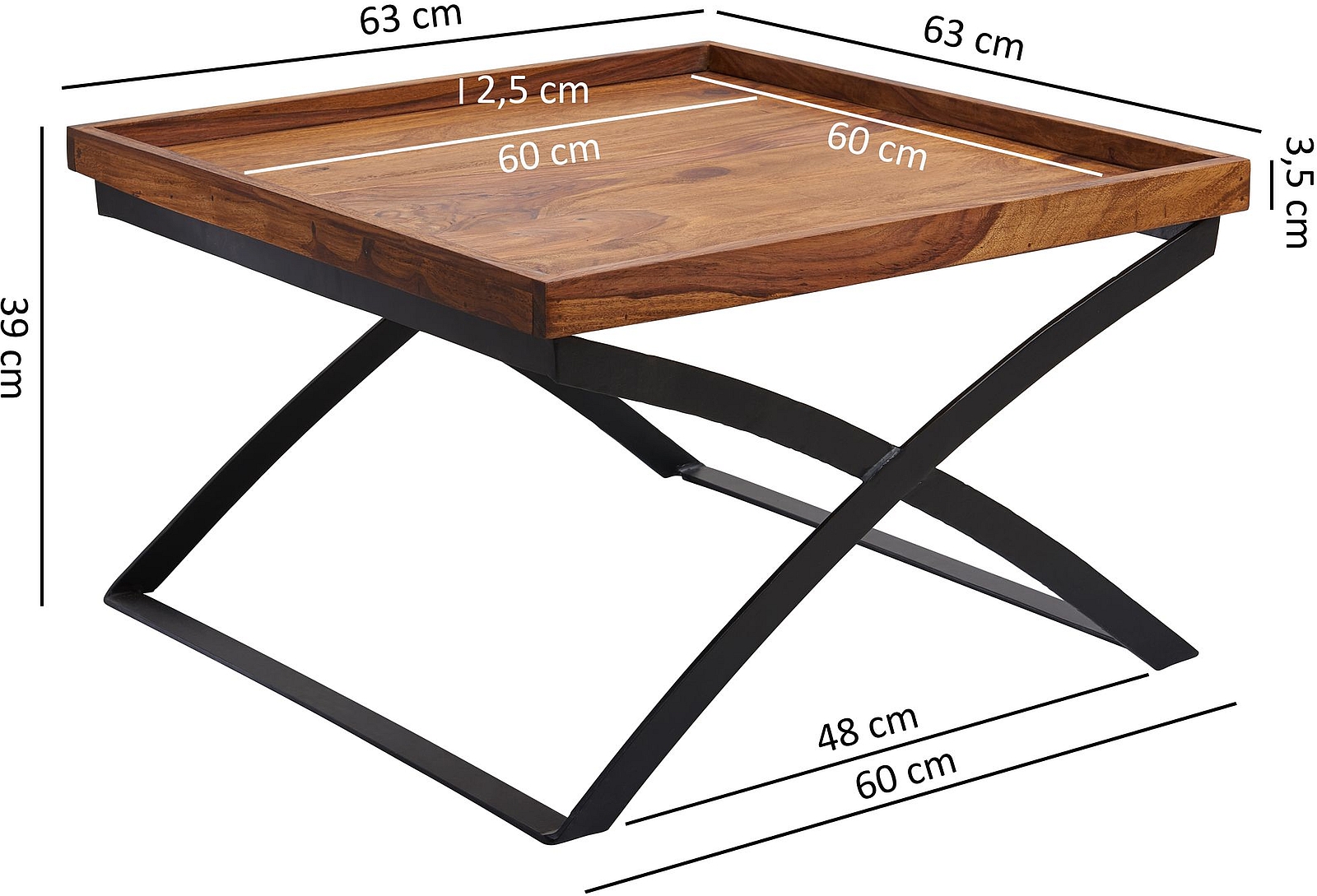 - COUCHTISCH MIT SCHWUNG ✔ Extravaganter Wohnzimmertisch im angesagten Industrial-Stil. Die zwei über Kreuz verlaufenden Beine sorgen nicht nur für einen sicheren Stand, sondern sehen zudem auch noch sehr ansprechend aus! Snacks, Fernbedienung, Zeitschriften und Co. finden auf der quadratischen Tischplatte aus Massivholz ihren Platz. Lehnen Sie sich zurück und genießen Sie Ihr Fernsehprogramm, während der Sofatisch alles Nötige griffbereit hält!