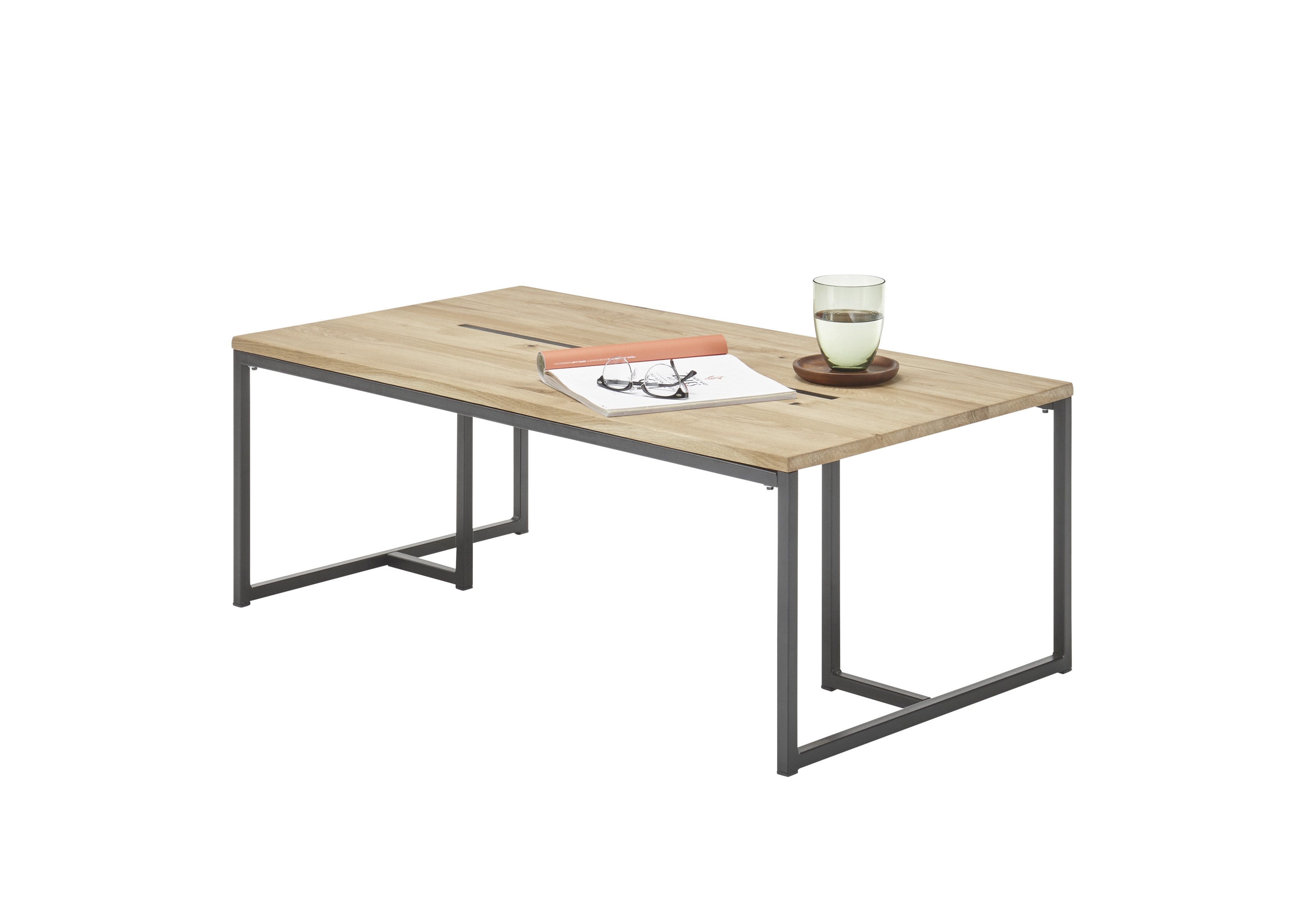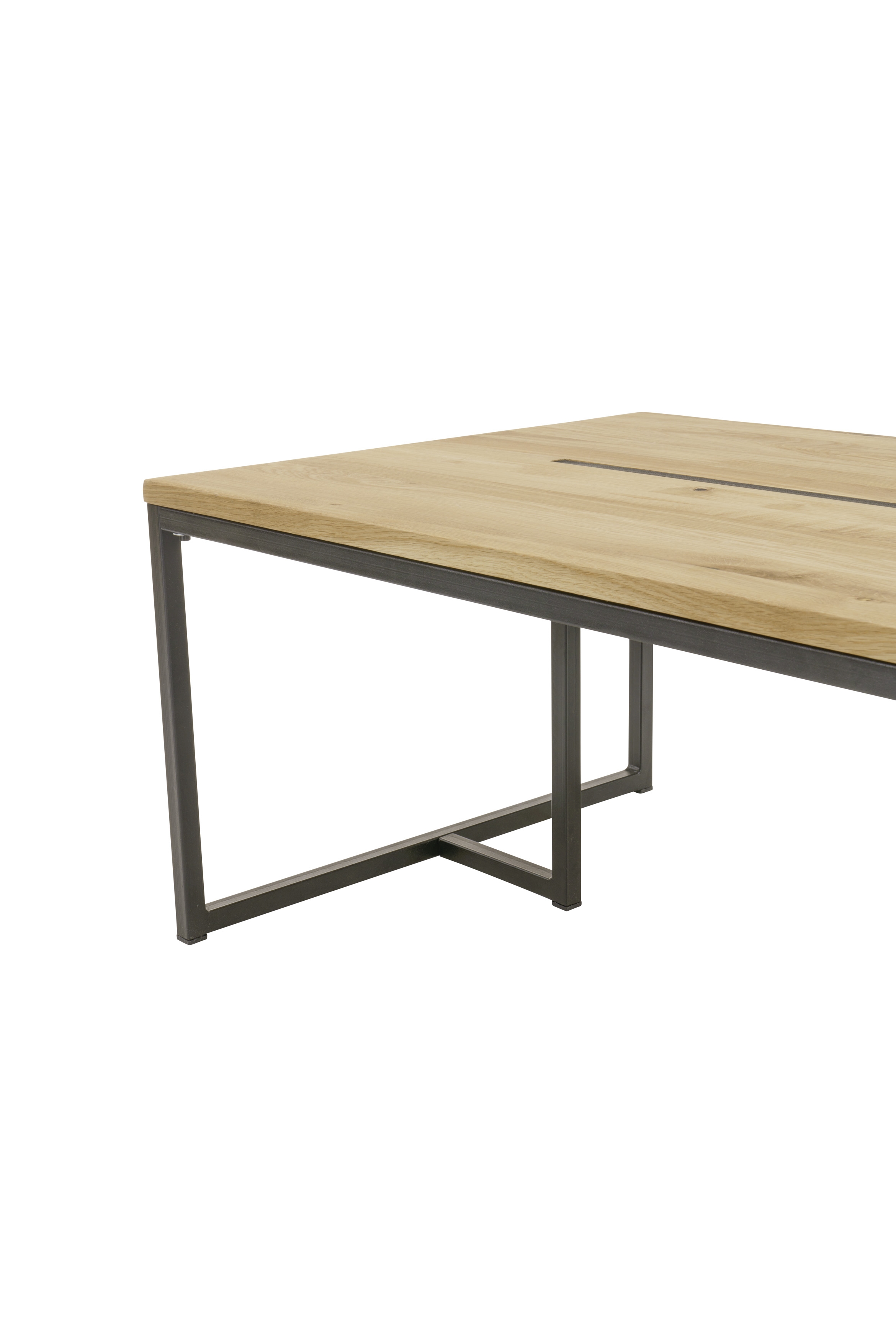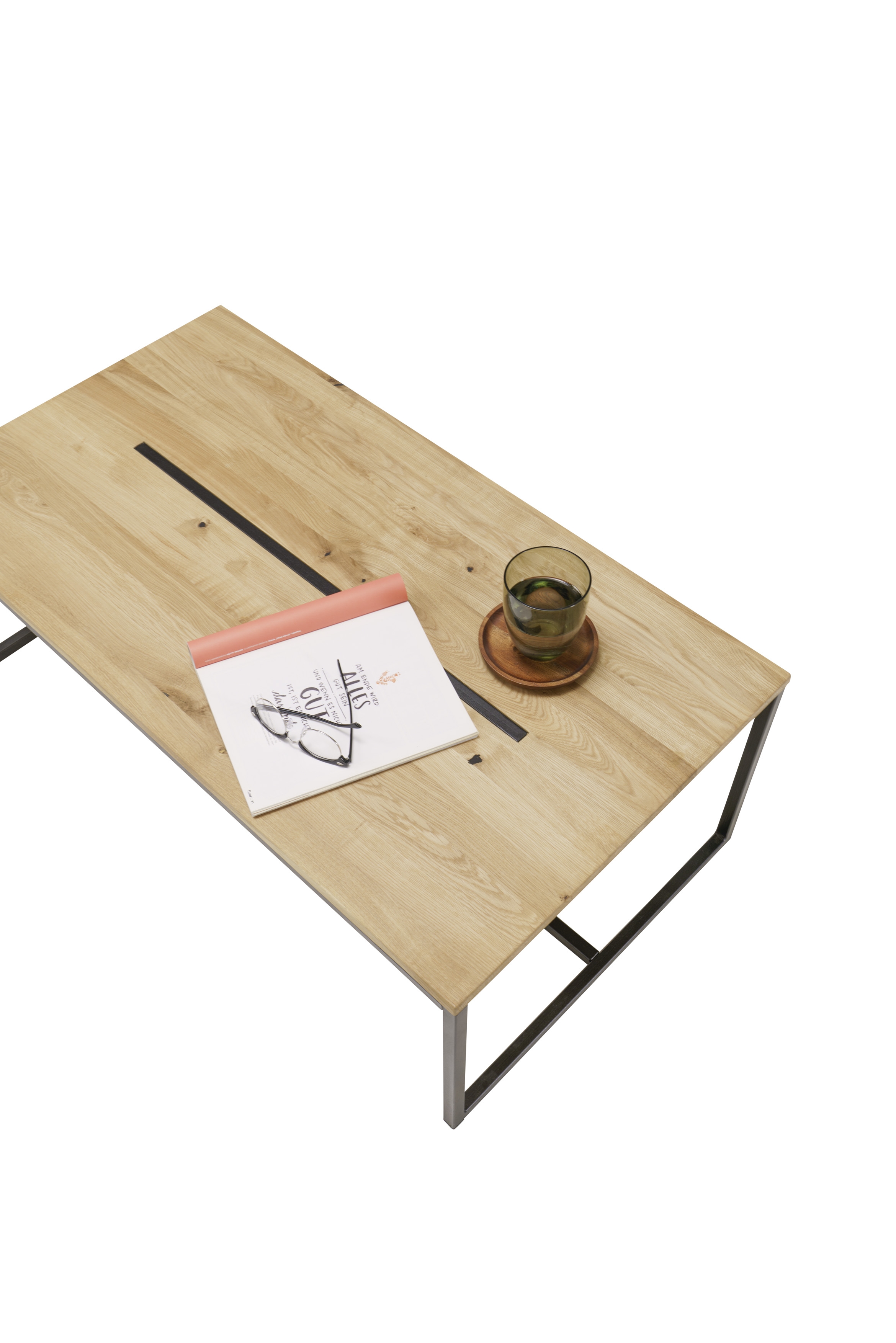 Tischplatte: Eiche massiv (Serbien) mit einer Einlage aus schwarzem Metall
