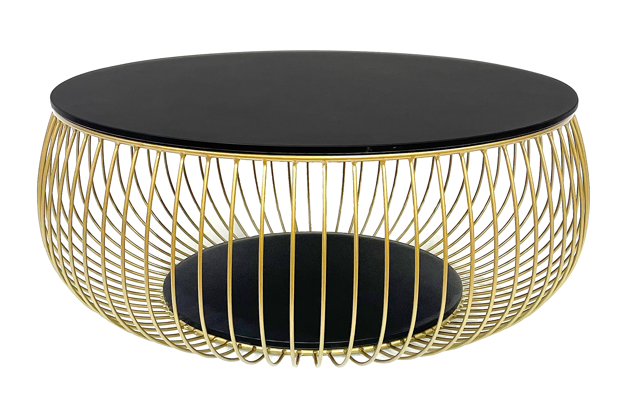 Der runde Couchtisch vereint modernes Design mit einer Portion Extravaganz. Die schwarz lackierte Klarglasplatte vervollständigt mit dem Gestell aus pulverbeschichtetem Metalldraht in Goldfarben den coolen monochromen Look. Der Sofatisch bietet genügend Ablagemöglichkeiten für z.B. Zeitschriften, Obst, Knabbereien oder eine Blumenvase. Durch sein attraktives Design und die runde Form ist dieser Couchtisch mit vielen Möbeln kombinierbar und findet auch in Ihrem Zuhause ein geeignetes Plätzchen. Die Oberfläche des Couchtisches ist sehr pflegeleicht und strapazierfähig. Kleinere Verschmutzungen können mit einem leicht feuchten Tuch entfernt werden.