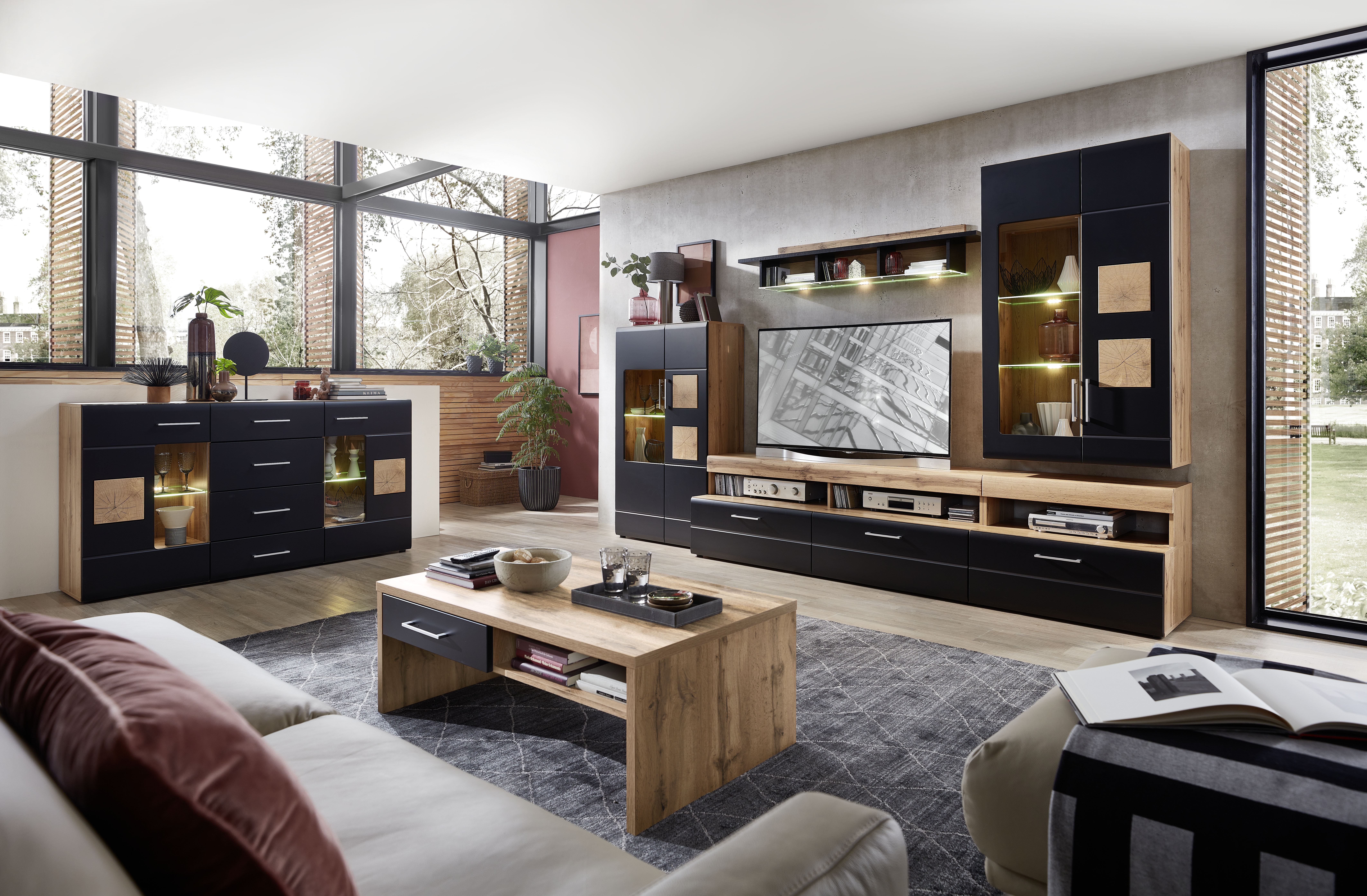 Eiche Altholz Holznachbildung kombiniert mit Lack Laminat schwarz supermatt