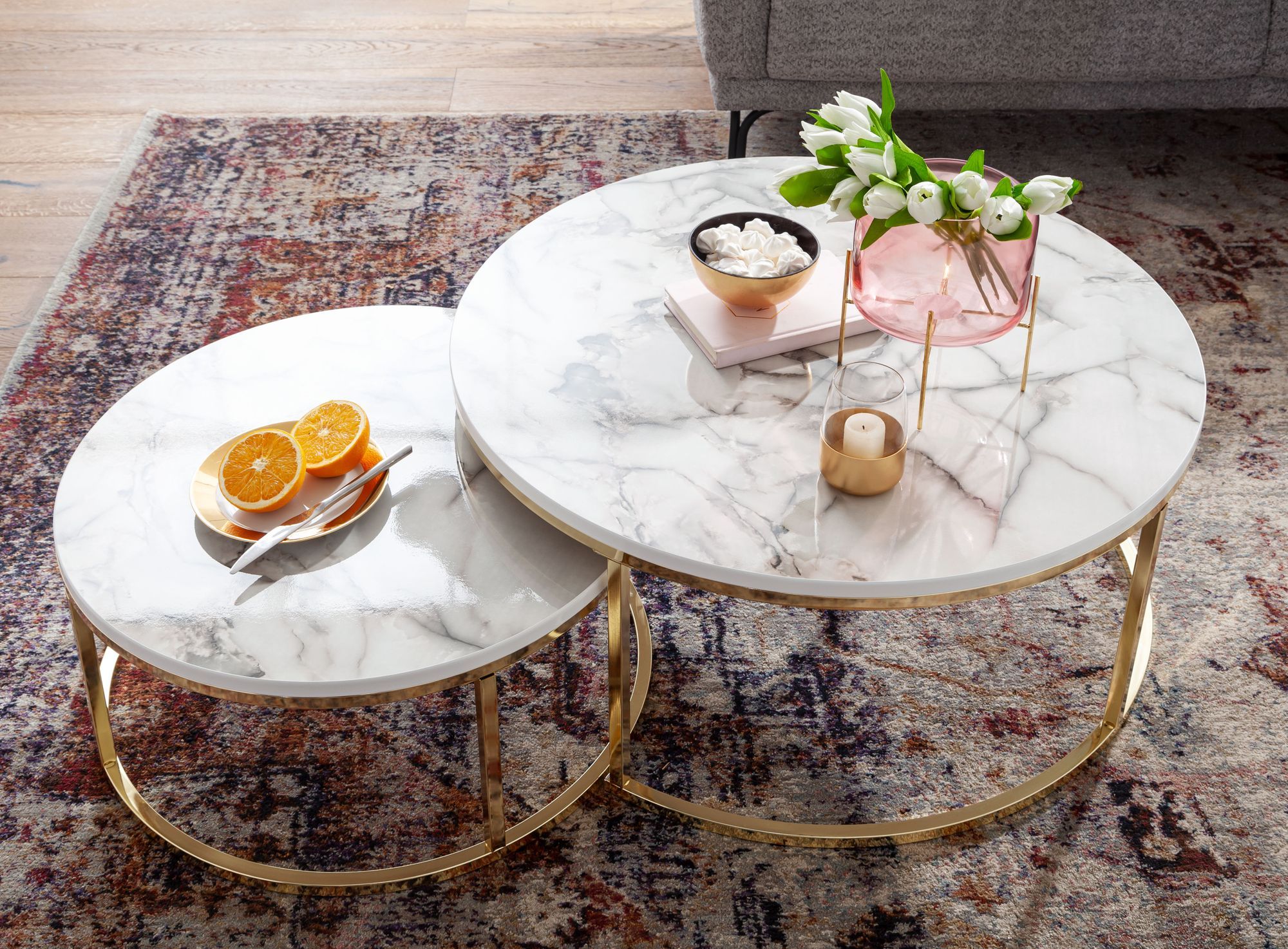 MATERIAL ✔ Tischplatten: foliertes MDF in weißer Marmor Optik mit schützender Polyresin-Beschichtung // Gestelle: lackierter Stahl.