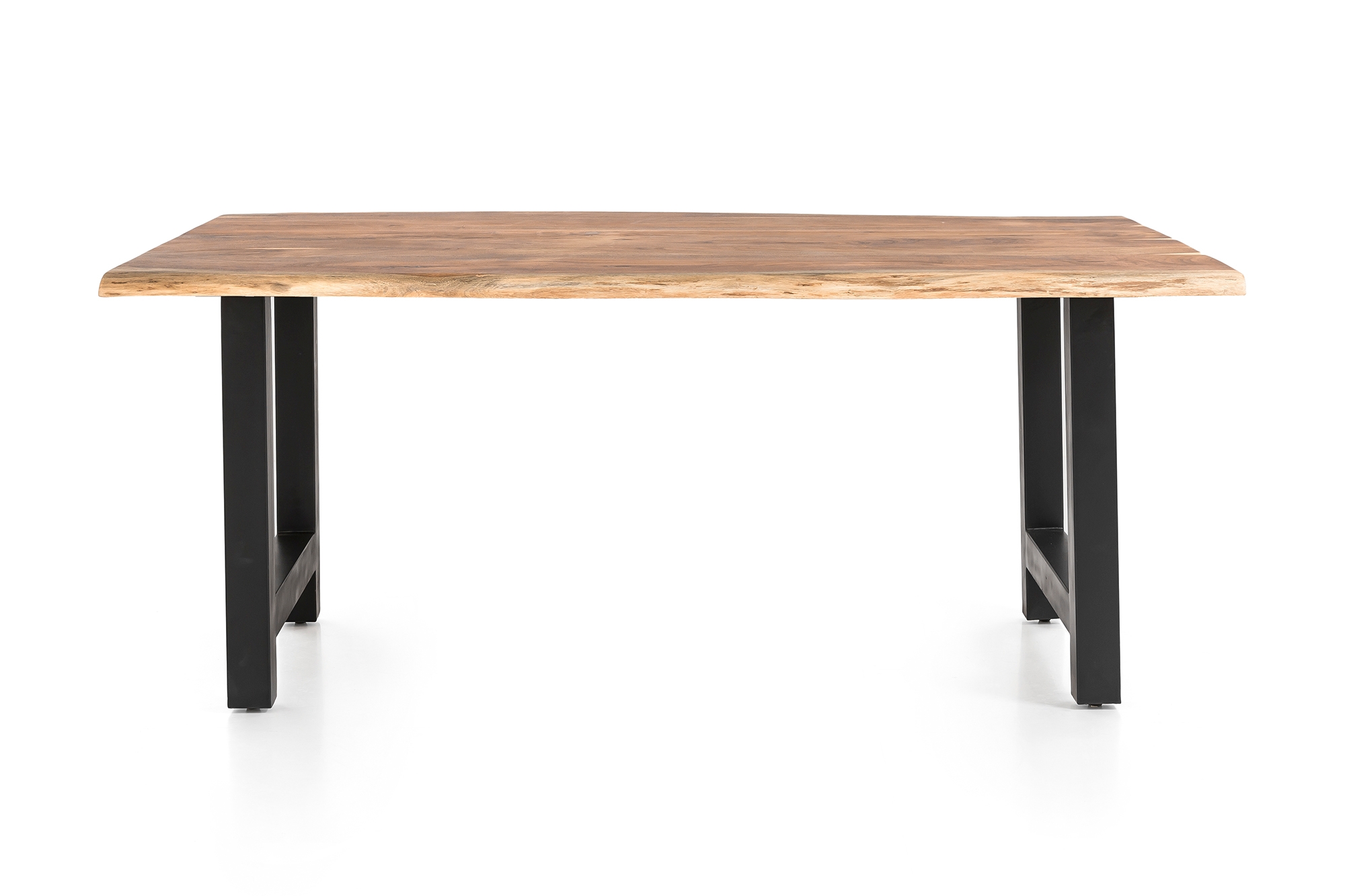Massivholzmöbel aus Akazie gehören zu den zeitlos schönen Möbeln, die niemals aus der Mode kommen. Die 35 mm starke Tischplatte mit natürlicher Formgebung besteht aus Akazienholz. Dies wurde geölt und zweifach gewachst, somit ist die Oberfläche unempfindlich und feuchtigkeitsabweisend. Das Gestell in H-Form aus schwarzem Metall verleiht dem Tisch eine sehr gute Stabilität und ist das passende Gegenstück zur schönen naturfarbenen Tischplatte. Dieser Esszimmertisch ist mehr als nur ein Sitzplatz zum Essen. Holen Sie sich ein Stück Natur in die eigenen vier Wände. Hinweis:Da es sich bei diesem Massivholztisch um ein Naturprodukt handelt, kann es zu Astlöchern oder unterschiedlichen Farbschmückungen kommen, welche jedoch keine Fehler darstellen, sondern den individuellen Charakter des Echtholzes unterstreichen.Auch die Tiefe kann aufgrund der natürlichen Formgebung variieren. Alle diese Unterschiede machen diesen Esszimmertisch zu einem echten Unikat.