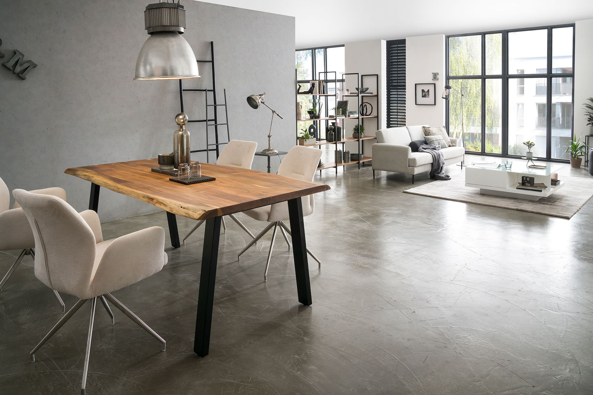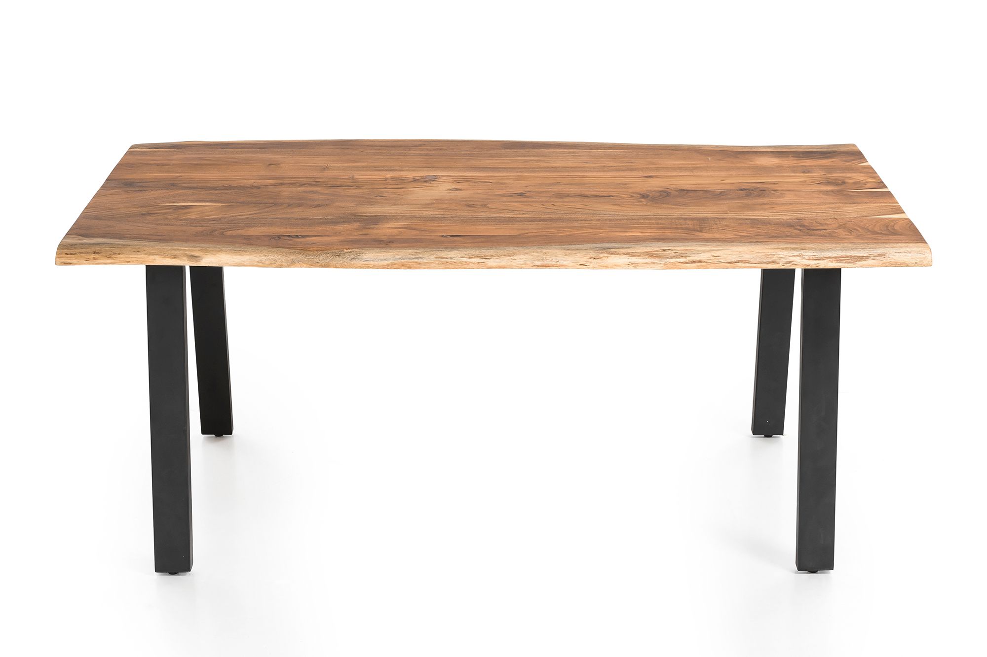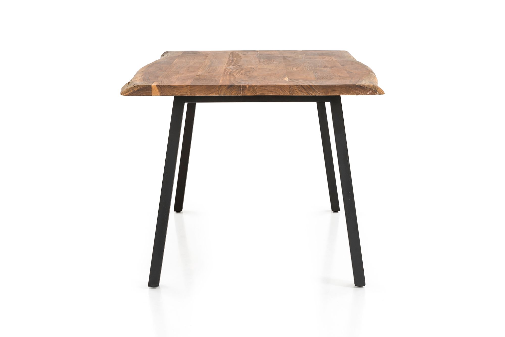 Massivholzmöbel aus Akazie gehören zu den zeitlos schönen Möbeln, die niemals aus der Mode kommen. Die 35 mm starke Tischplatte mit natürlicher Formgebung besteht aus Akazienholz. Dies wurde geölt und zweifach gewachst, somit ist die Oberfläche unempfindlich und feuchtigkeitsabweisend. Das stabile Gestell aus pulverbeschichtetem Metall in Mattschwarz verleiht dem Tisch eine sehr gute Stabilität und ist das passende Gegenstück zur schönen naturfarbenen Tischplatte. Dieser Esszimmertisch ist mehr als nur ein Sitzplatz zum Essen. Holen Sie sich ein Stück Natur in die eigenen vier Wände. Hinweis: Da es sich bei diesem Massivholztisch um ein Naturprodukt handelt, kann es zu Astlöchern oder unterschiedlichen Farbschmückungen kommen, welche jedoch keine Fehler darstellen, sondern den individuellen Charakter des Echtholzes unterstreichen. Auch die Tiefe kann aufgrund der natürlichen Formgebung variieren. Alle diese Unterschiede machen diesen Esszimmertisch zu einem echten Unikat.