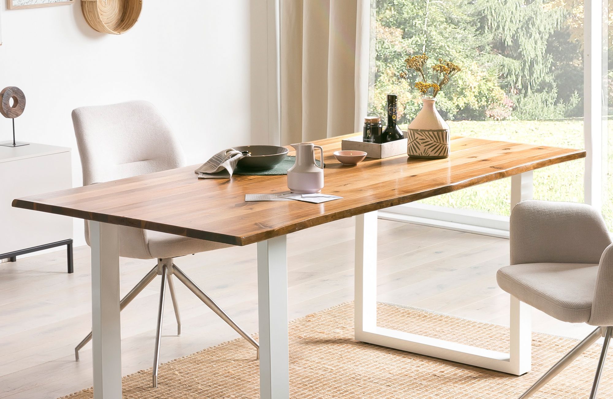 Massivholzmöbel aus Akazienholz gehören zu den zeitlos schönen Möbeln, die niemals aus der Mode kommen. Die 26 mm dicke Tischplatte besteht aus Akazienholz und wird mit ihrer Oberfläche mit sichtbarer Maserung und Astlöchern zum absoluten Hingucker. Besonderes Highlight: Das U-Gestell aus weiß lackiertem Metall verleiht dem Tisch eine sehr gute Stabilität und ist das passende Gegenstück zur Tischplatte in warmem Naturton. Dieser Esszimmertisch ist mehr als nur ein Sitzplatz zum Essen. Holen Sie sich ein Stück Natur in die eigenen vier Wände. Achtung: Da es sich bei diesem Massivholztisch um ein Naturprodukt handelt, kann es zu Astlöchern oder unterschiedlichen Farbschmückungen kommen, welche jedoch keine Fehler darstellen, sondern den individuellen Charakter des Echtholzes unterstreichen.