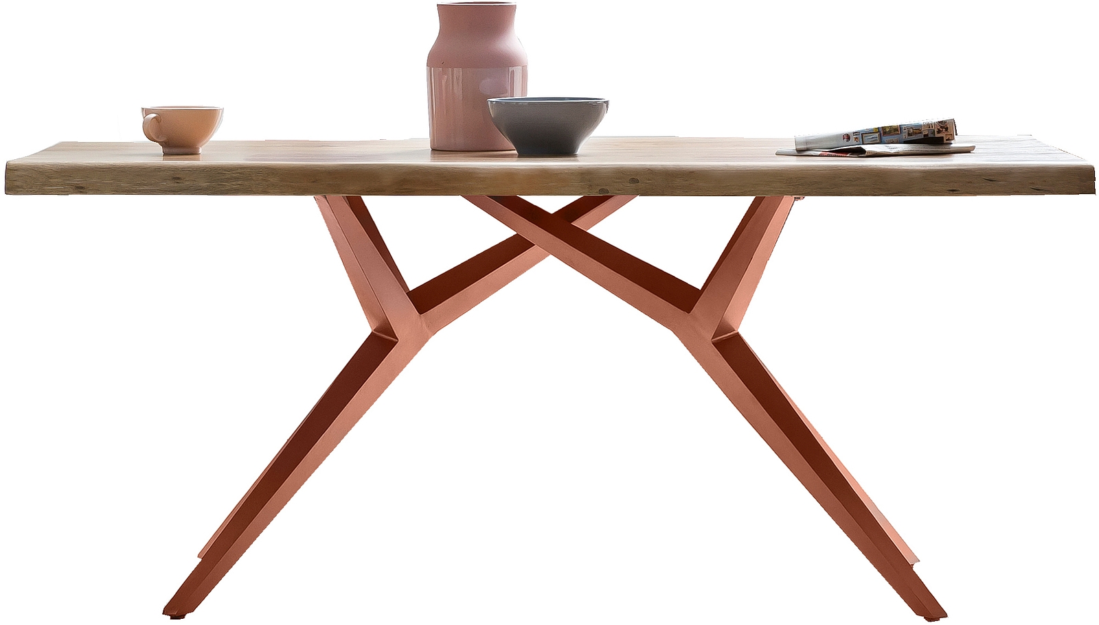 Tischplatte: Akazie massiv (Indien) mit Baumkante wie gewachsen, gebeizt, lackiert und gewachst