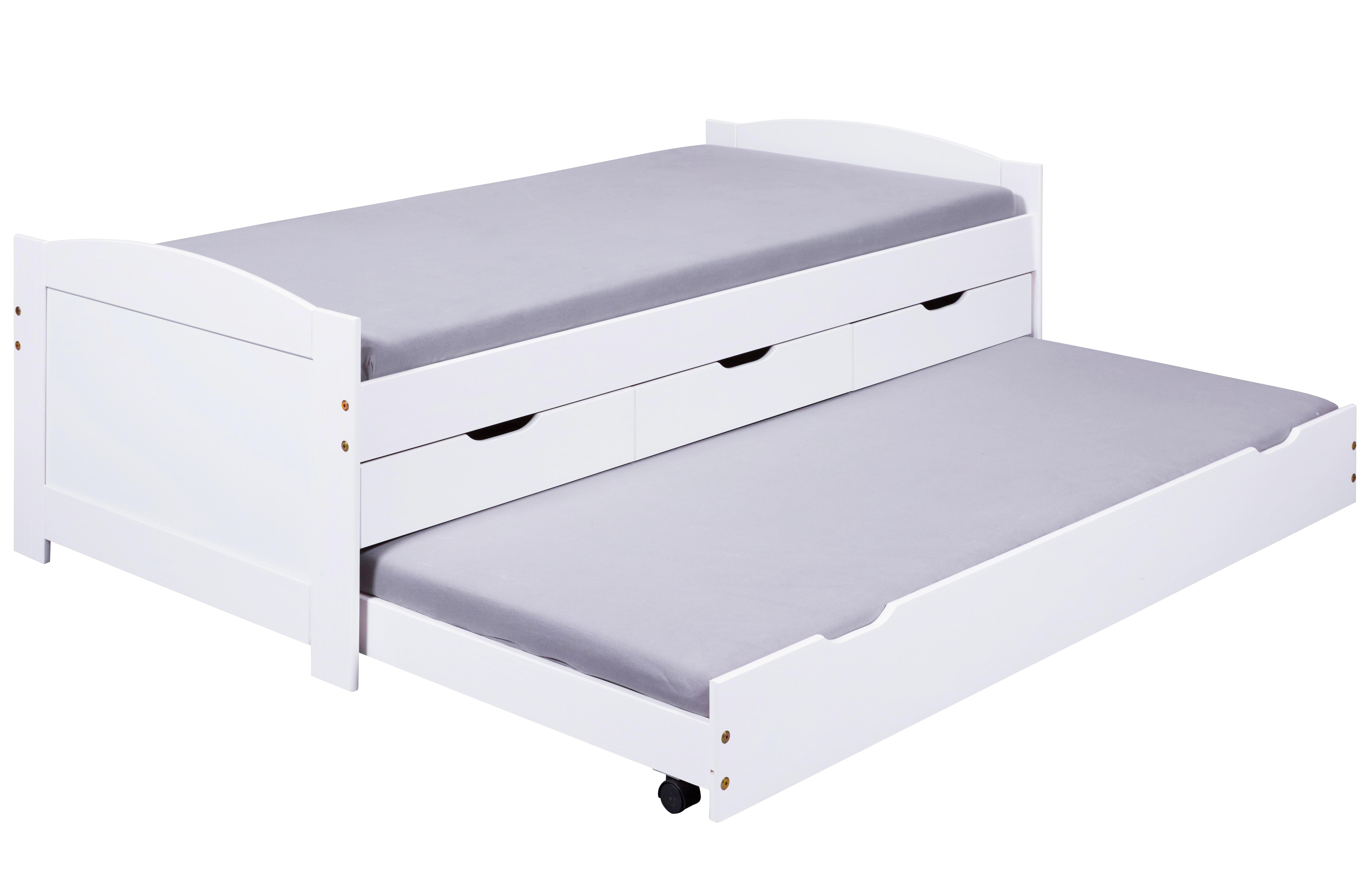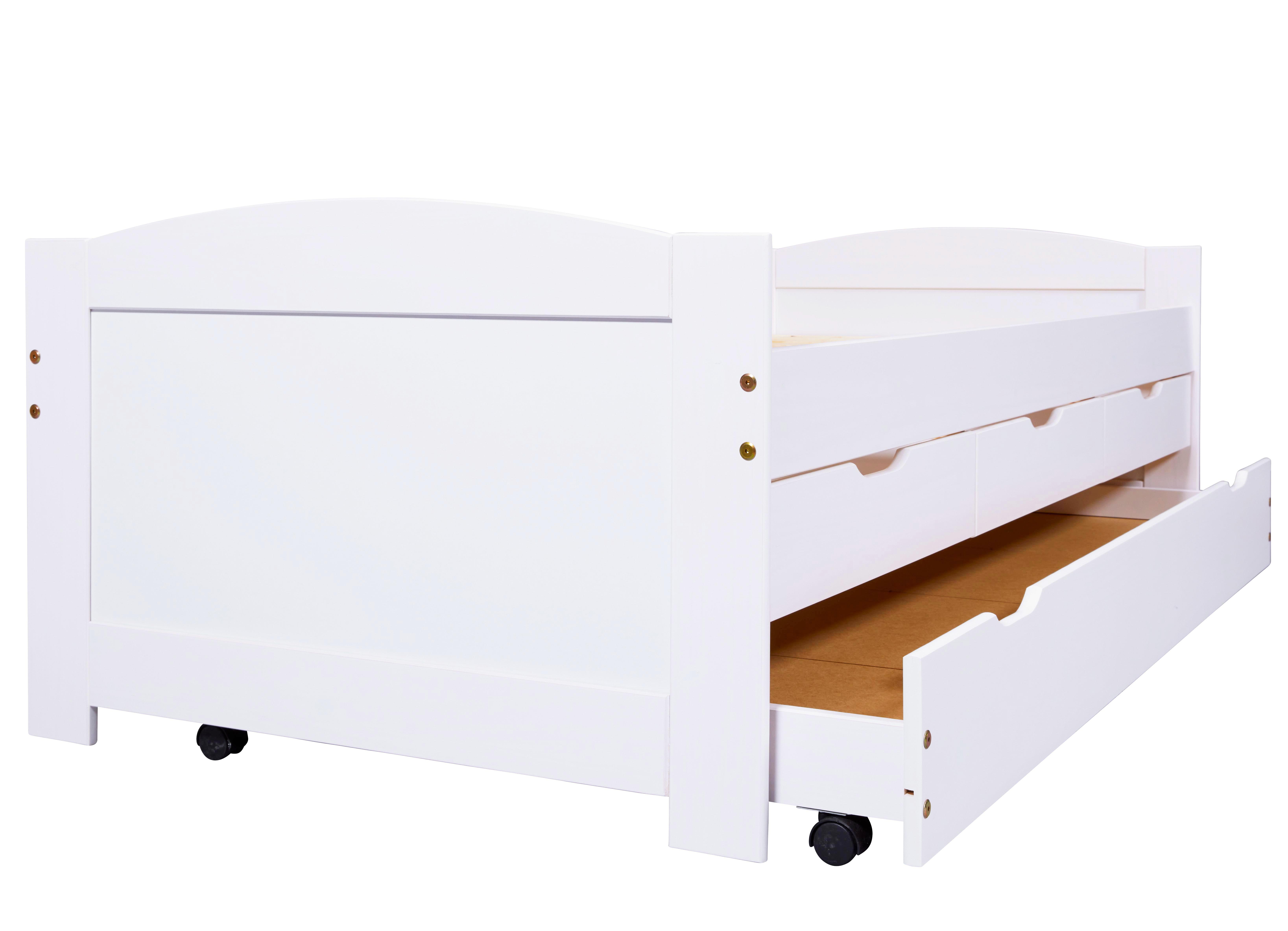 Während bei vielen Betten der Raum unter dem Bett ungenutzt bleibt, nutzt Ulli diesen Raum optimal mit einem cleveren Schubladensystem. Das Funktionsbett ist vollständig verblendet, wodurch Staubansammlungen unter dem Bett minimiert werden. Das Bett verfügt über 3 praktische Schubladen, in denen Bettbezüge, Decken oder andere Utensilien direkt verstaut werden können. Der widerstandsfähige weiße Lack ist wasserabweisend und besonders pflegeleicht. Durch die weiße Farbgebung wird die natürliche Holzmaserung der Kiefer leicht sichtbar und sorgt für einen charmanten, natürlichen Look.