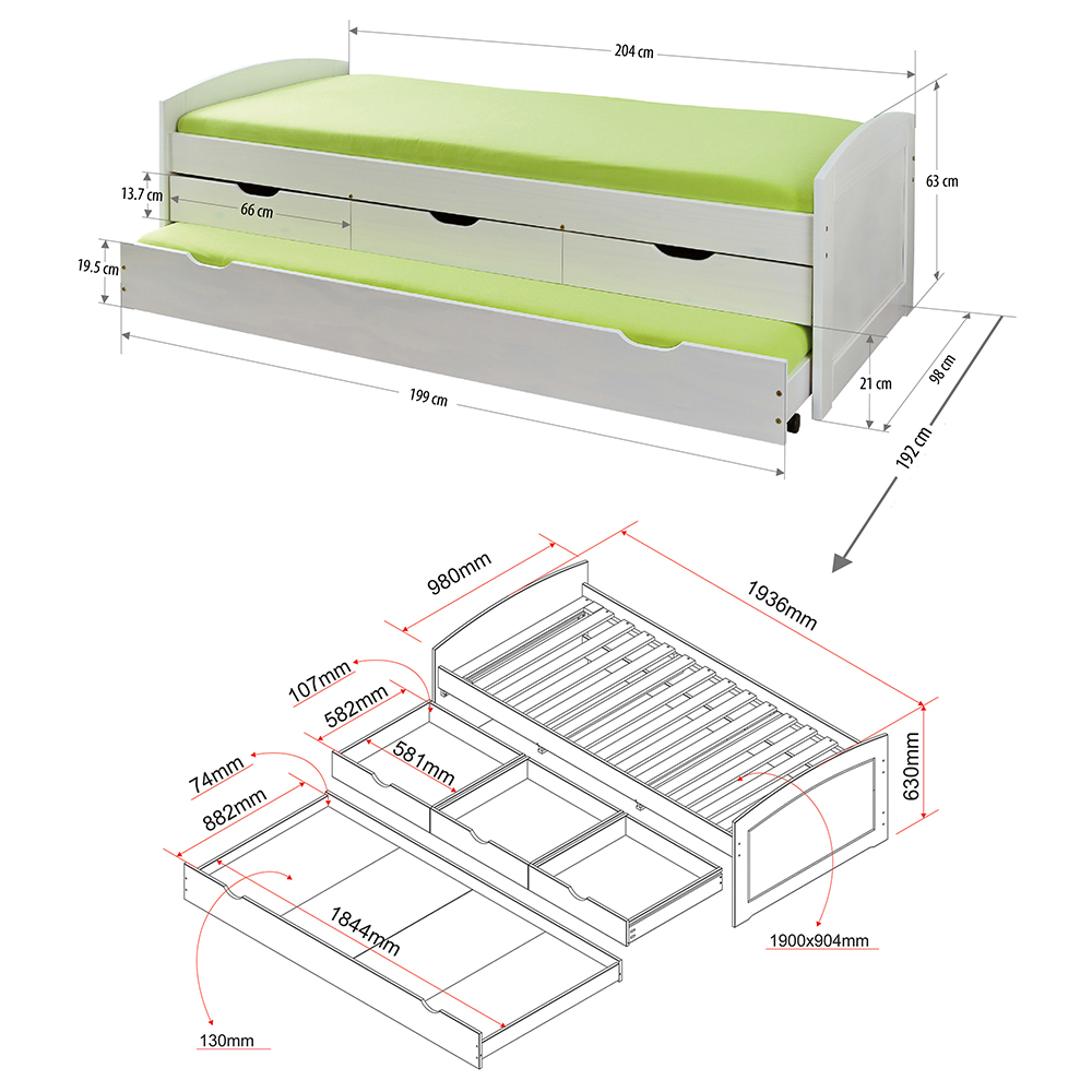 2 Liegeflächen; das Unterteil ist auf Rollen ausziehbar für eine zweite Schlafmöglichkeit