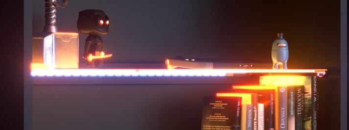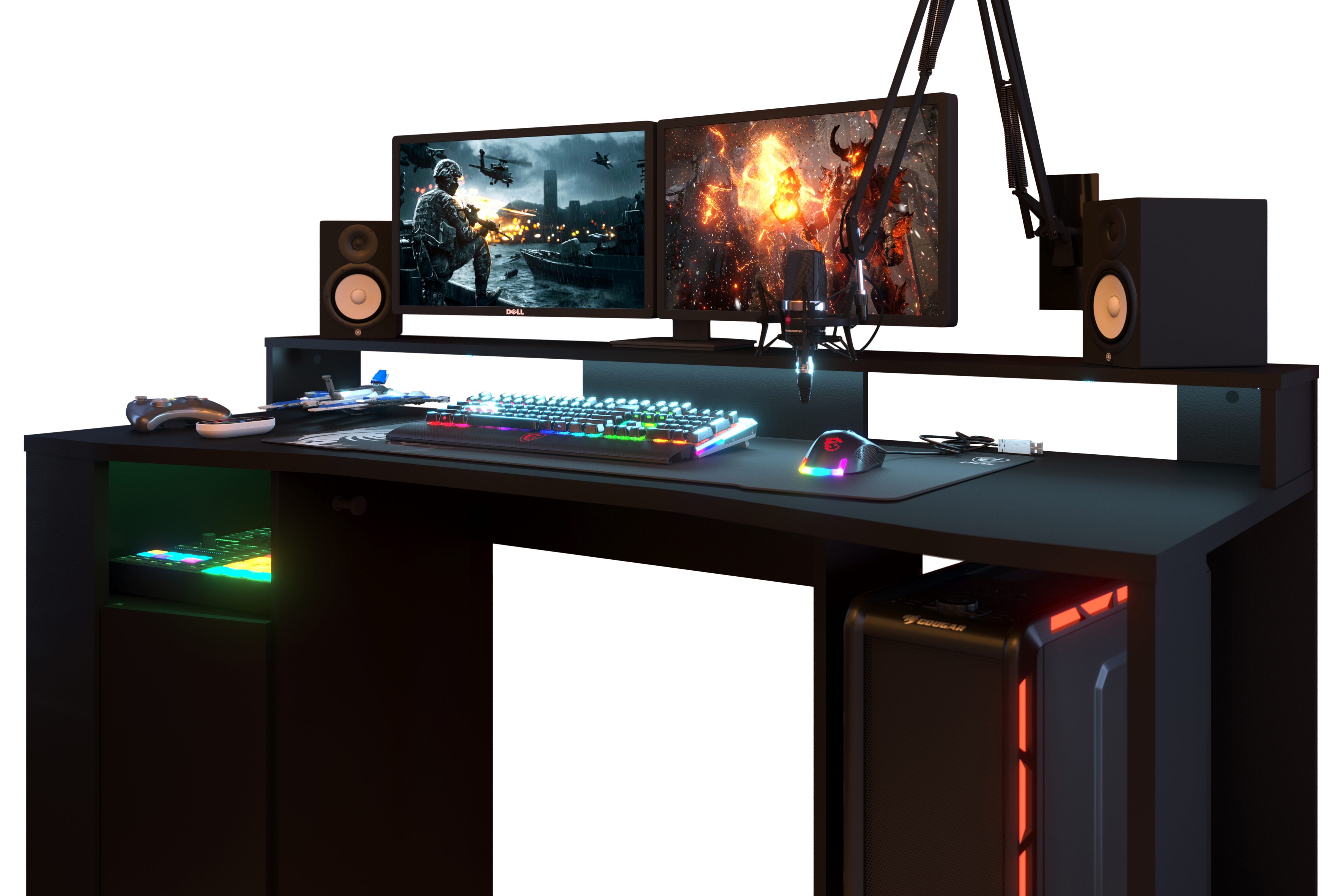 oben: große Abstellfläche für bis zu 3 Bildschirme, LED-Beleuchtung mit Farbwechsel unterhalb der Abstellfläche