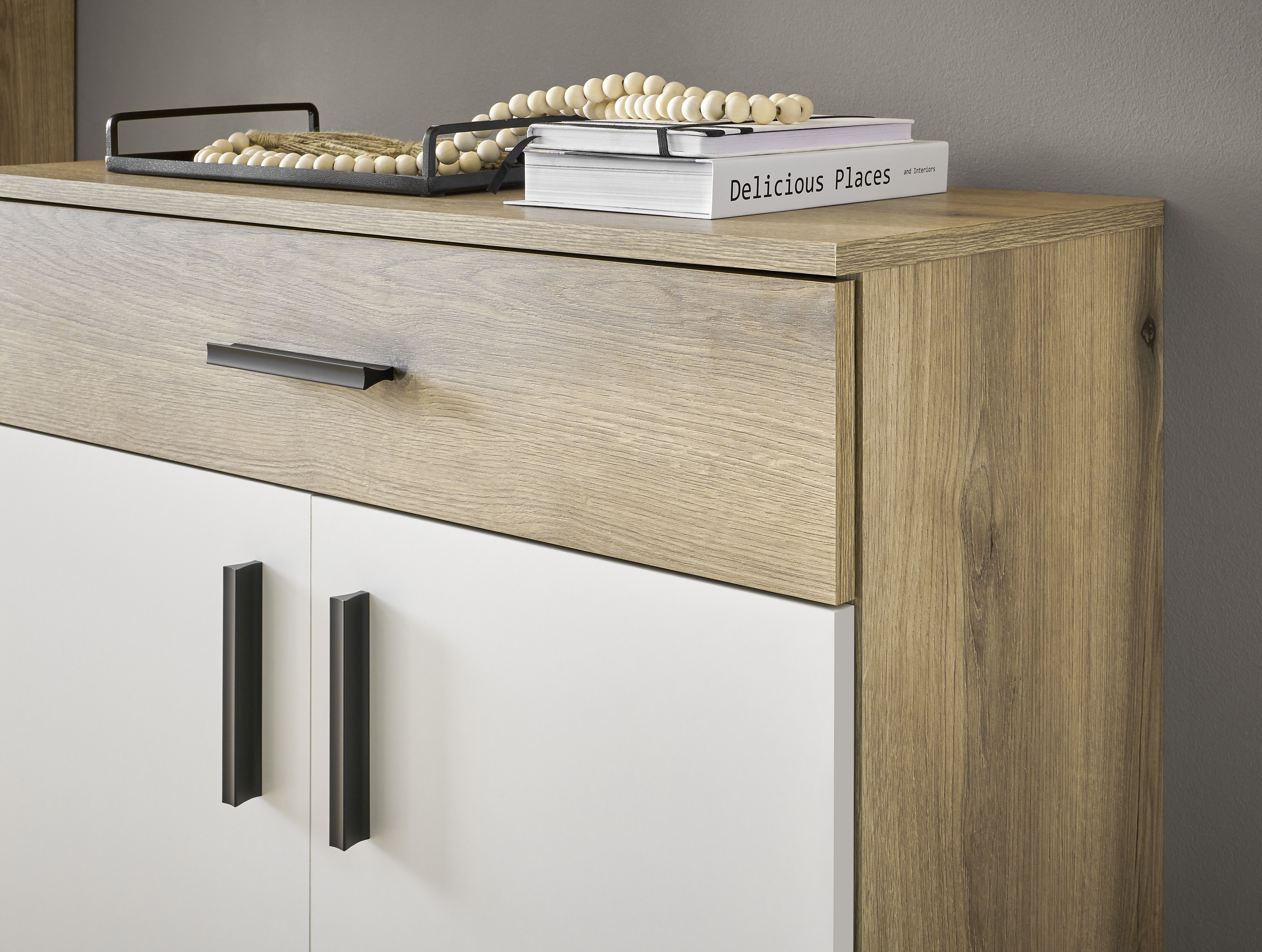 Front: Weiß mit Absetzungen in Evoke Coast Holznachbildung, Spanplatte Melaminbeschichtung