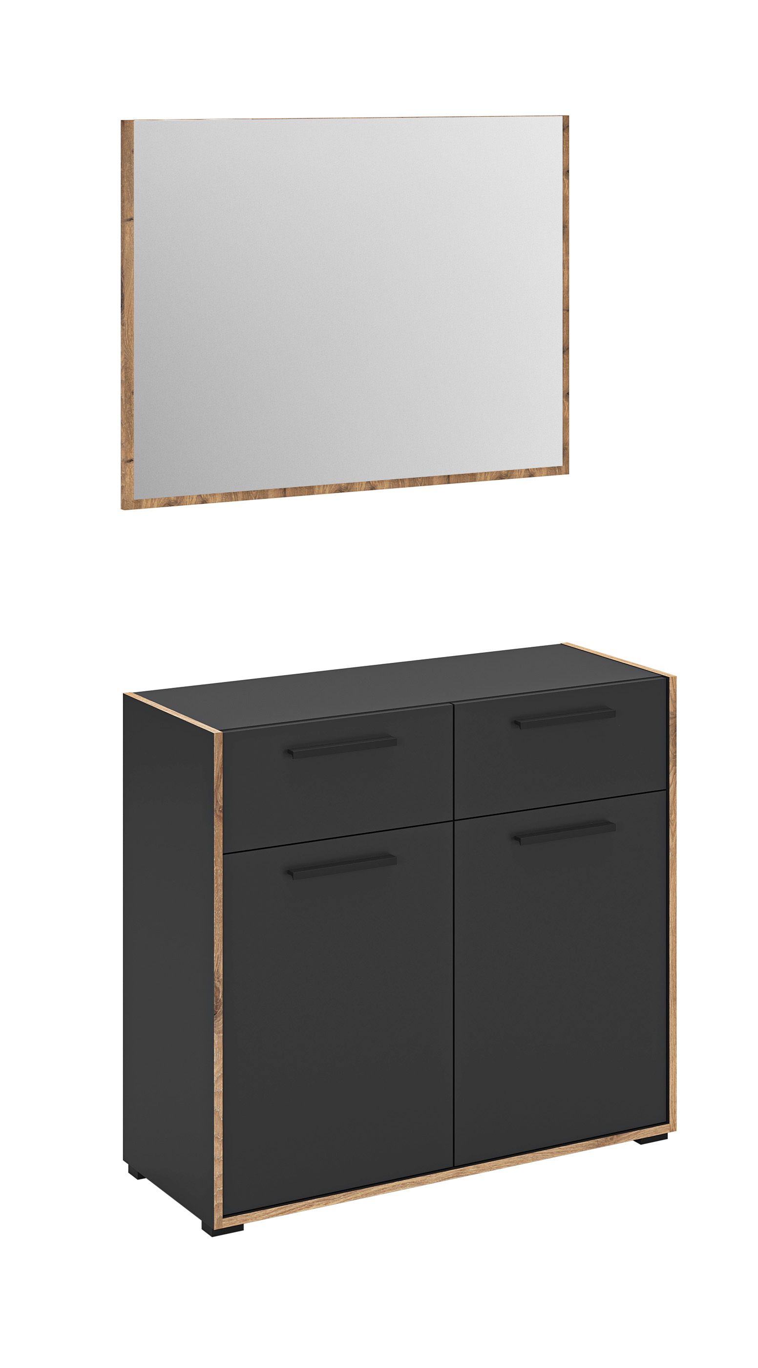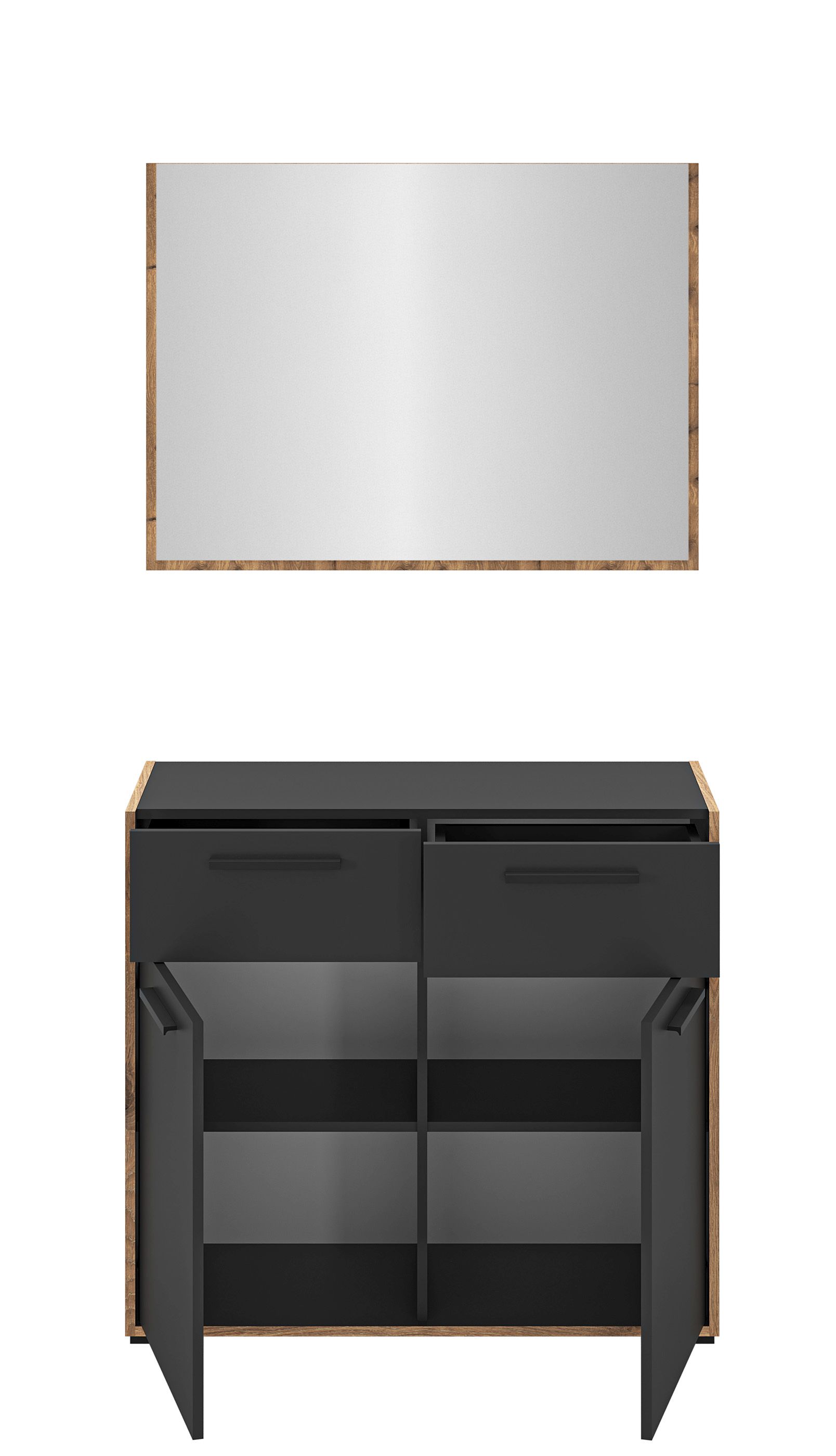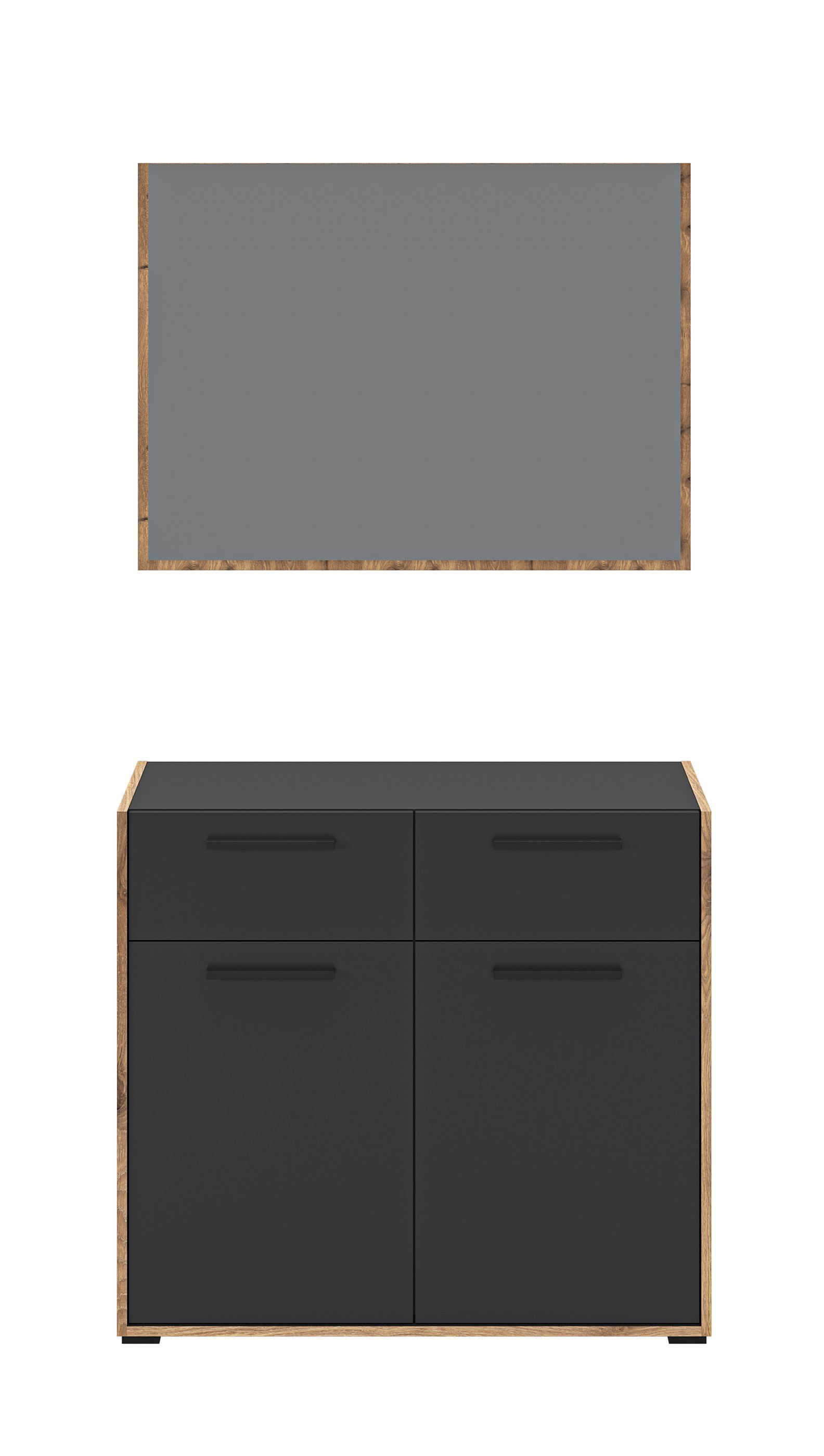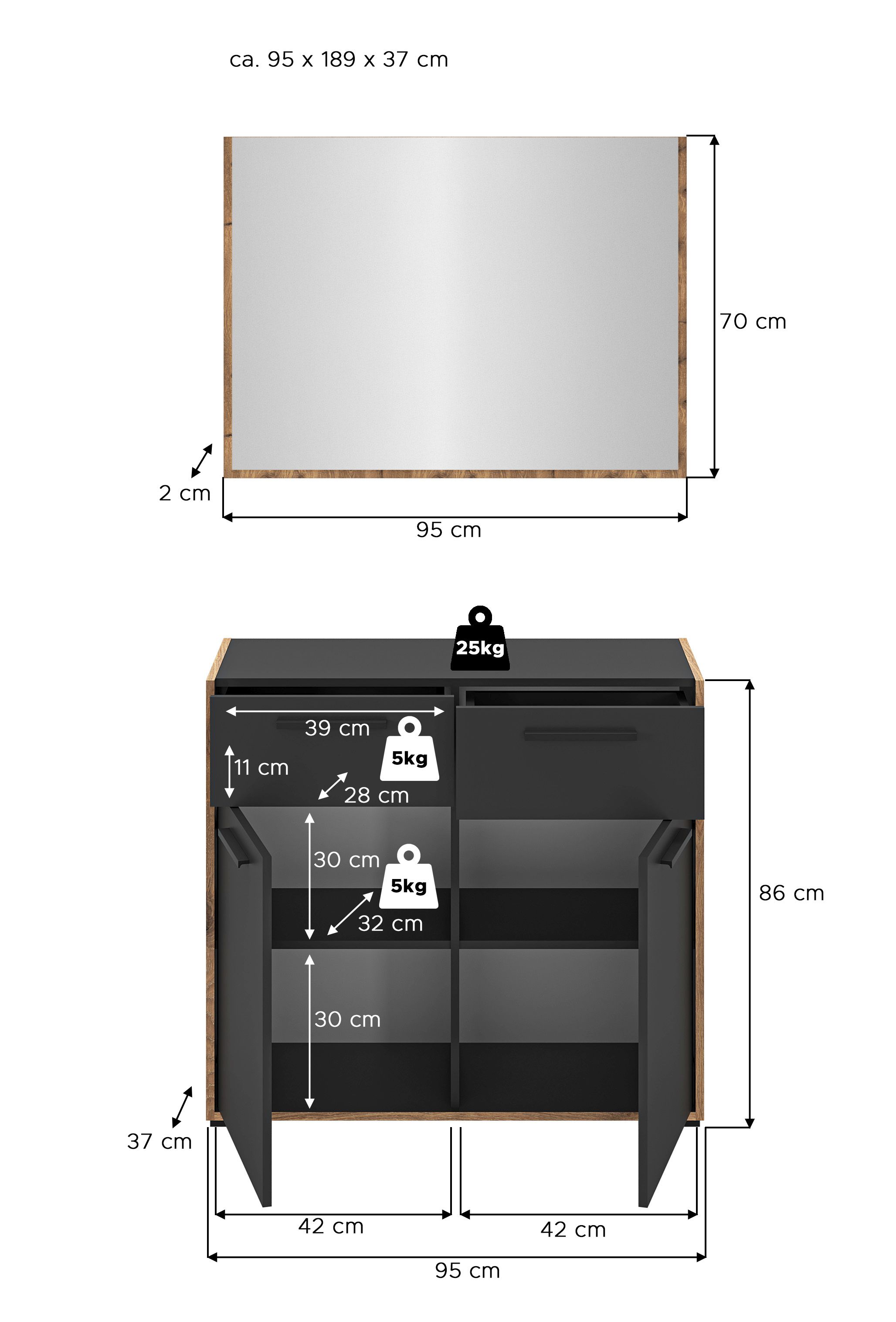 Diese Garderobenkombination in elegantem Basalt Melamin vereint Funktionalität und modernes Design. Mit den Maßen 95x189x37 cm bietet sie ausreichend Platz für Ihre Garderobe. Die Kombination aus einer Kommode und einem Spiegel schafft praktische Ordnung und einen stilvollen Eingangsbereich. Die pflegeleichten Oberflächen gewährleisten eine einfache Reinigung und langanhaltende Schönheit. Perfekt, um Ihren Flur aufgeräumt und einladend zu gestalten. Vertrauen Sie auf ein Produkt, das durch seine stabile Bauweise und hochwertige Verarbeitung überzeugt und bereits viele zufriedene Kunden begeistert hat. Gestalten Sie Ihren Eingangsbereich jetzt neu und erleben Sie den Unterschied im Alltag.