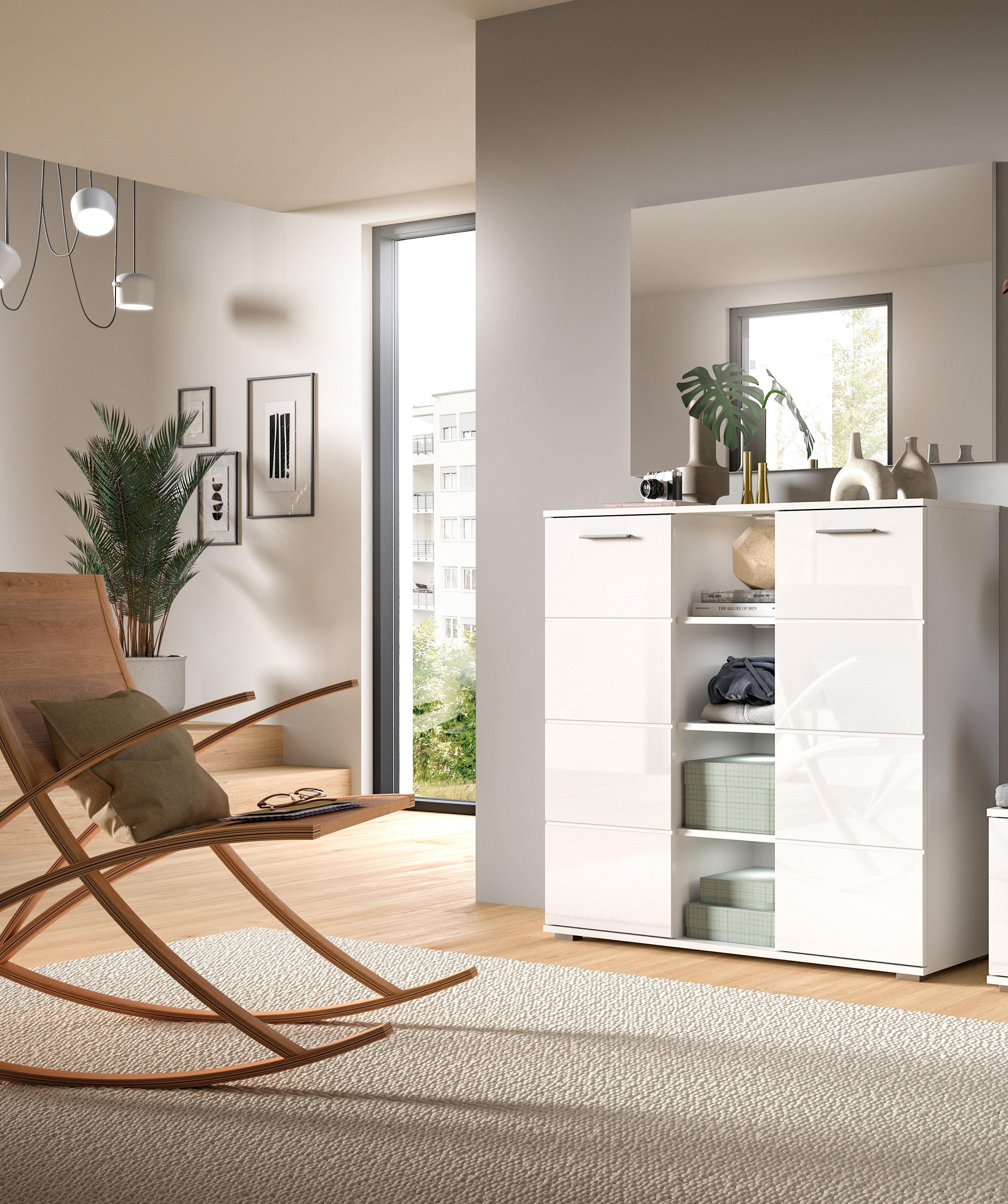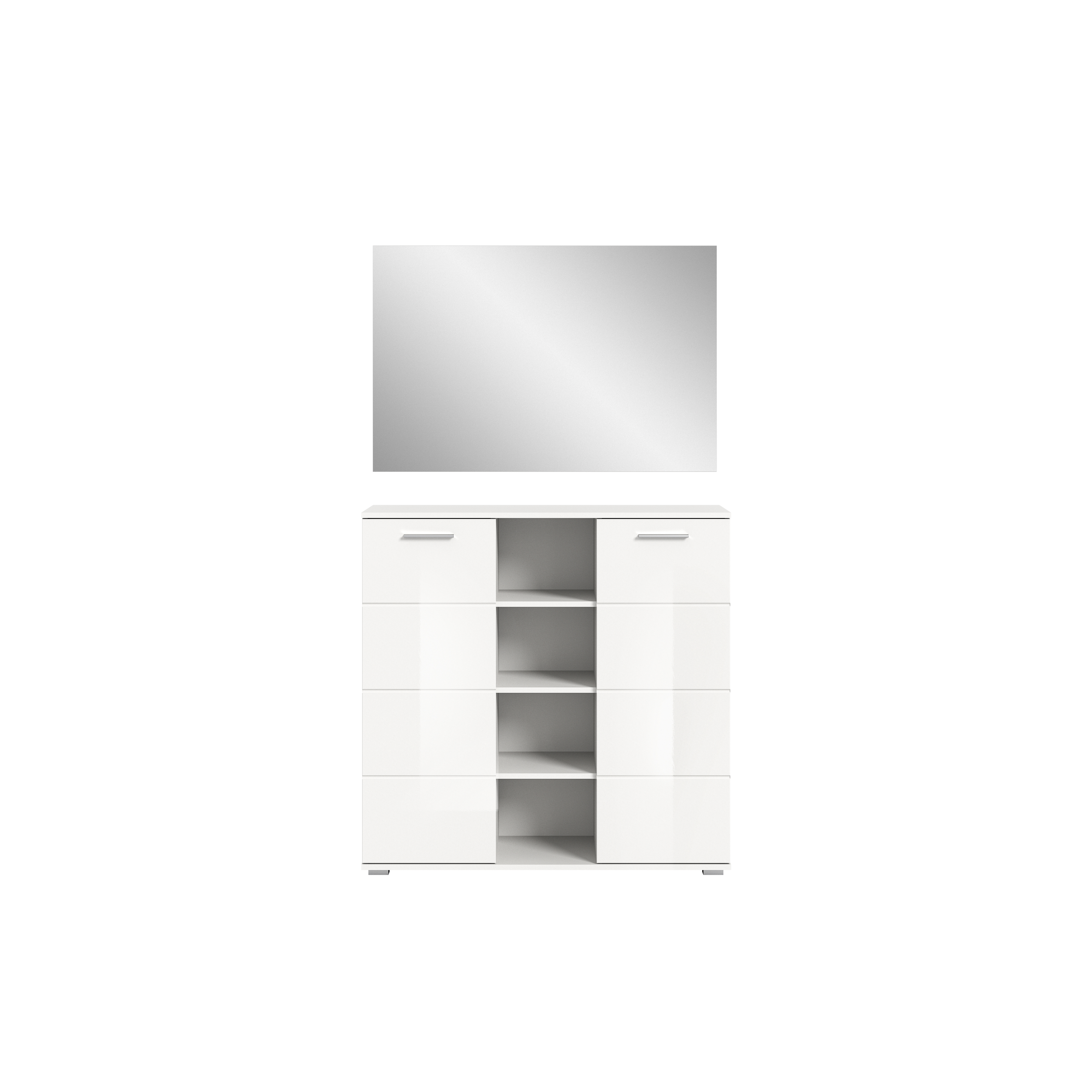 - Design/Stil: Die Garderobenkombination in Weiß Nachbildung und Weiß Hochglanz überzeugt mit ihrem modernen und eleganten Erscheinungsbild. Die Kombination aus glänzenden Fronten und einer matten Oberfläche verleiht der Garderobe ein ansprechendes Kontrastdesign, das sich perfekt in zeitgemäße Einrichtungskonzepte einfügt. Die klaren Linien und die minimalistische Gestaltung sorgen für eine zeitlose Eleganz, während die Griffe in Chromoptik einen Hauch von Raffinesse verleihen.