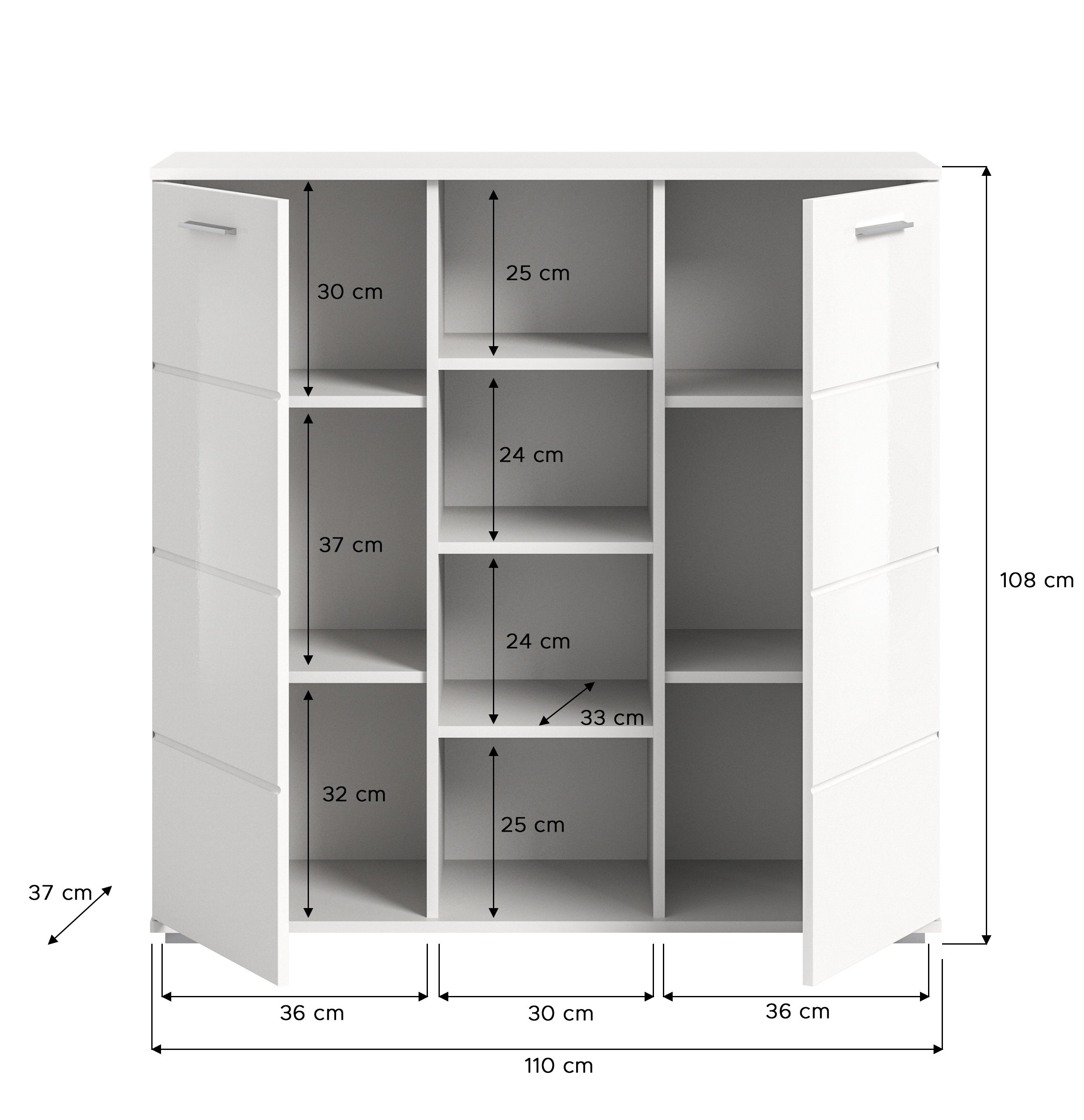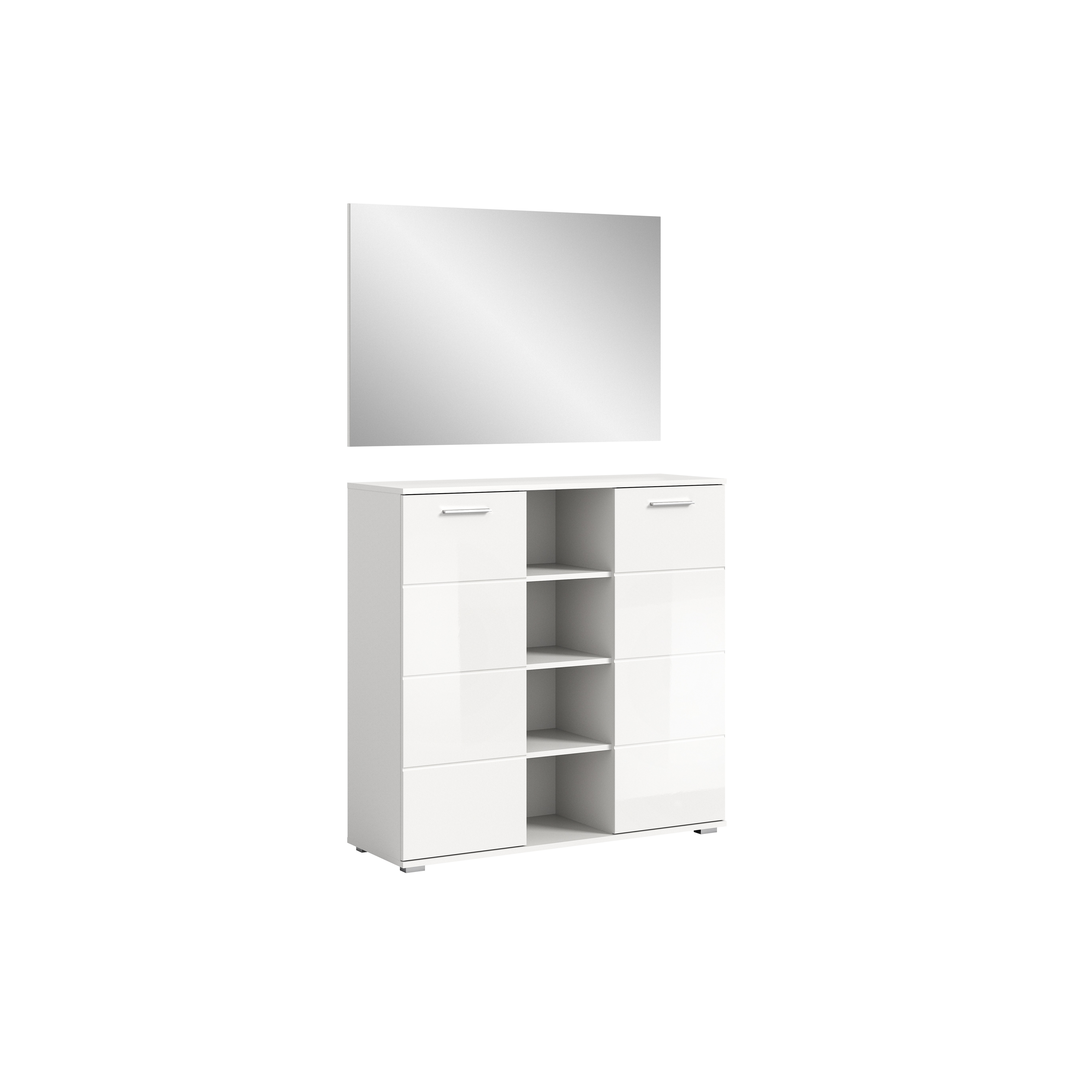 1 Schuhkommode mit 4 offenen Fächern, 2 Türen und 4 Einlegeböden