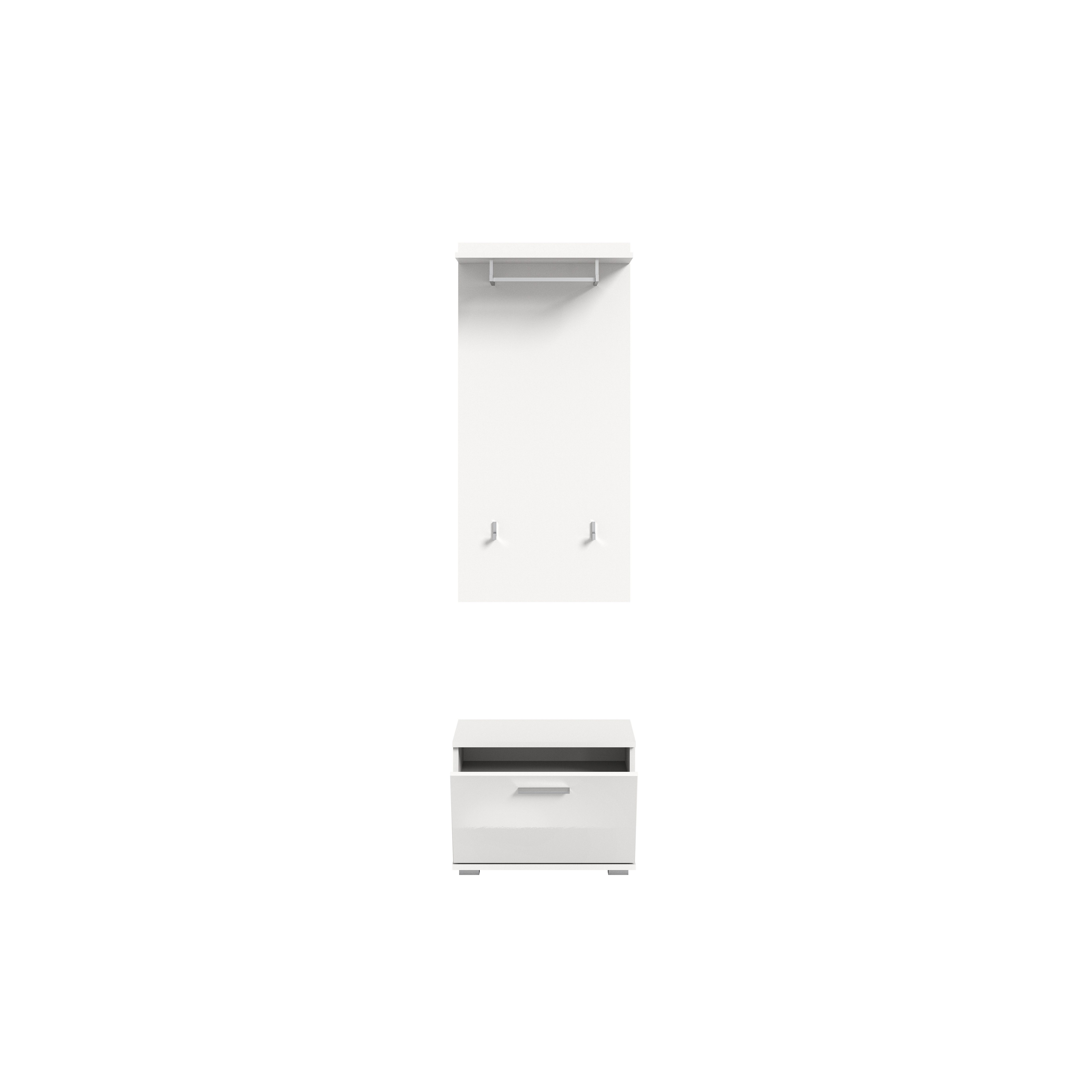 - Design/Stil: Die Garderobenkombination in Weiß Nachbildung und Weiß Hochglanz überzeugt mit ihrem modernen und eleganten Erscheinungsbild. Die Kombination aus glänzenden Fronten und einer matten Oberfläche verleiht der Garderobe ein ansprechendes Kontrastdesign, das sich perfekt in zeitgemäße Einrichtungskonzepte einfügt. Die klaren Linien und die minimalistische Gestaltung sorgen für eine zeitlose Eleganz, während die Griffe in Chromoptik einen Hauch von Raffinesse verleihen.