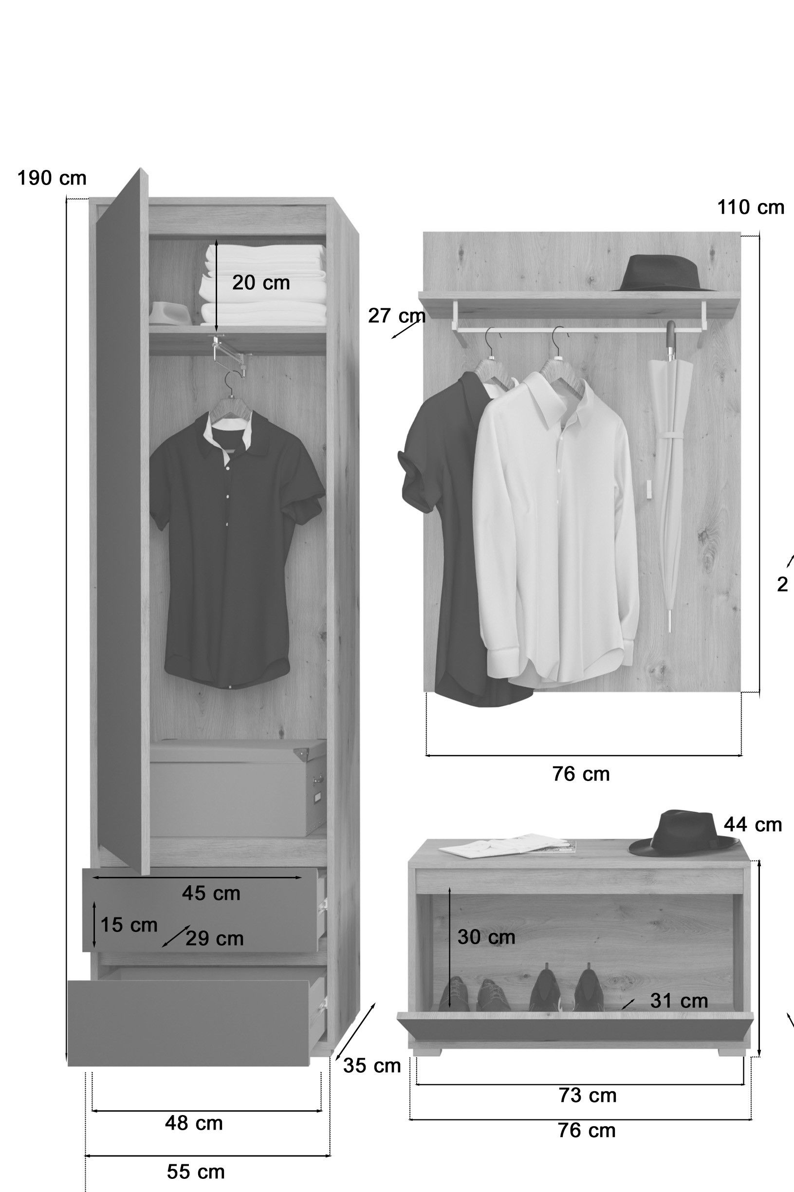 - Einsatzbereich: Die Garderobenkombination ist die ideale Lösung für den Flur, die Diele oder andere Wohnbereiche, in denen eine praktische und platzsparende Aufbewahrungsmöglichkeit für Kleidung, Schuhe und Accessoires benötigt wird. Ihr vielseitiges Design und ihre großzügigen Stauraumoptionen machen sie zu einem funktionalen Element für jeden Raum.