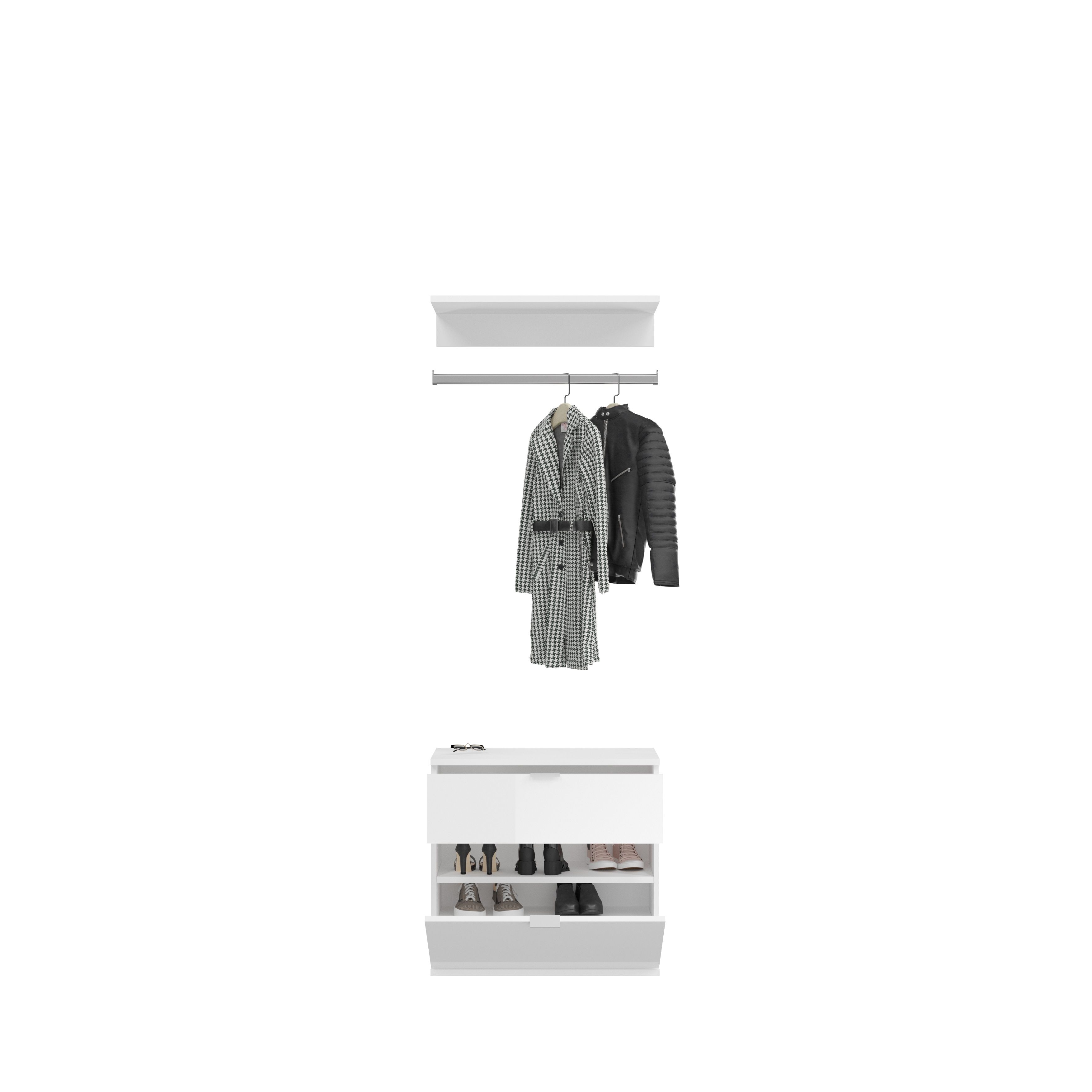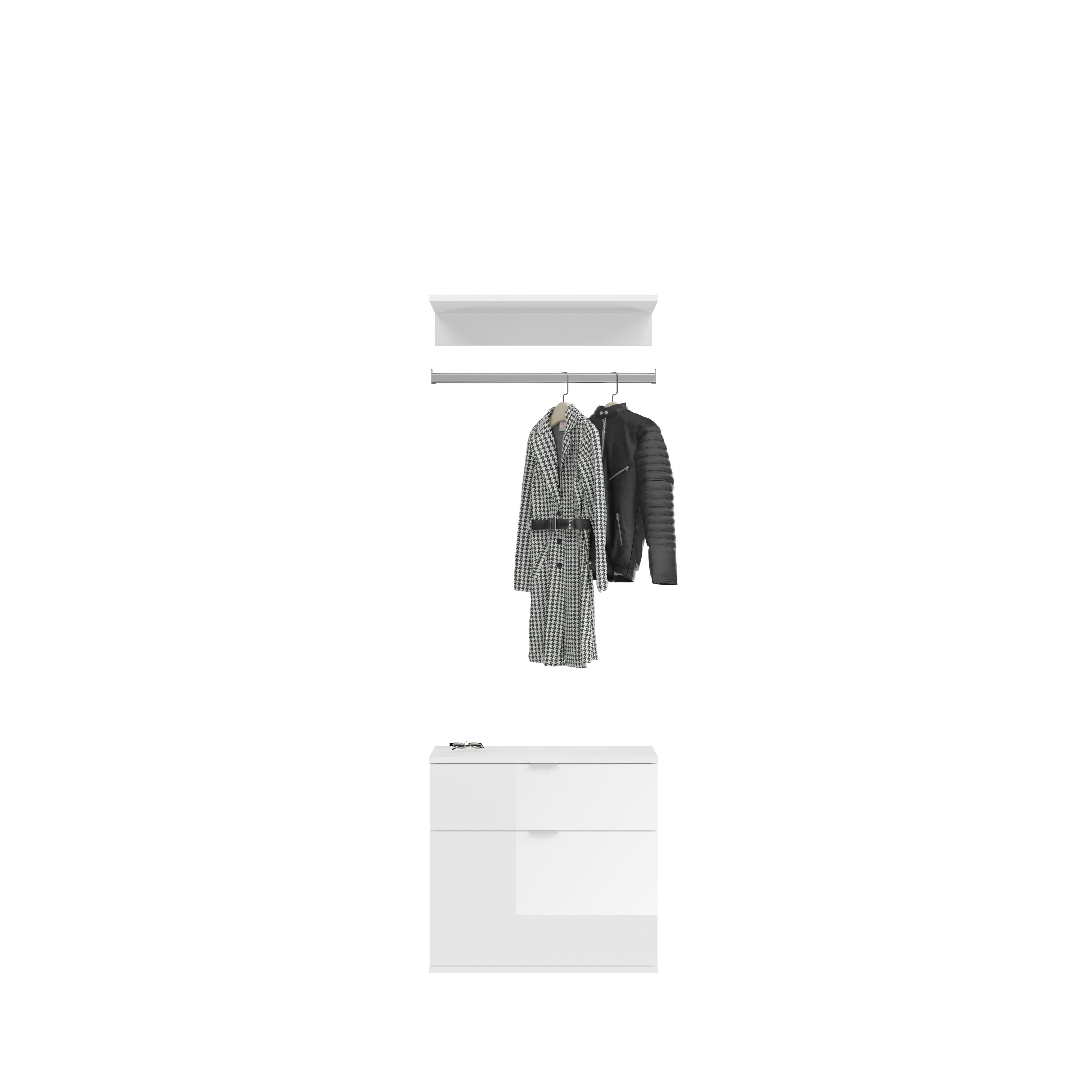 Verwandeln Sie Ihren Flur, Ihre Diele, Ihren Hauswirtschaftsraum, Ihr Büro und Ihr Schlafzimmer mit unserer multifunktionalen Kommode mit integrierter Garderobenstange. Das elegante Design in weißer Nachbildung und weißem Hochglanz verleiht jedem Raum einen modernen Touch, während Sie gleichzeitig von ausreichend Stauraum und einer praktischen Lösung zur Kleideraufbewahrung profitieren. Entdecken Sie jetzt dieses platzsparende und ästhetische Möbelstück für eine organisierte und stilvolle Raumgestaltung.