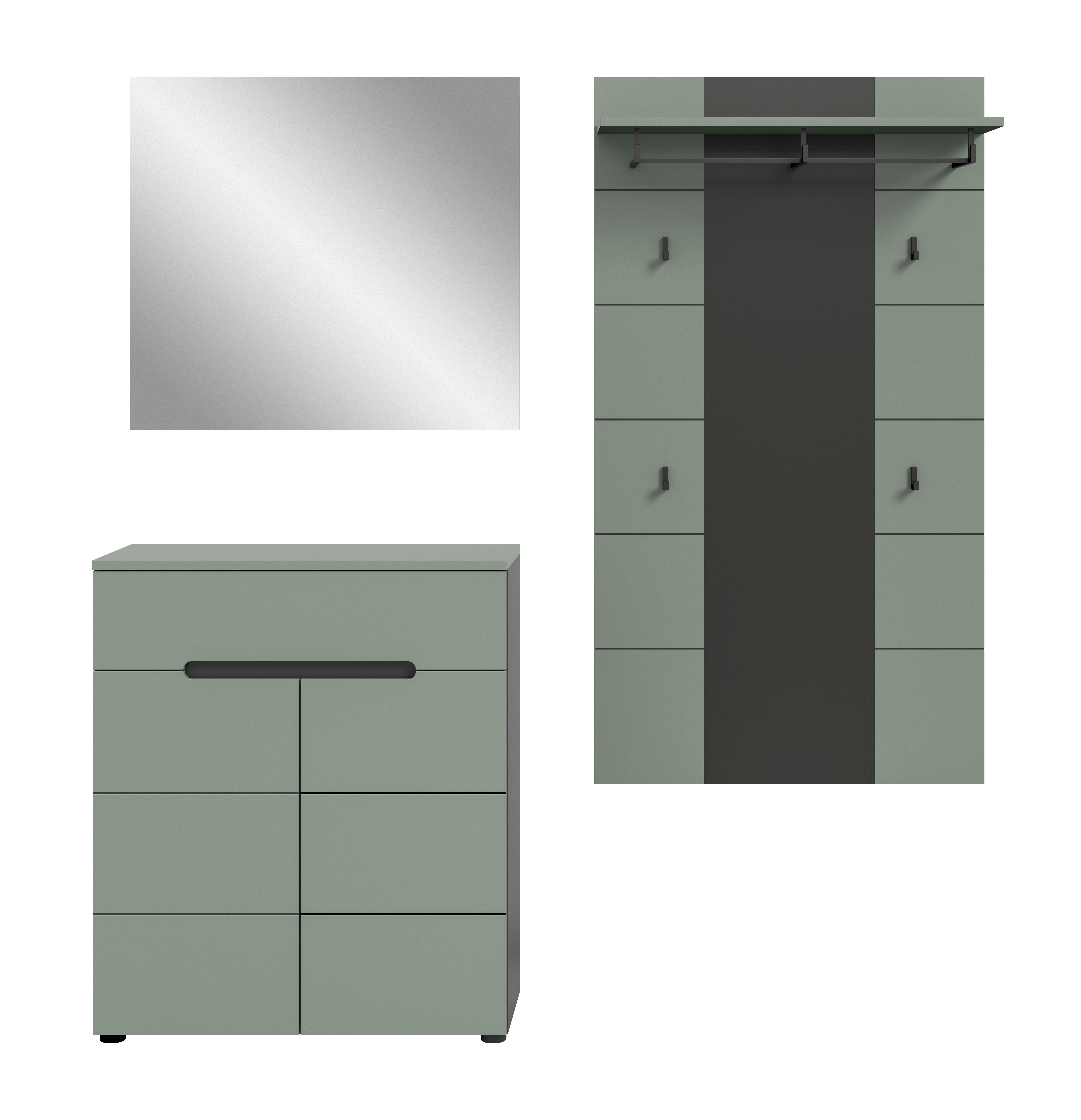 Optimieren Sie Ihren Eingangsbereich mit der Garderobenkombination (B/H/T: 175x190x37 cm) in eleganter basaltgrauer Nachbildung und Smoke Green! Diese Kombination bestehend aus einem Paneel, einer Schuhkommode und einem Spiegel bietet nicht nur praktischen Stauraum, sondern setzt auch ästhetische Akzente in Ihrem Flur. Die moderne Gestaltung sorgt für eine helle und freundliche Atmosphäre, während Sie gleichzeitig Ordnung halten. Perfekt für alle, die Stil und Funktionalität in ihrem Zuhause schätzen!