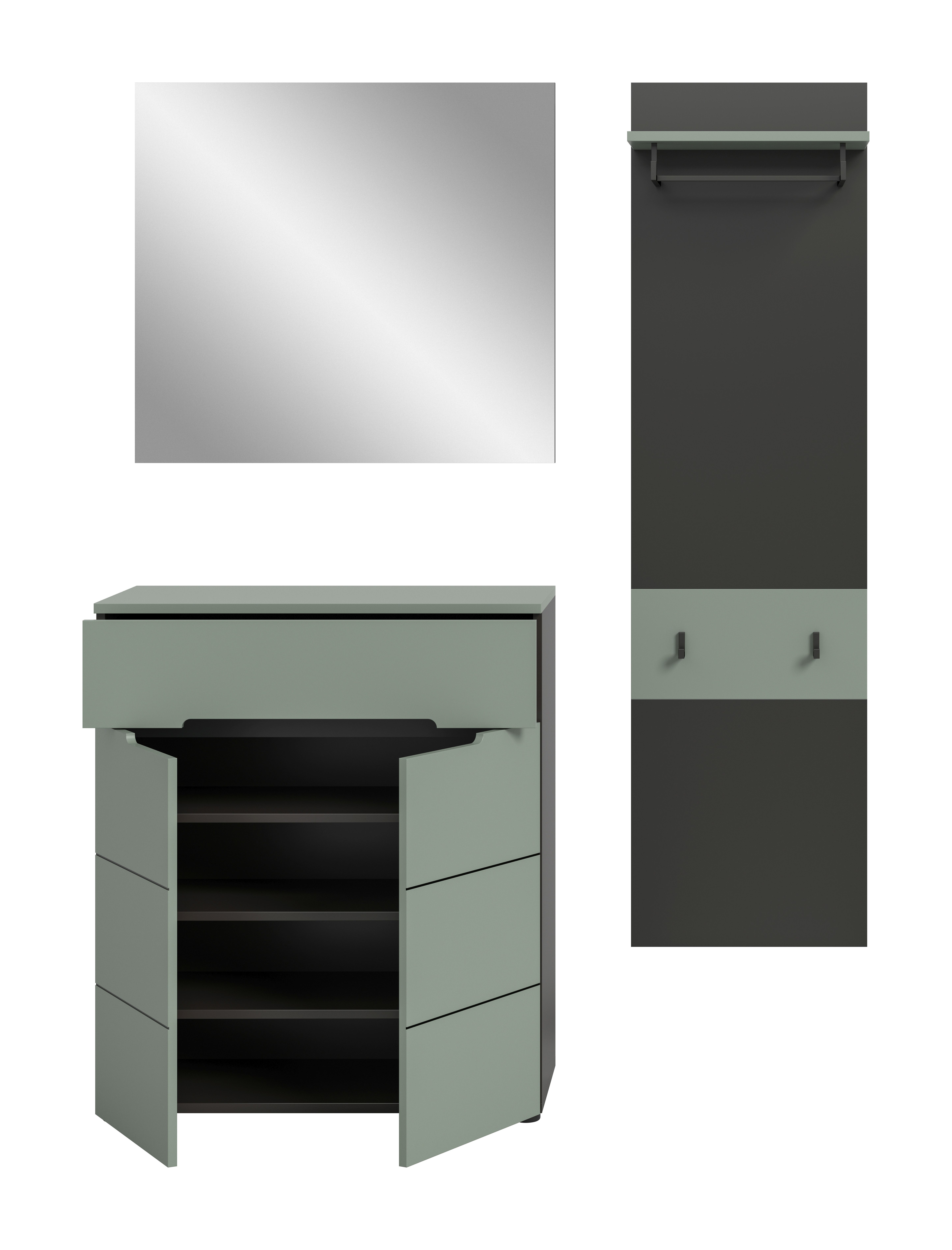 Die Garderobenkombination (B/H/T: 140x190x37 cm) in basaltgrauer Nachbildung und Smoke Green sorgt für einen organisierten und stilvollen Eingangsbereich. Dieses Set besteht aus einem Paneel, einer Schuhkommode und einem Spiegel, der Ihrem Flur einen eleganten Touch verleiht. Durch das schlichte Design fügt es sich harmonisch in jede Einrichtung ein und sorgt für eine freundliche Atmosphäre. Entdecken Sie die Verbindung von Funktionalität und Stil mit dieser idealen Garderobenkombination!