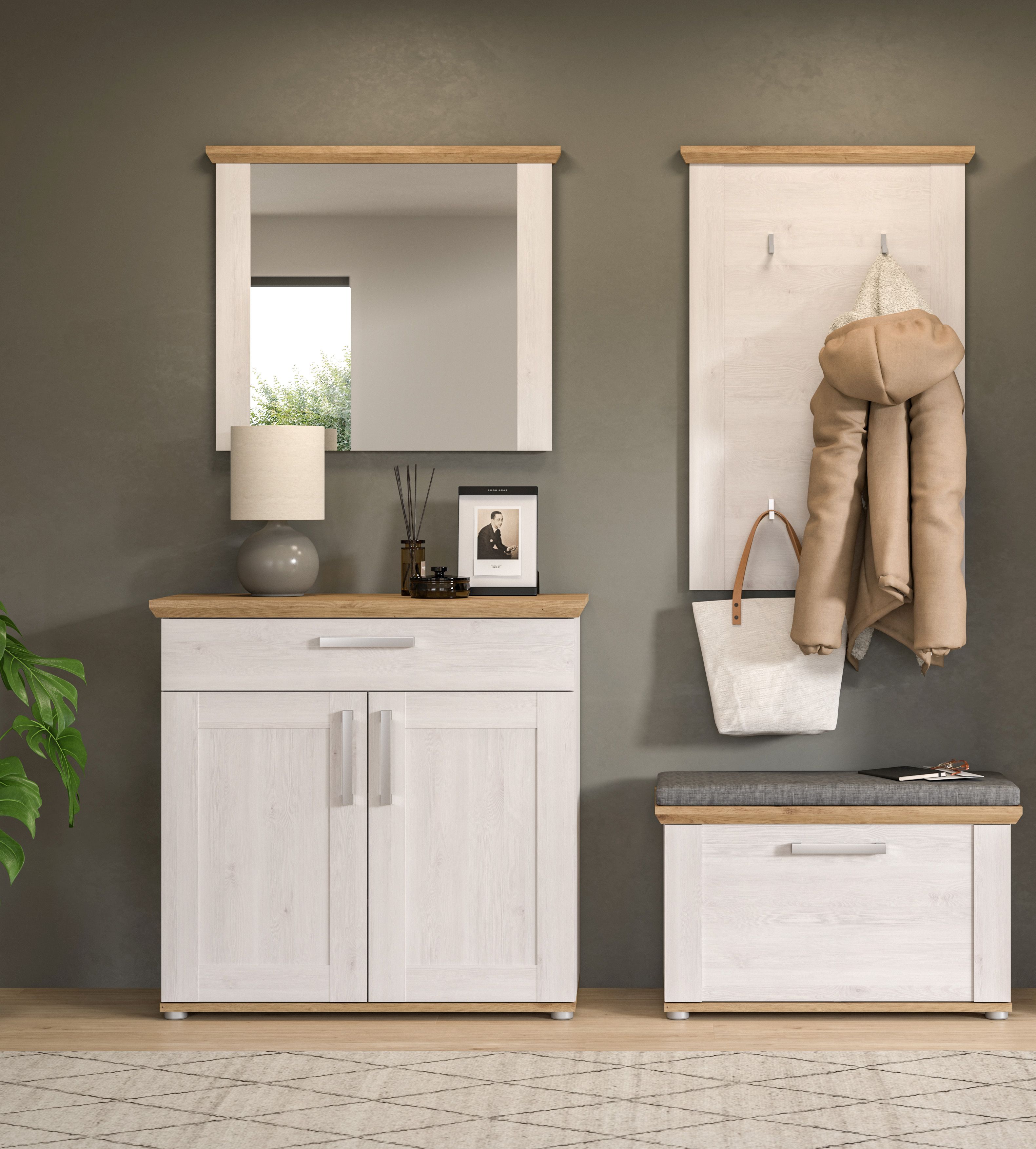 - Funktionalität: Mit großzügigen Abmessungen bietet die Garderobenkombination zahlreiche Möglichkeiten zur Aufbewahrung von Jacken, Mänteln, Schuhen und anderen Accessoires, während sie gleichzeitig Ablageflächen und Spiegel für eine praktische Nutzung des Raums bietet.