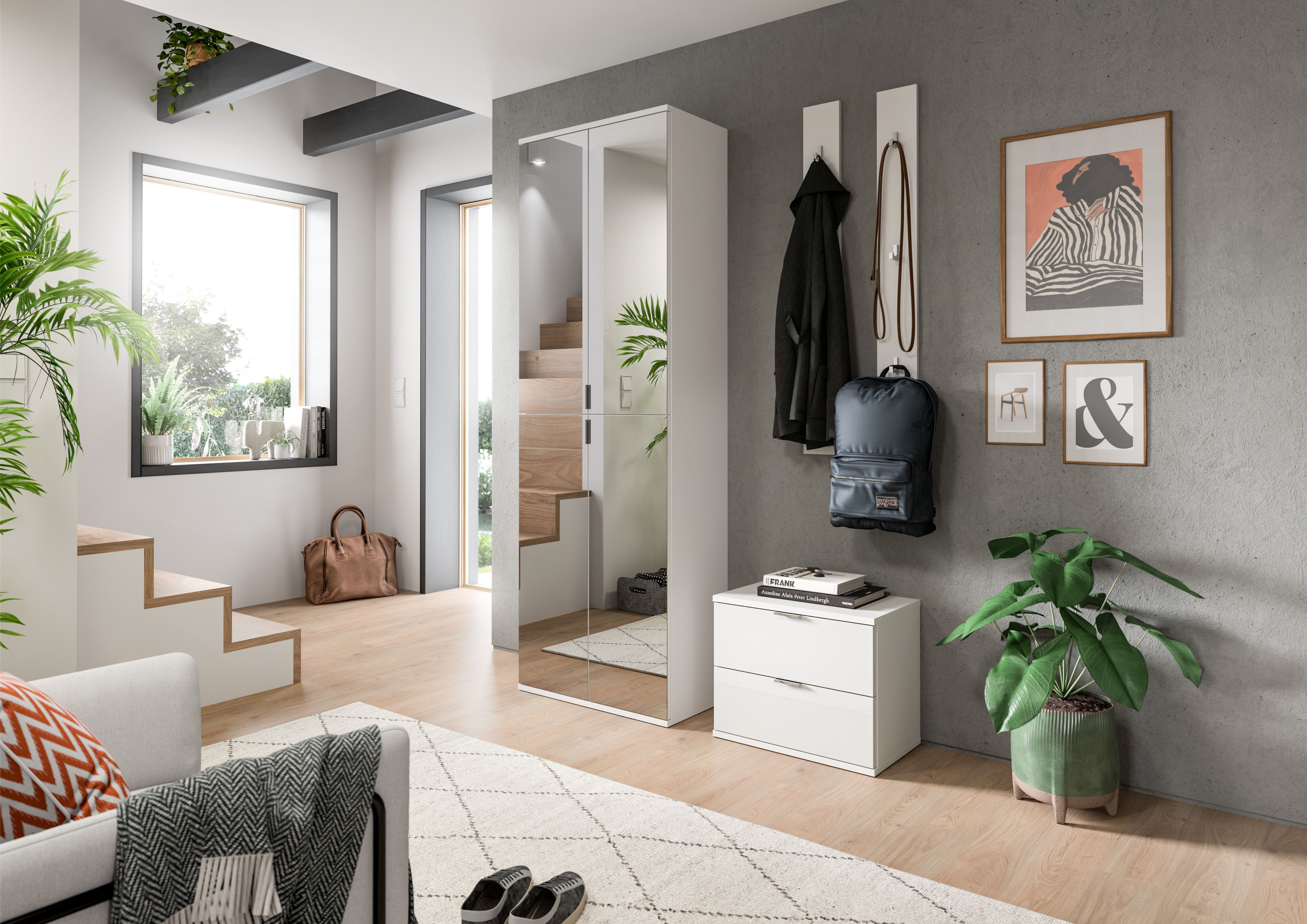 Schaffen Sie Ordnung mit unserer eleganten Garderobenkombination in Weiß Hochglanz, die mit 128 cm Breite, 191 cm Höhe und 37 cm Tiefe ideal für jeden Eingangsbereich ist. Das Set besteht aus einer bequemen Sitzbank/Kommode, einem praktischen 2er Set Paneel und einem stylischen Spiegelschrank. Diese Kombination maximiert den Stauraum und bietet gleichzeitig Platz zum Sitzen, sodass Sie bequem Ihre Schuhe anziehen können. Die glänzende Oberfläche fügt eine moderne Note hinzu und reflektiert das Licht, um eine einladende Atmosphäre zu schaffen.