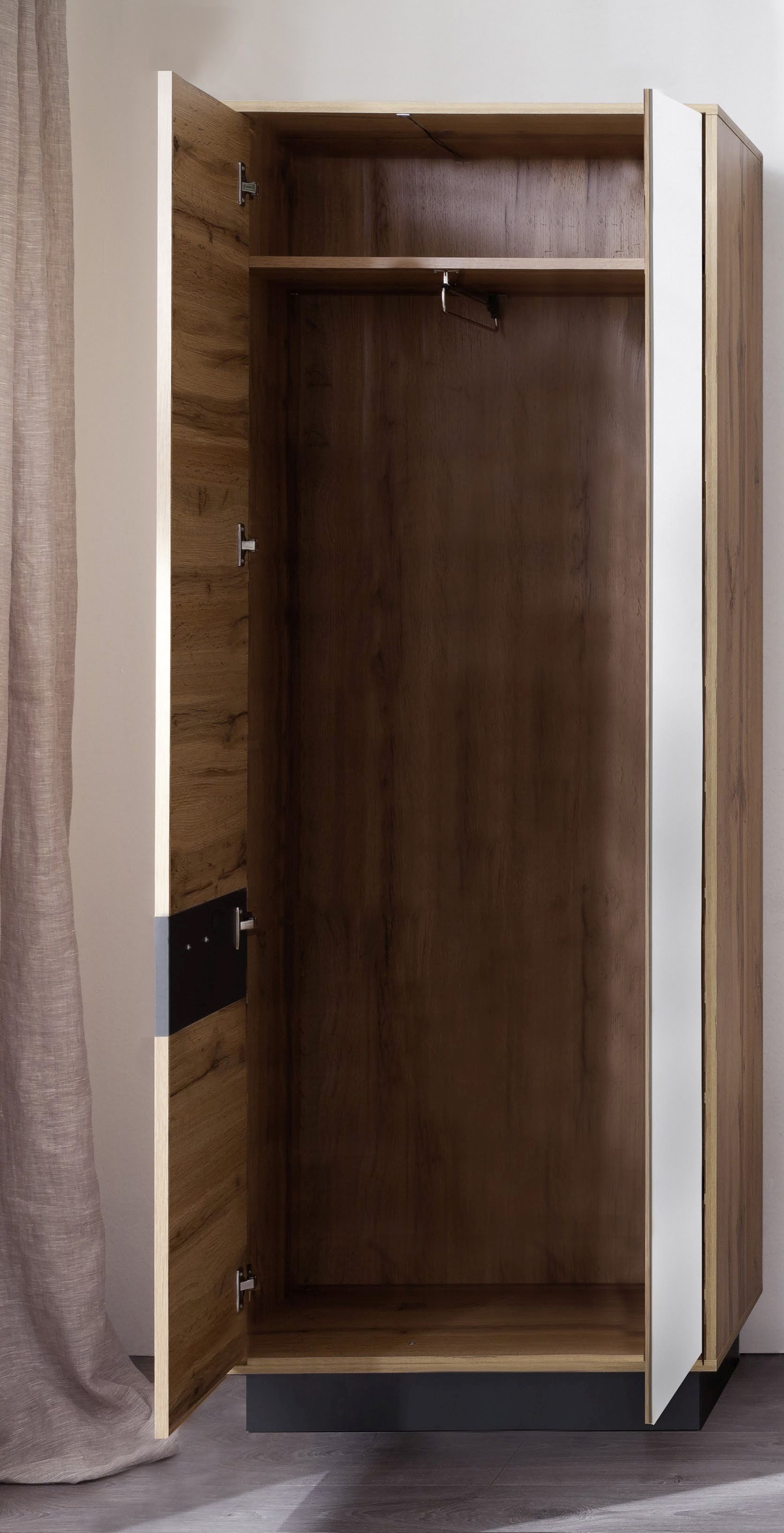 1 Garderobenschrank mit 2 Türen (davon 1 Tür mit Spiegel), 1 Fachboden und 1 ausziehbare Kleiderstange